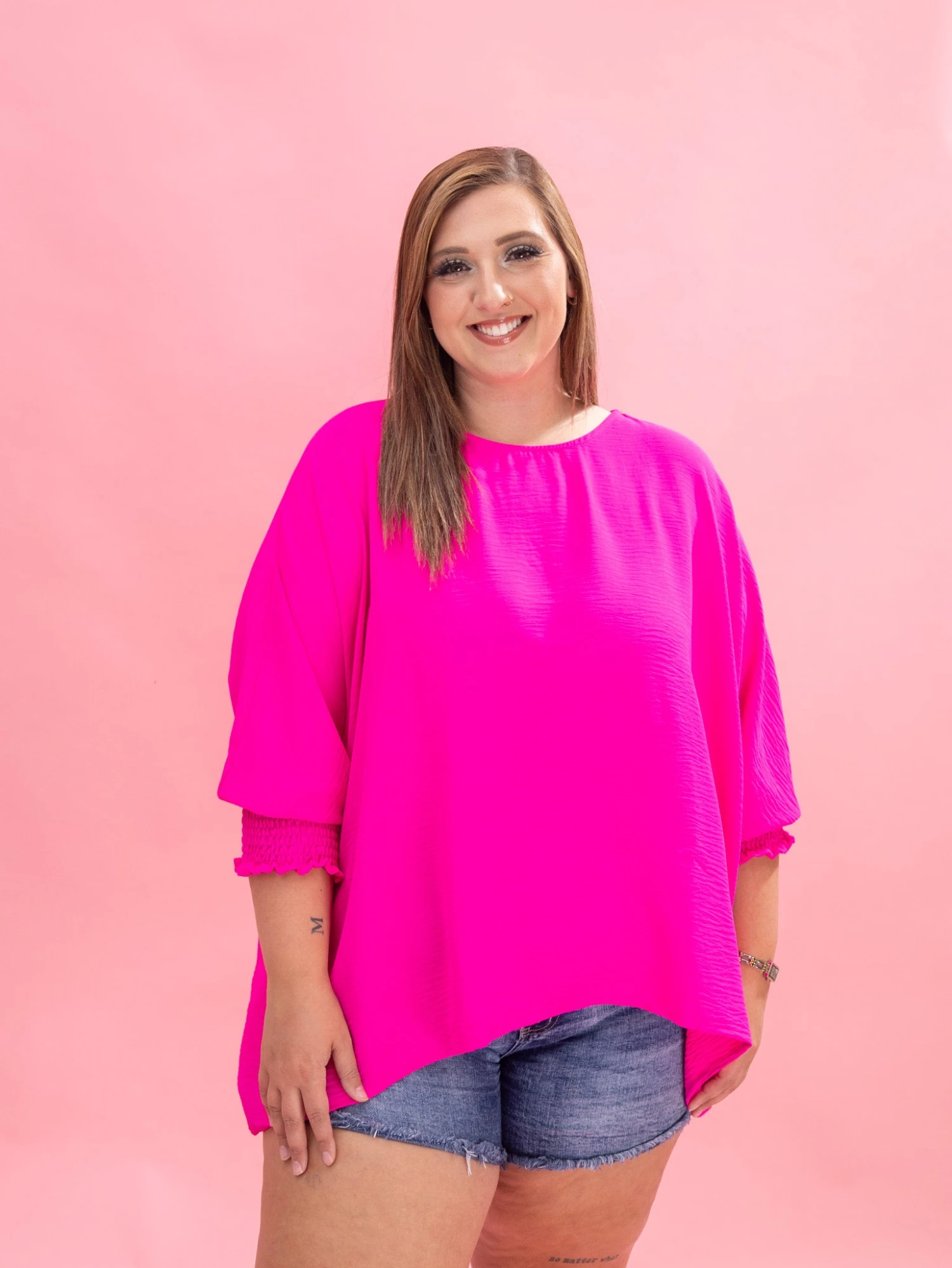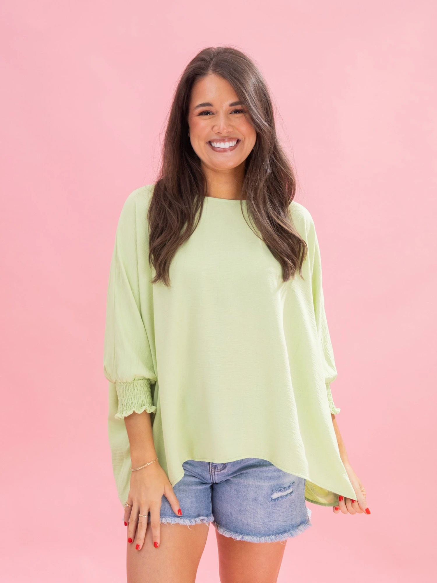 Features: Round Neck, Dolman Smocked Sleeves, Oversized Airflow Top
