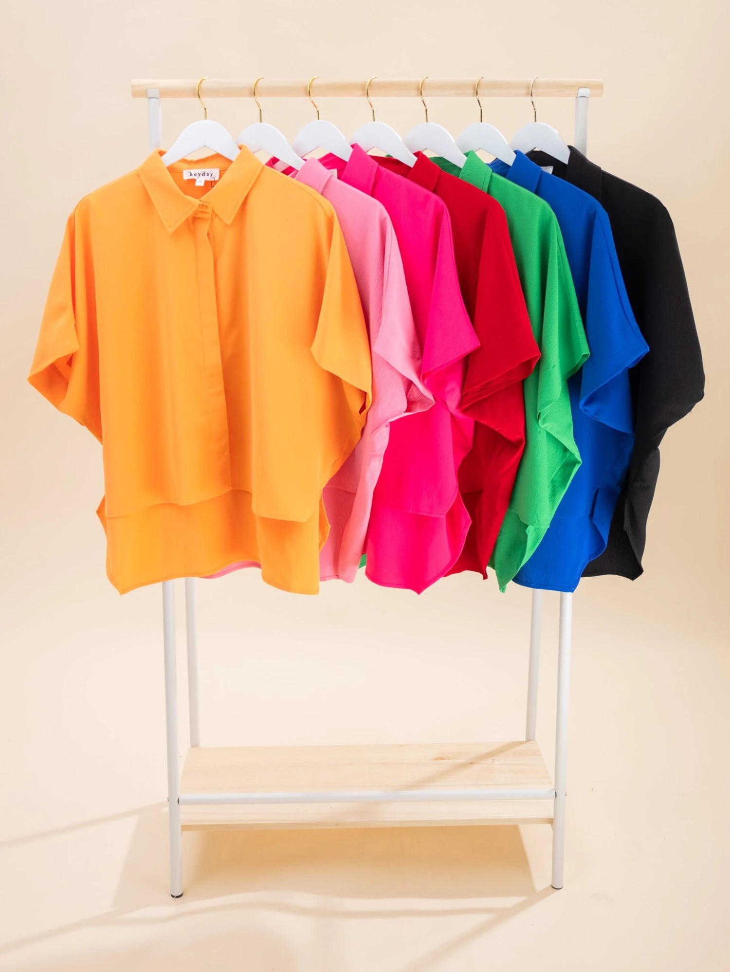 Features: Collar, Hidden Button Up, Dolman Sleeves, Hi Lo Hem, Solid Oversized Blouse
