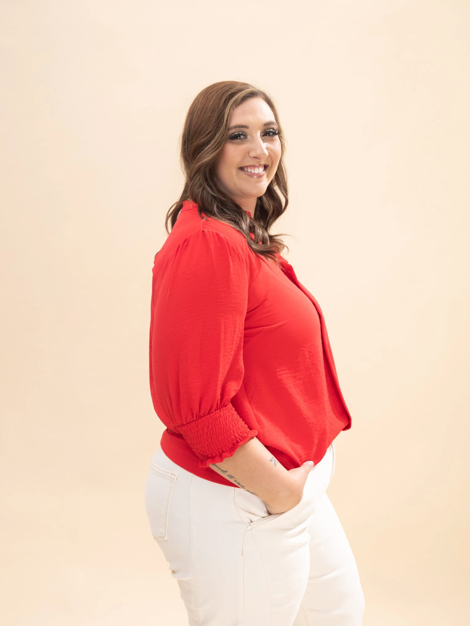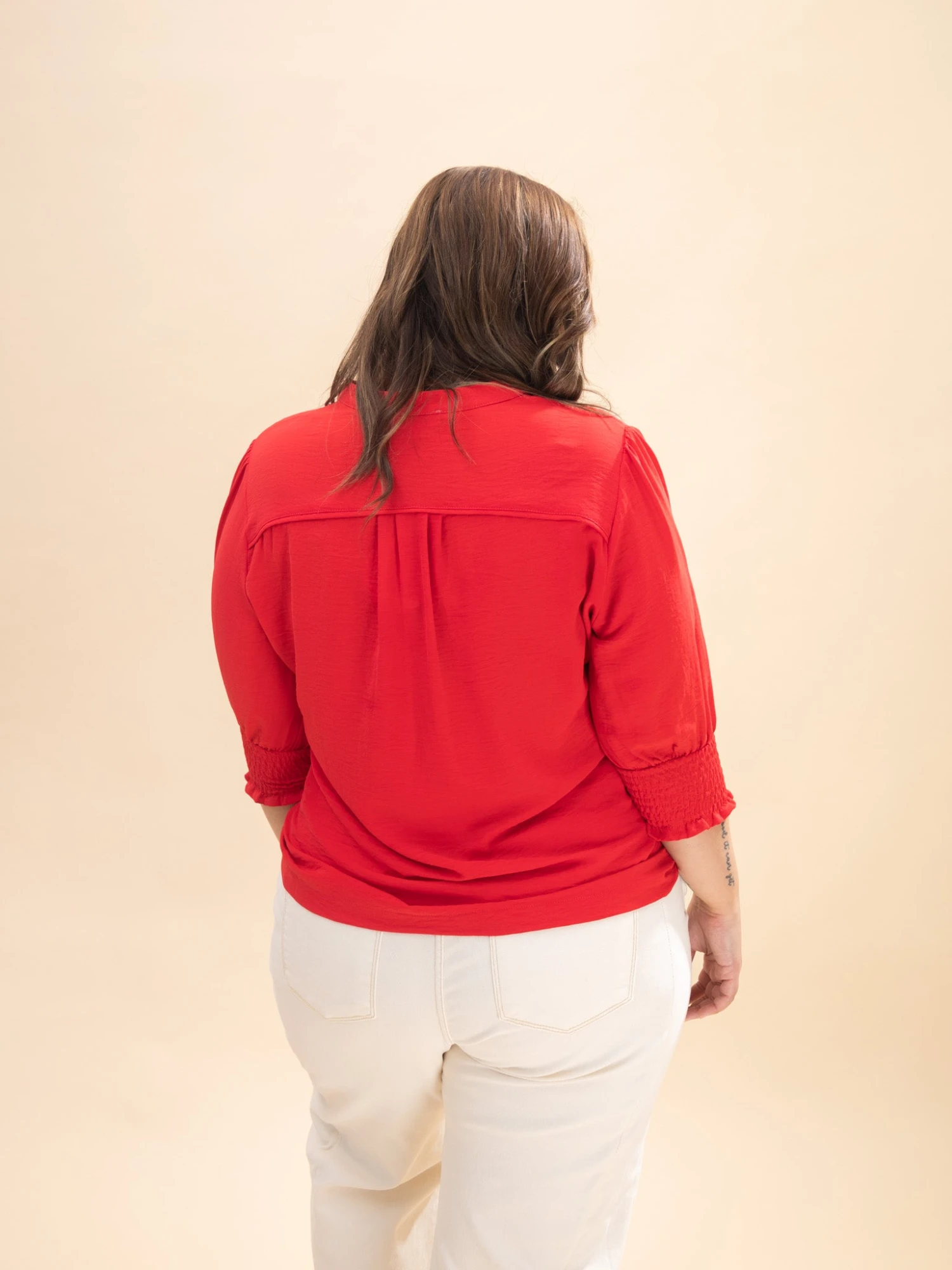 Features: Split Neck, 3/4 Sleeves, Solid Top