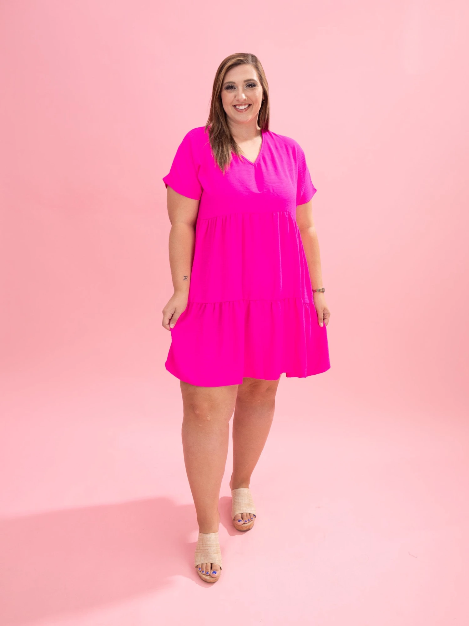 Features: V Neck, Short Sleeves, Pockets, Airflow, Tiered, Knee Length