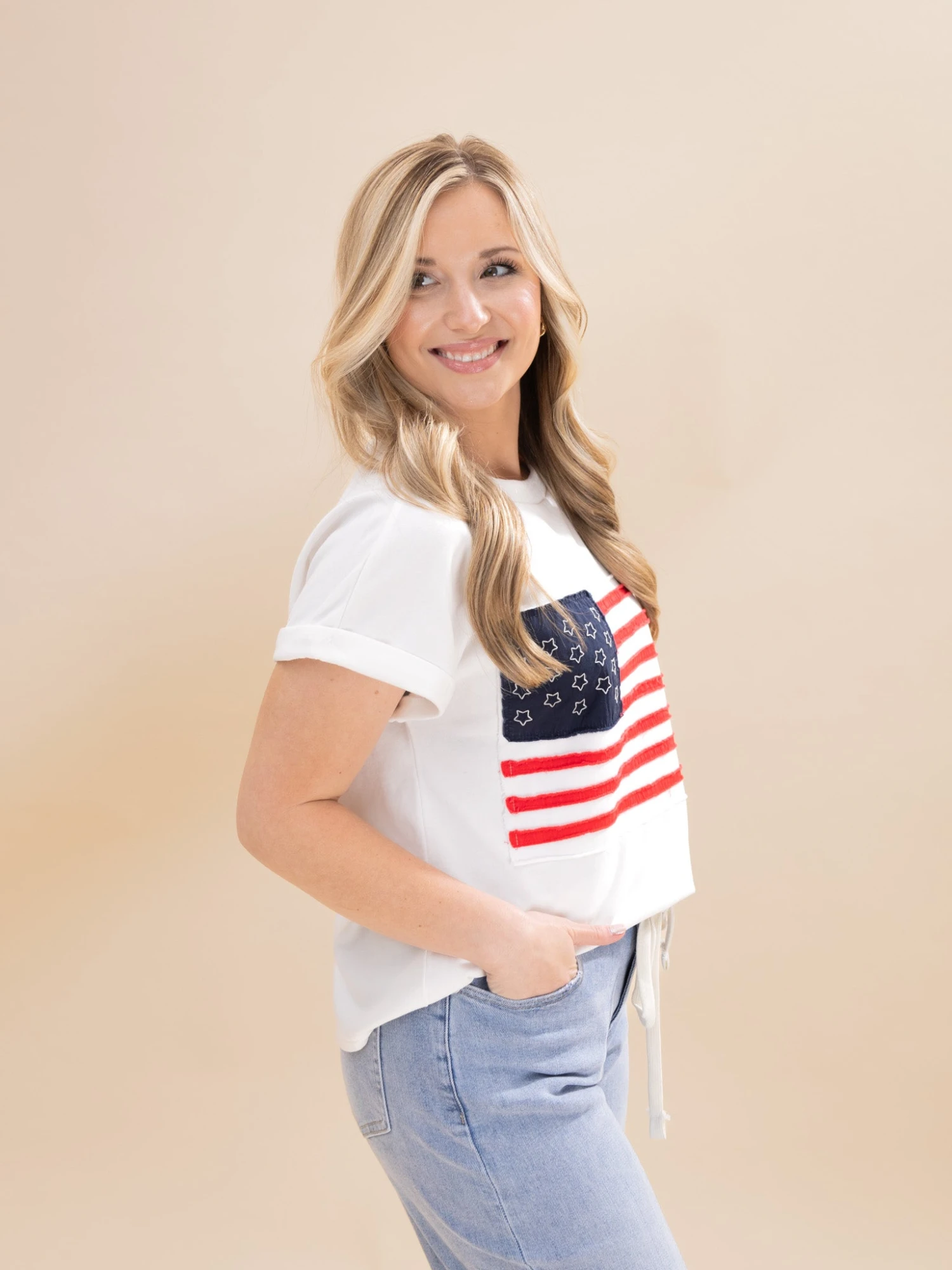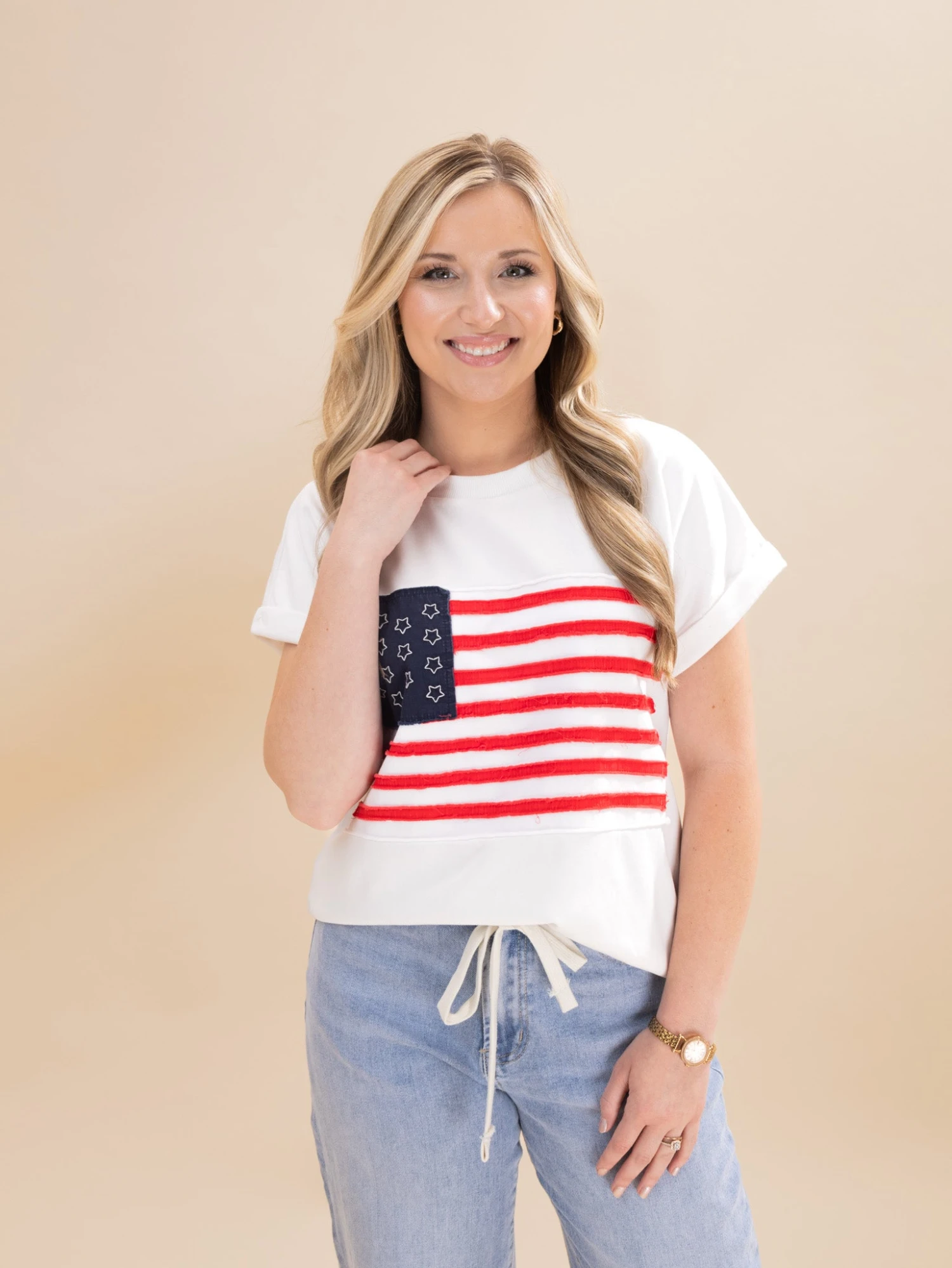 Features: Round Neck, Capped Sleeves, American Flag Top