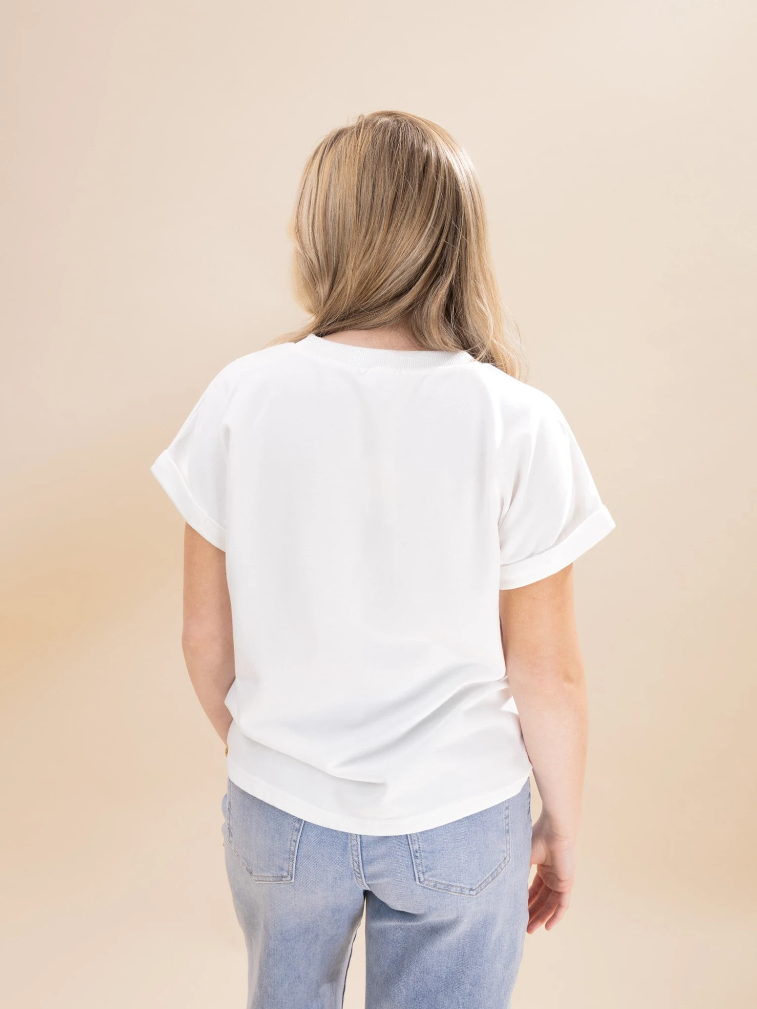Crimsen (long blonde hair) is 5’1, 34B bra, typically wears size S in tops and 3 in denim. Wearing size S