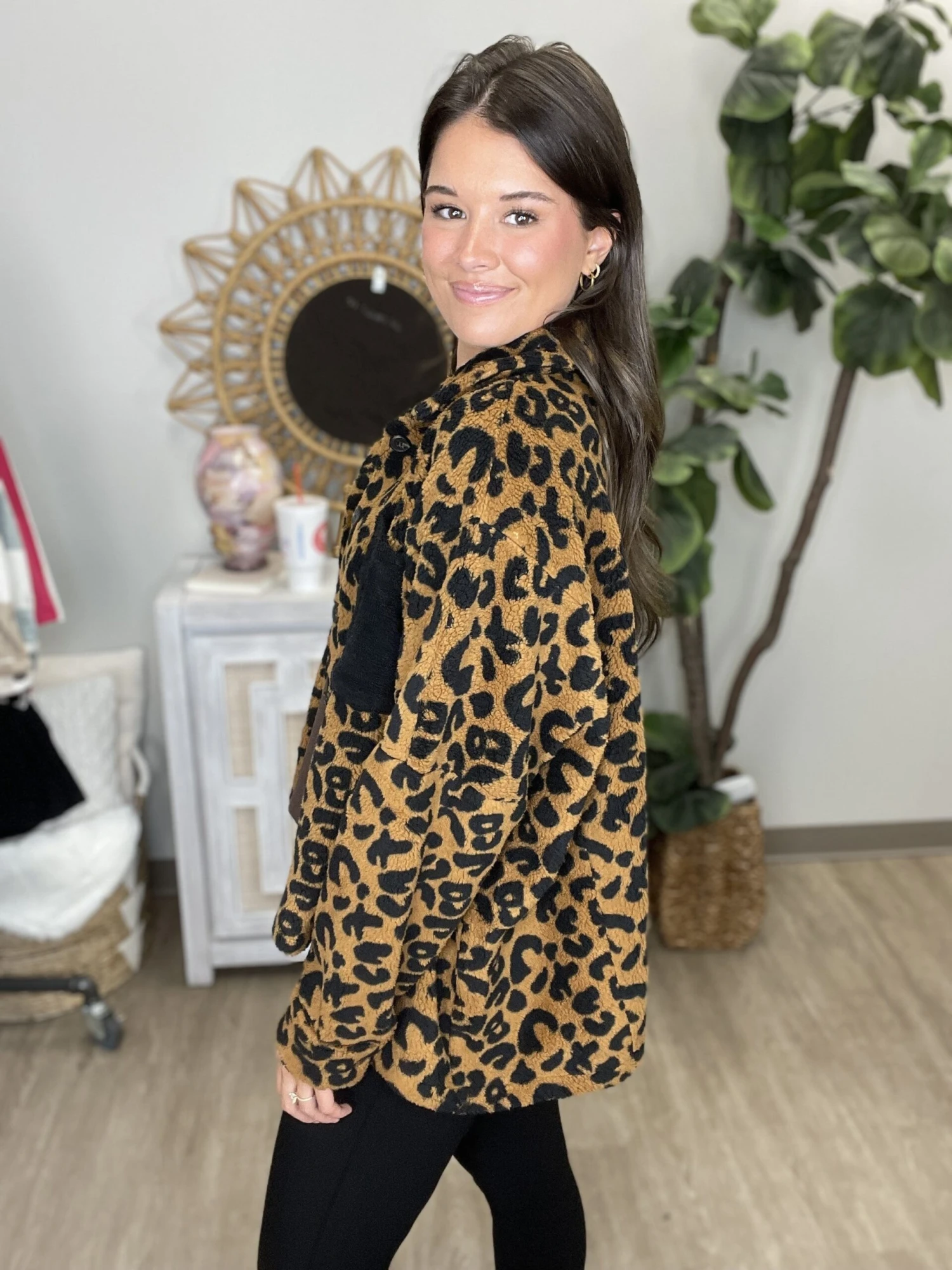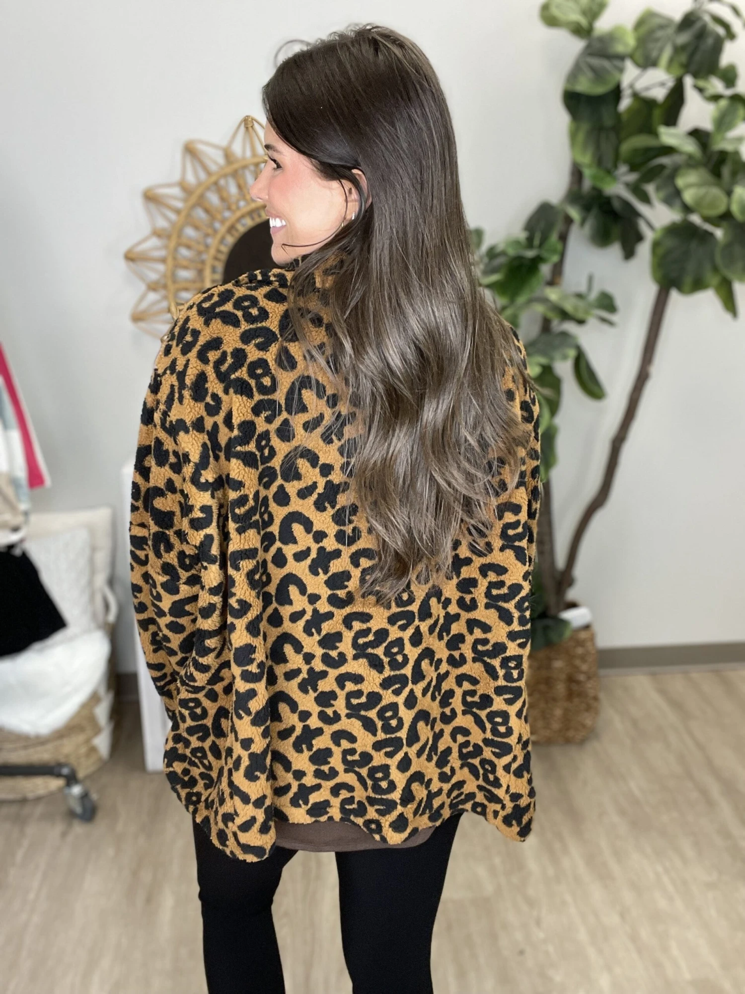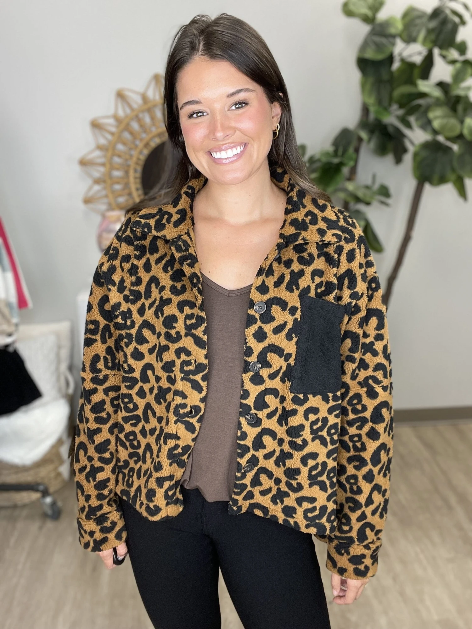 Find your roar with this great animal print sherpa jacket! We love how cozy this sherpa jacket is! Get yours now!