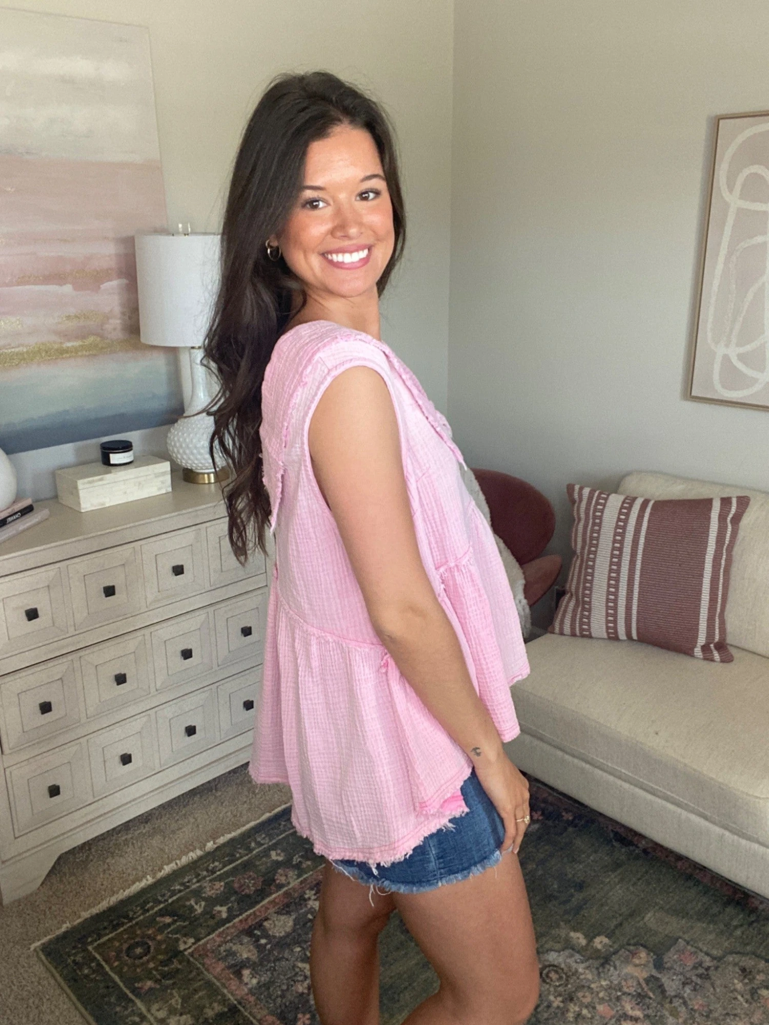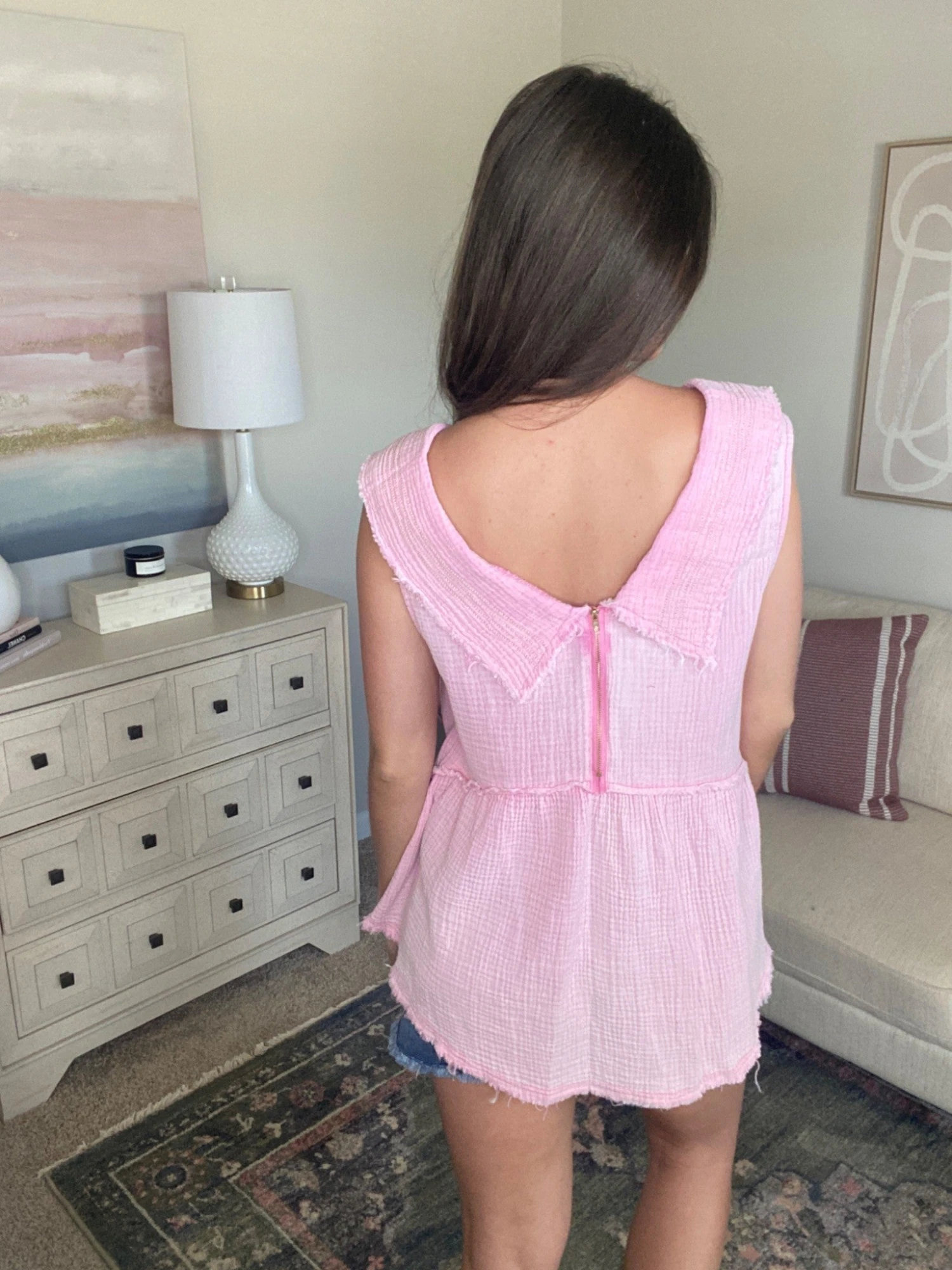 Features: sleeveless, v-neck, back zipper detail, Distressing detail
