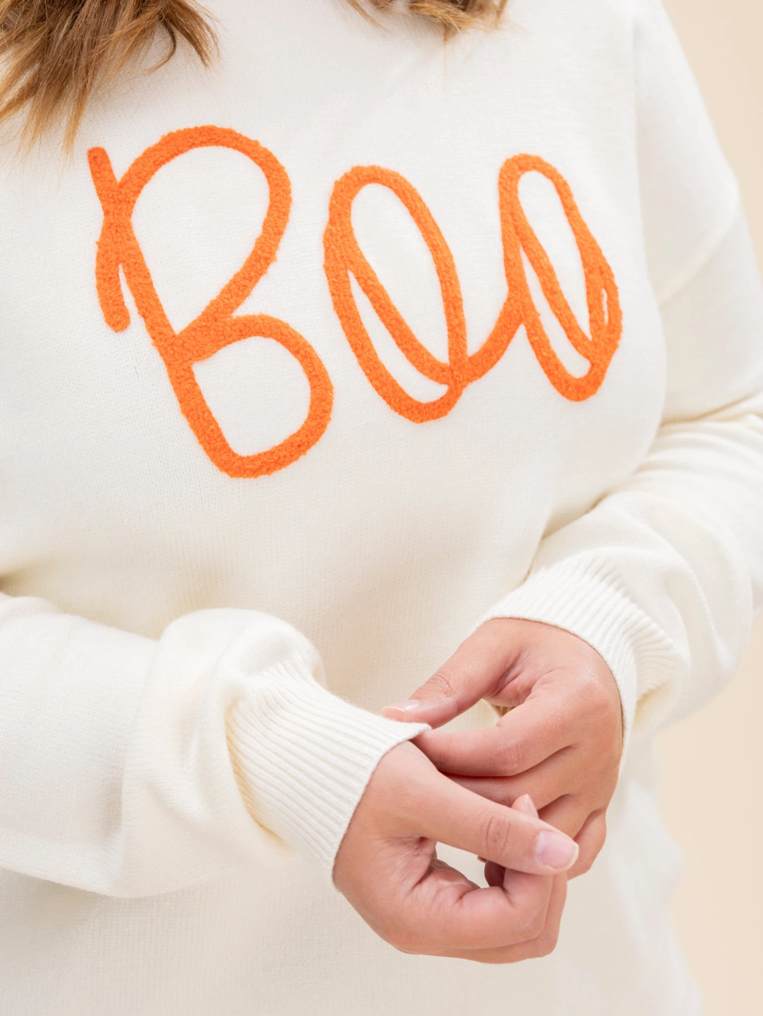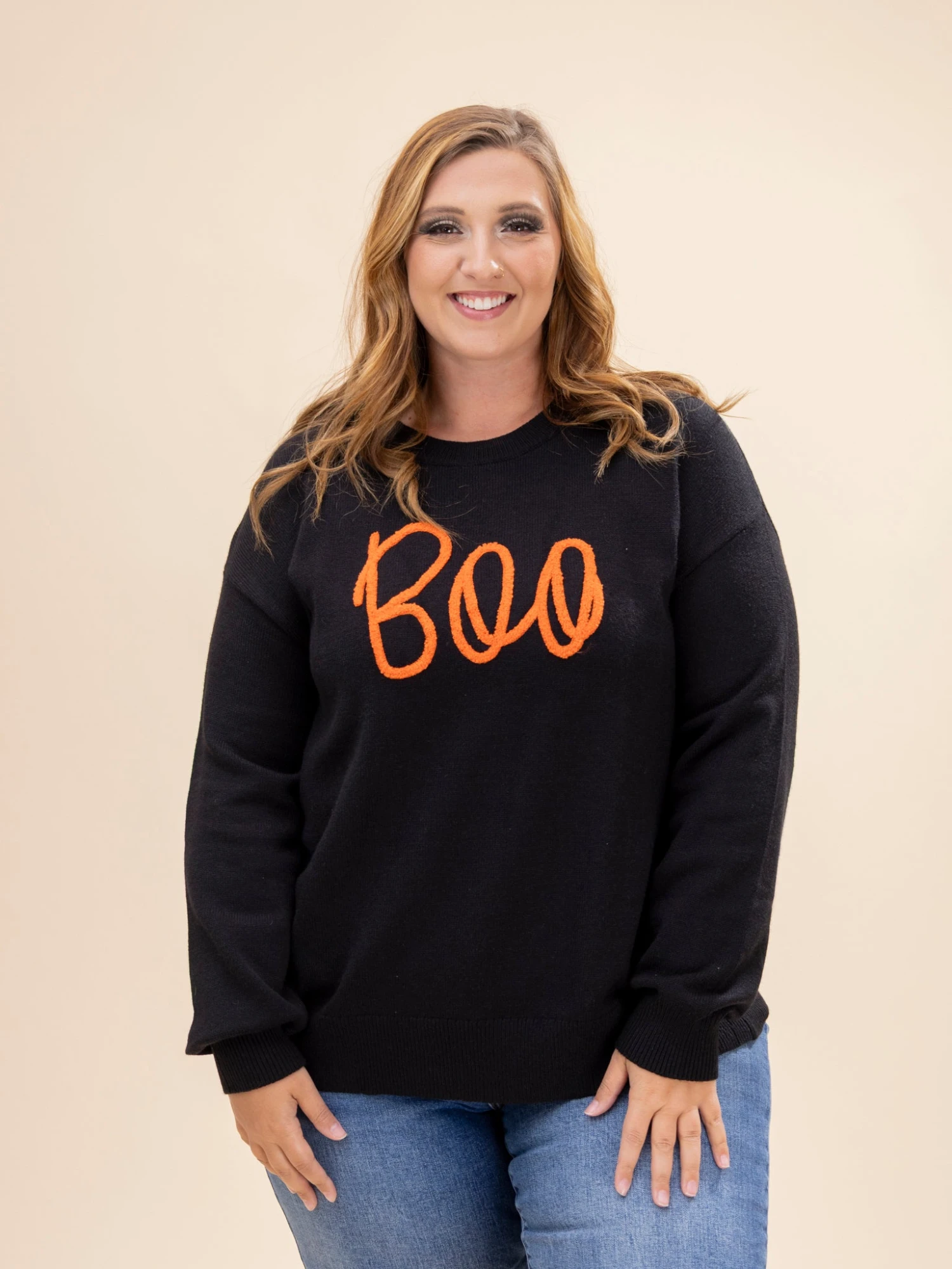 Features: Round Neck,Long Sleeves,Boo Pattern Halloween Sweater