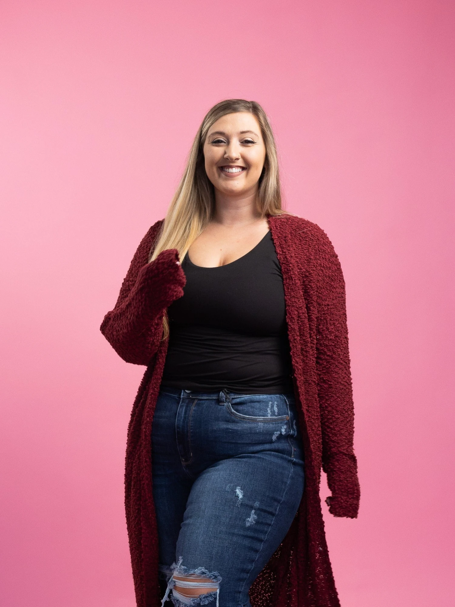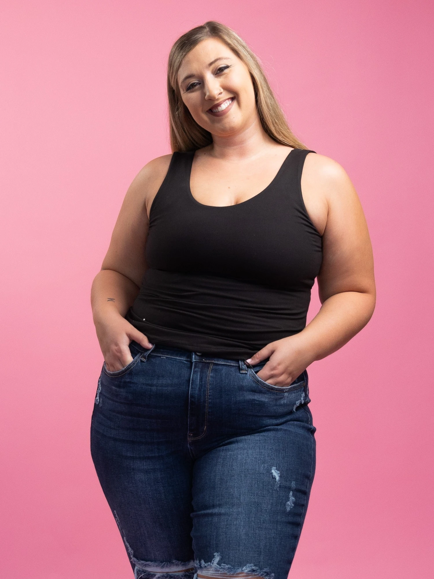 Erin is 5’9, typically 14-16 in denim, Large-X-Large in tops, 36C bra. Wearing size XL