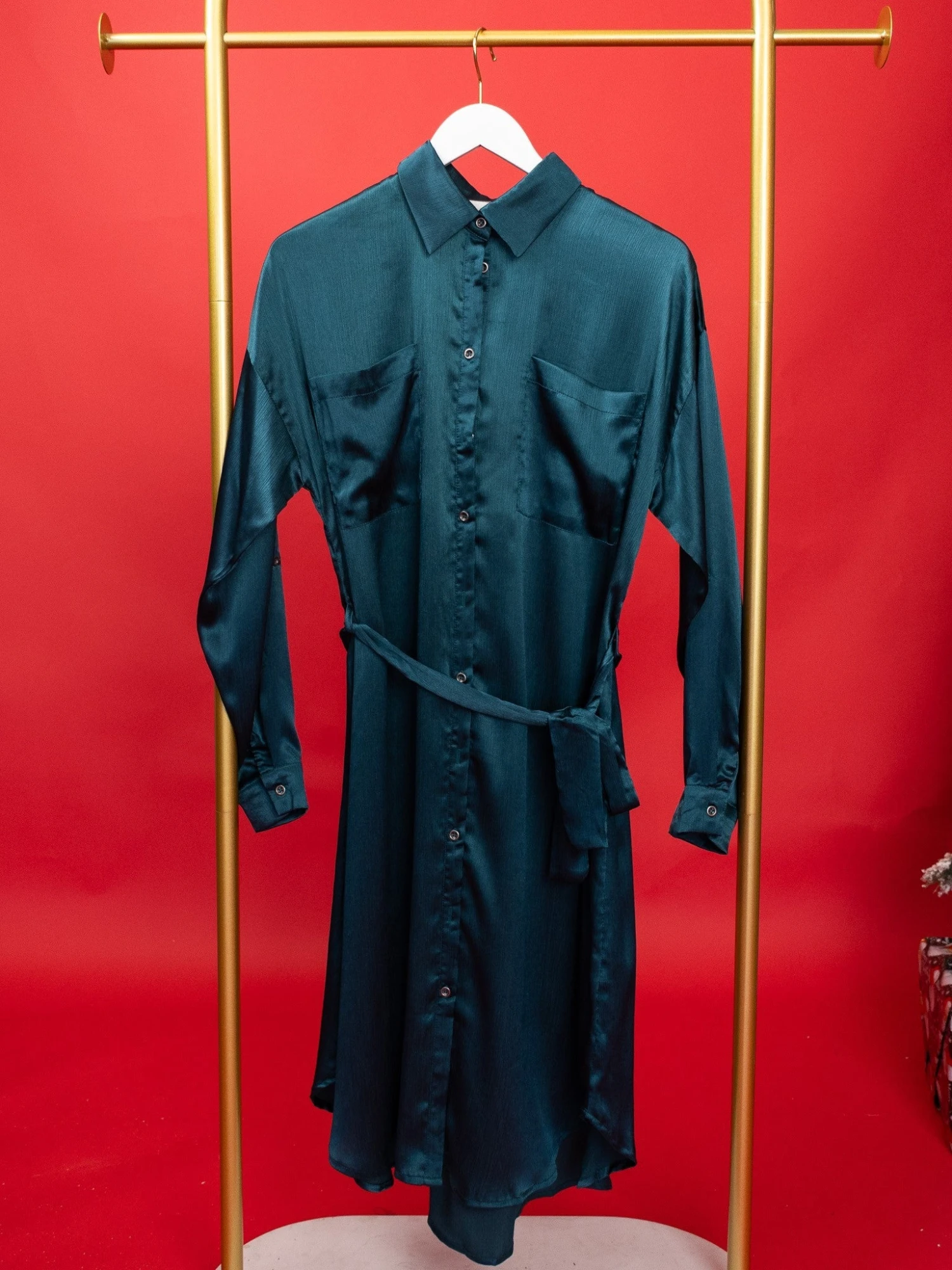 Features: Long Sleeve, Collar, Button Down, Tied Belt, Chest Pockets