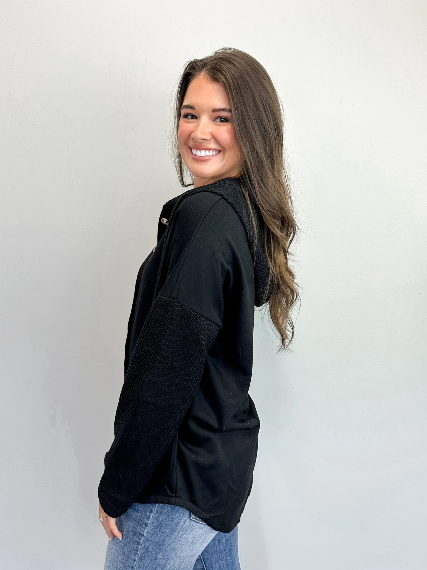 Features: Knitted Long Sleeves, Button Down, Drawstring Hood
