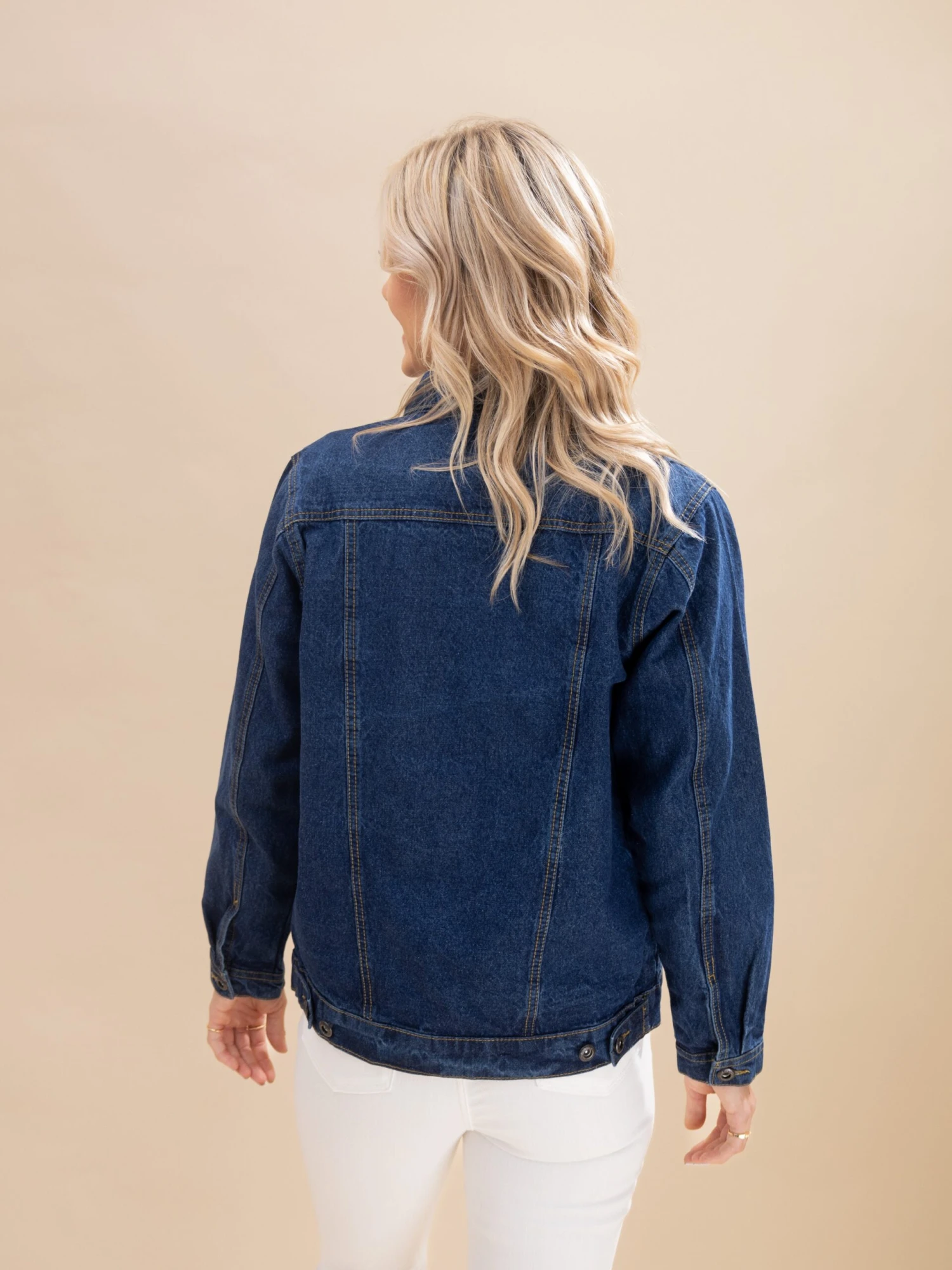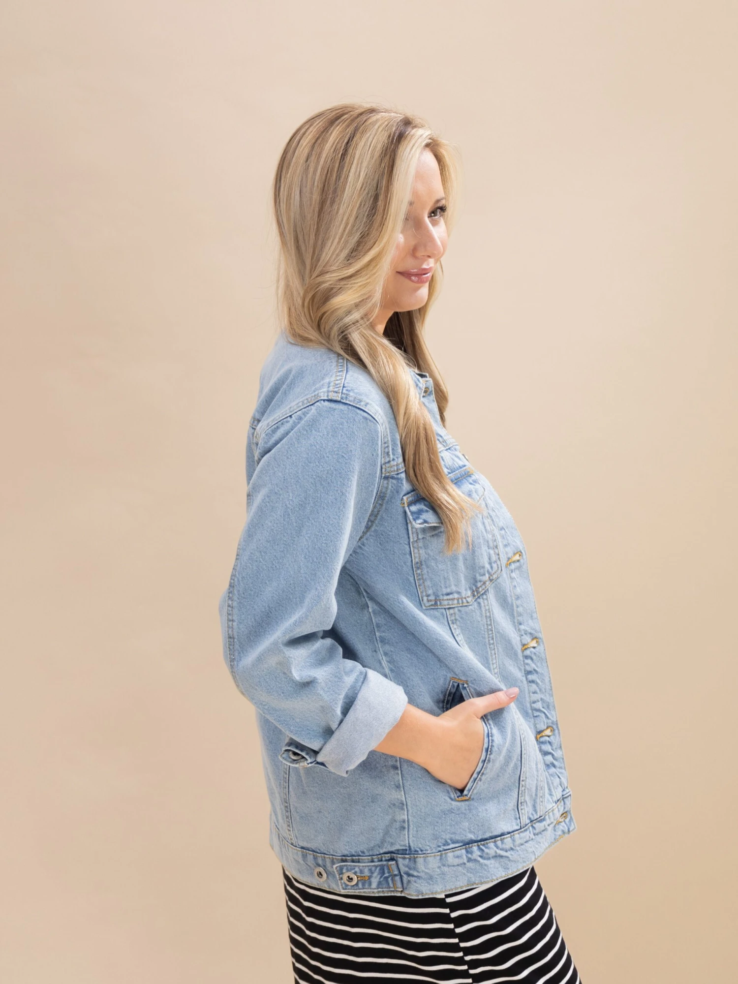 Crimsen (long blonde hair) is 5’1, 34B bra, typically wears size S in tops and 3 in denim. Wearing size S