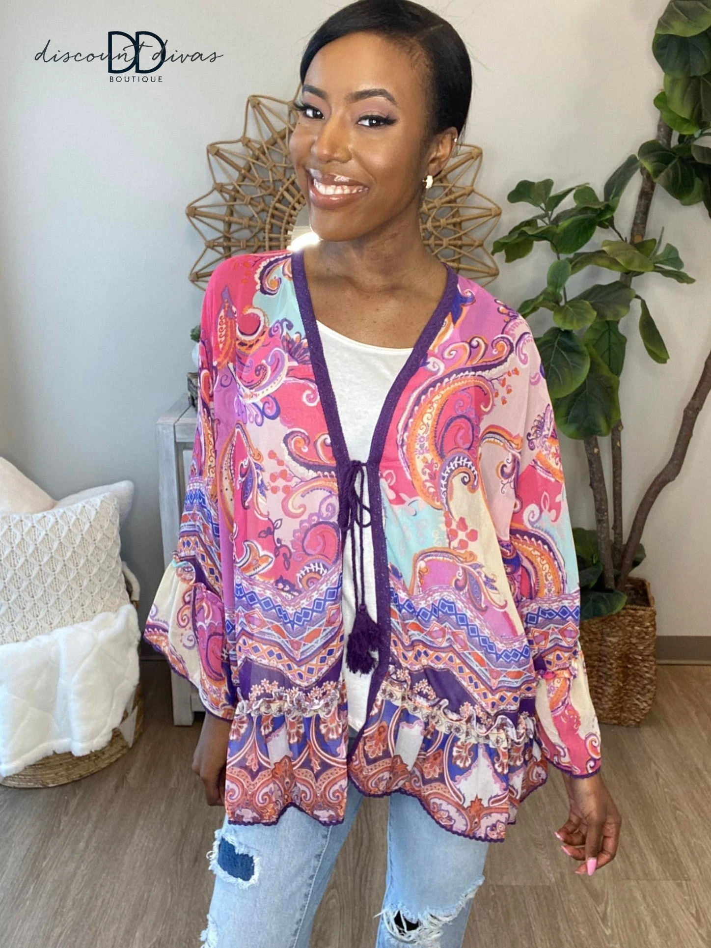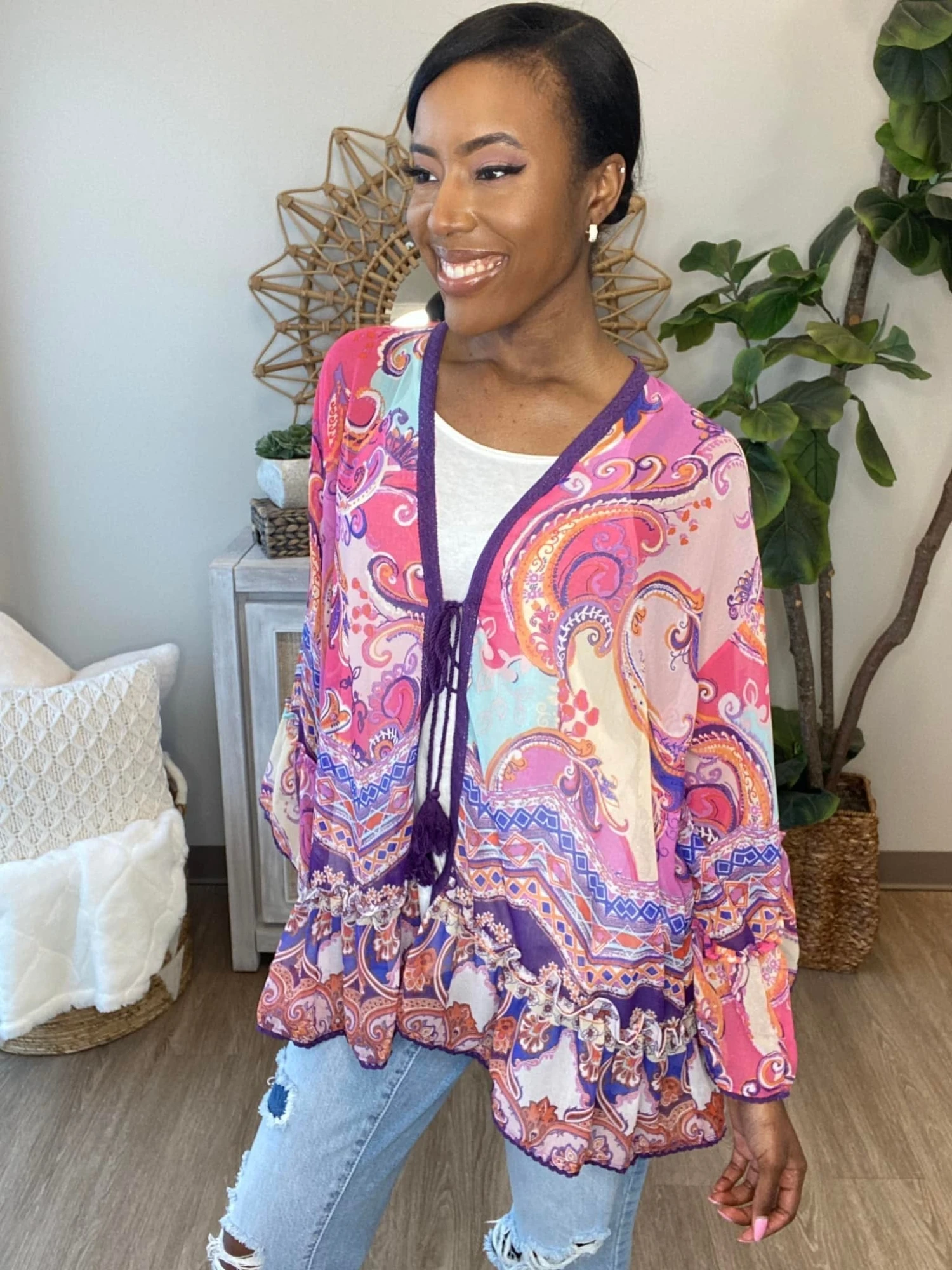 The “Change My Heart Top” has arrived! This open front top with a tassel tie is a must have! With ruffle sleeves and a gorgeous pattern, you do not want to miss out here! Snag one before they sell out!