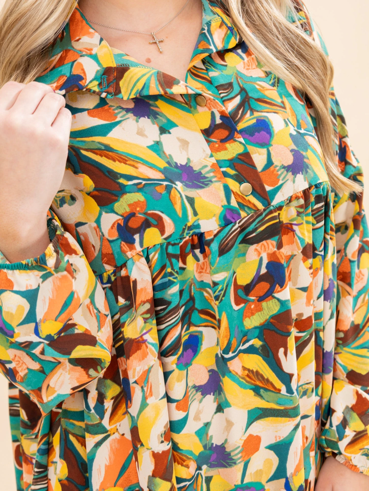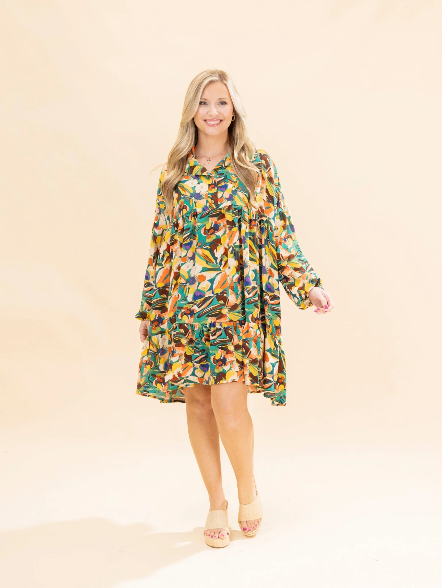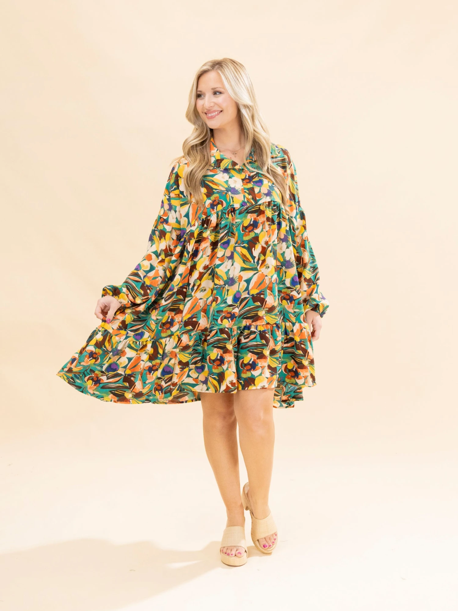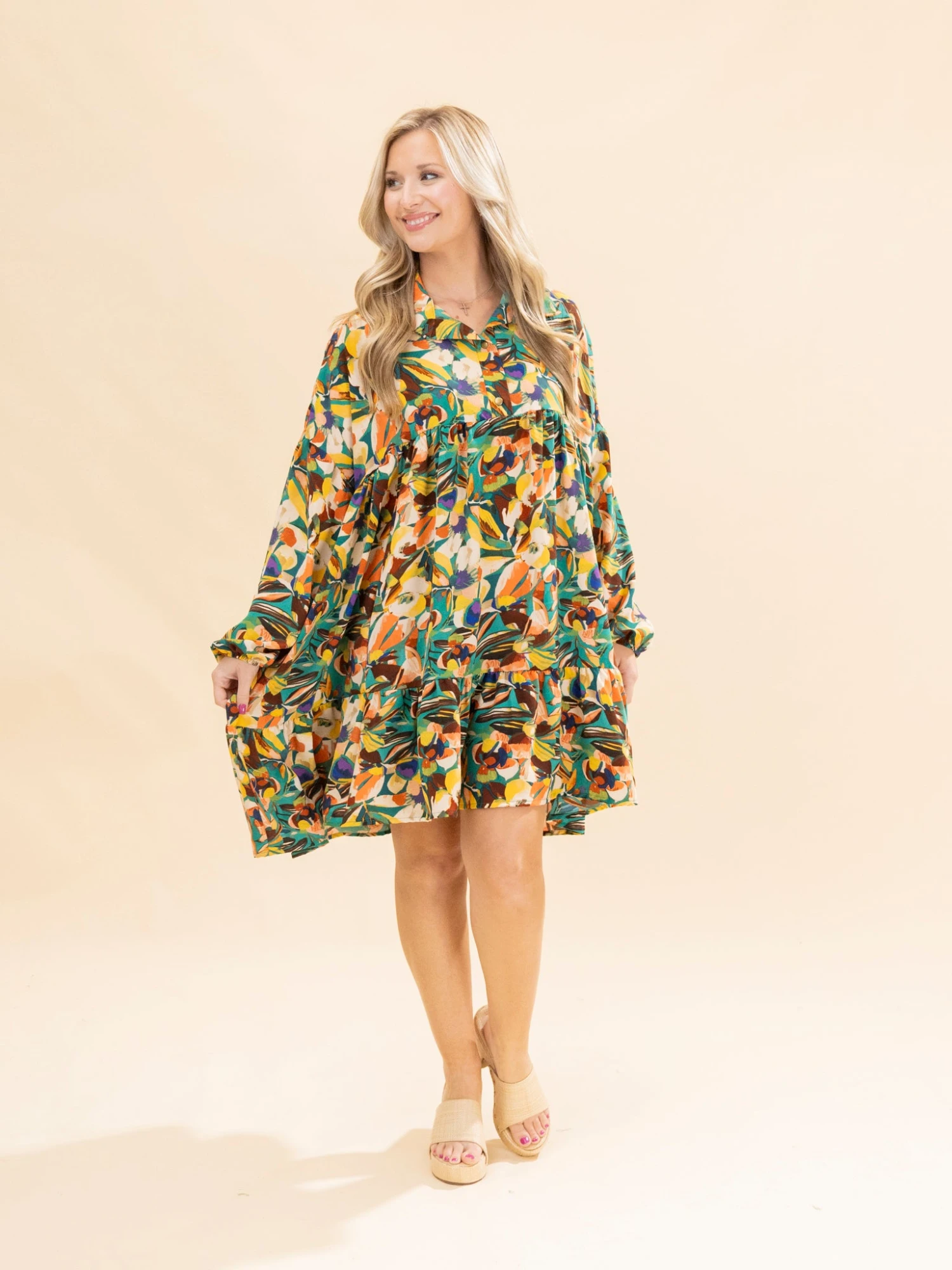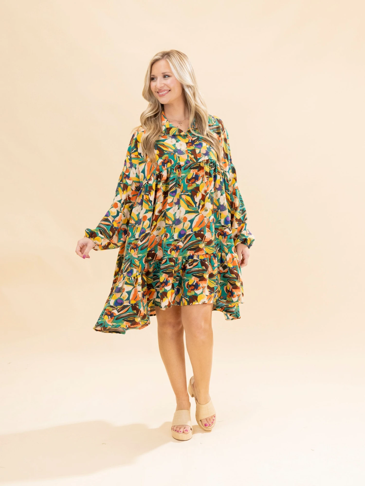 Features: Collared W/ Buttons, Long Sleeves, Pockets, Ruffle Hem, Oversized Floral Printed Babydoll Dress