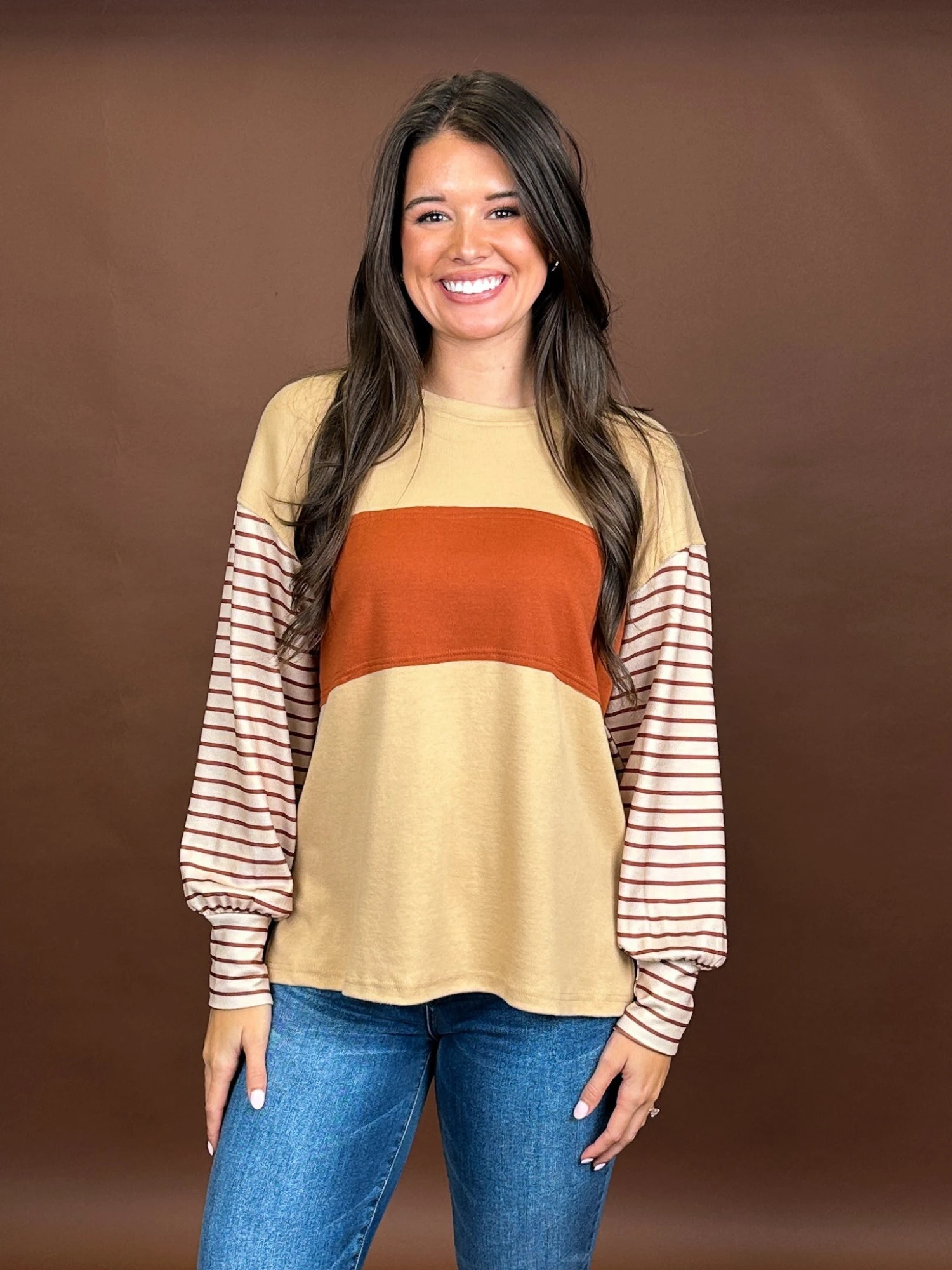Features: Long Sleeves, Round Neck, Striped, Color Block