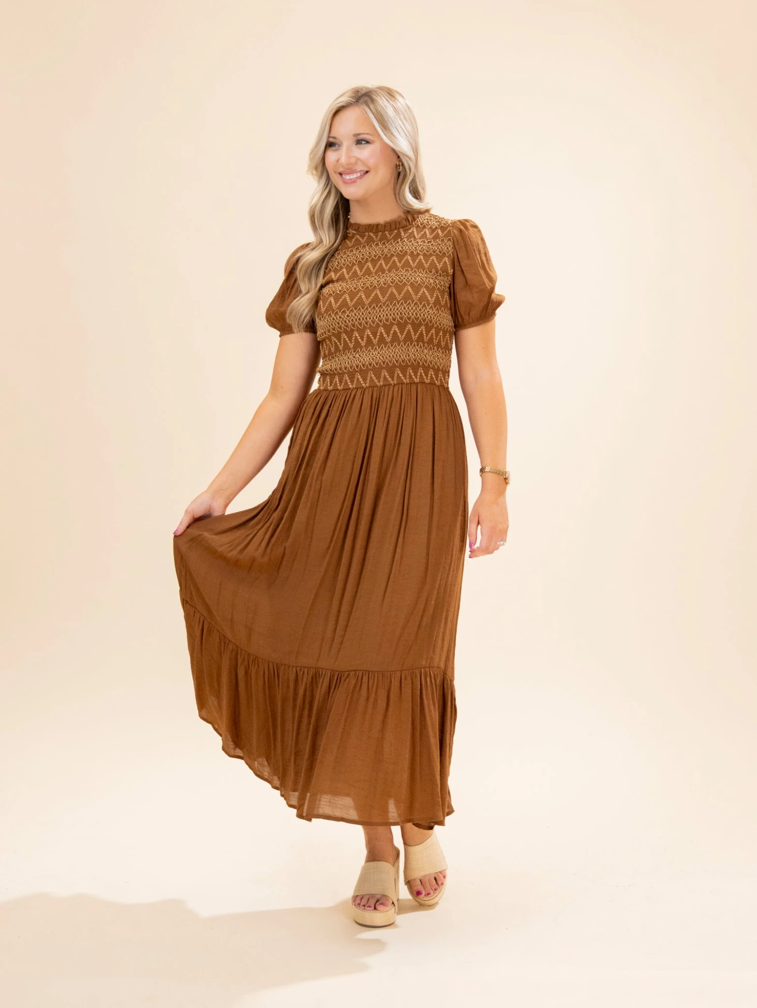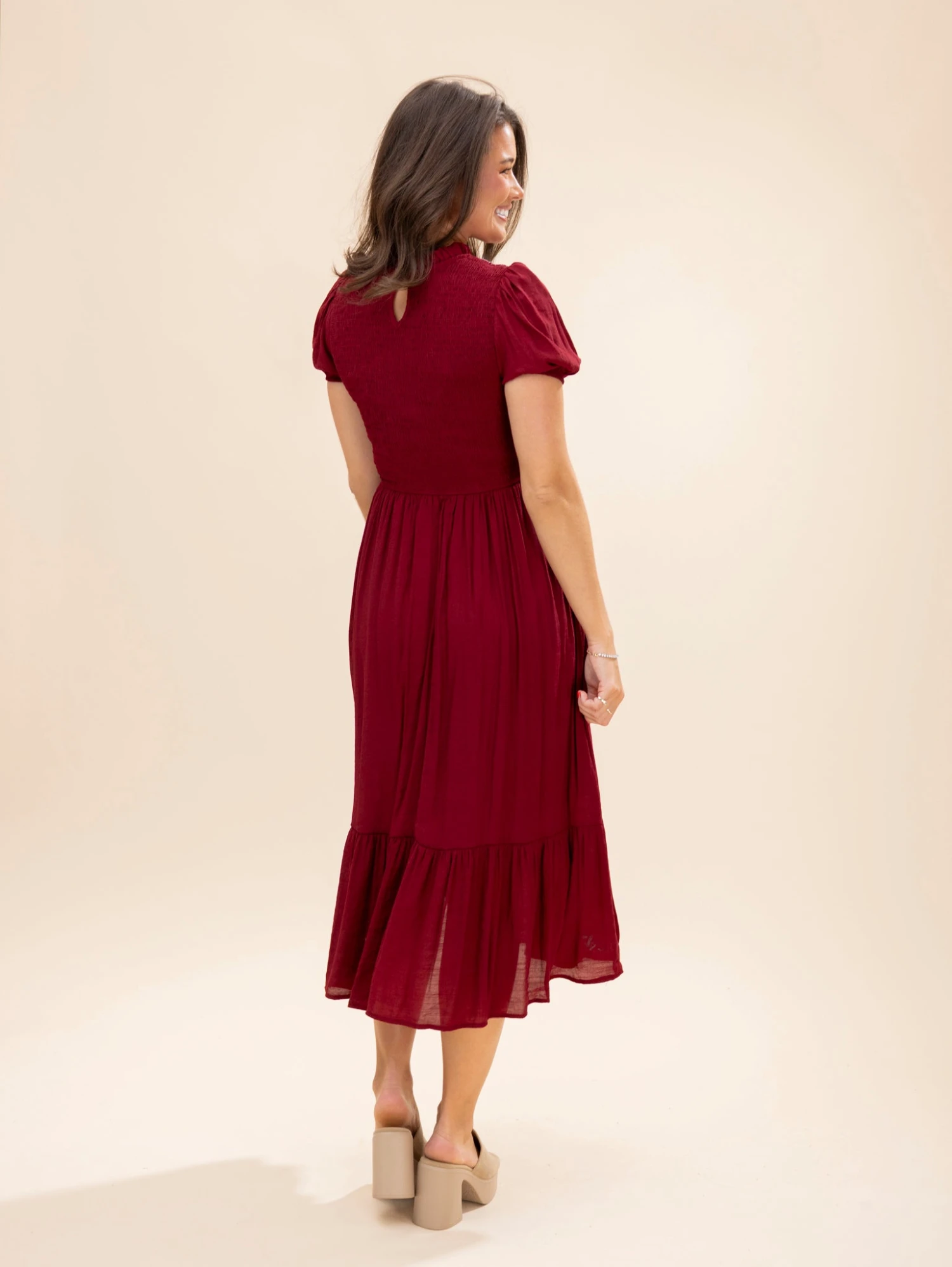 Features: Round Neck, Button Keyhole Back Closure, Smocked Body W/ Stitching, Puff Short Sleeves, Midi Dress