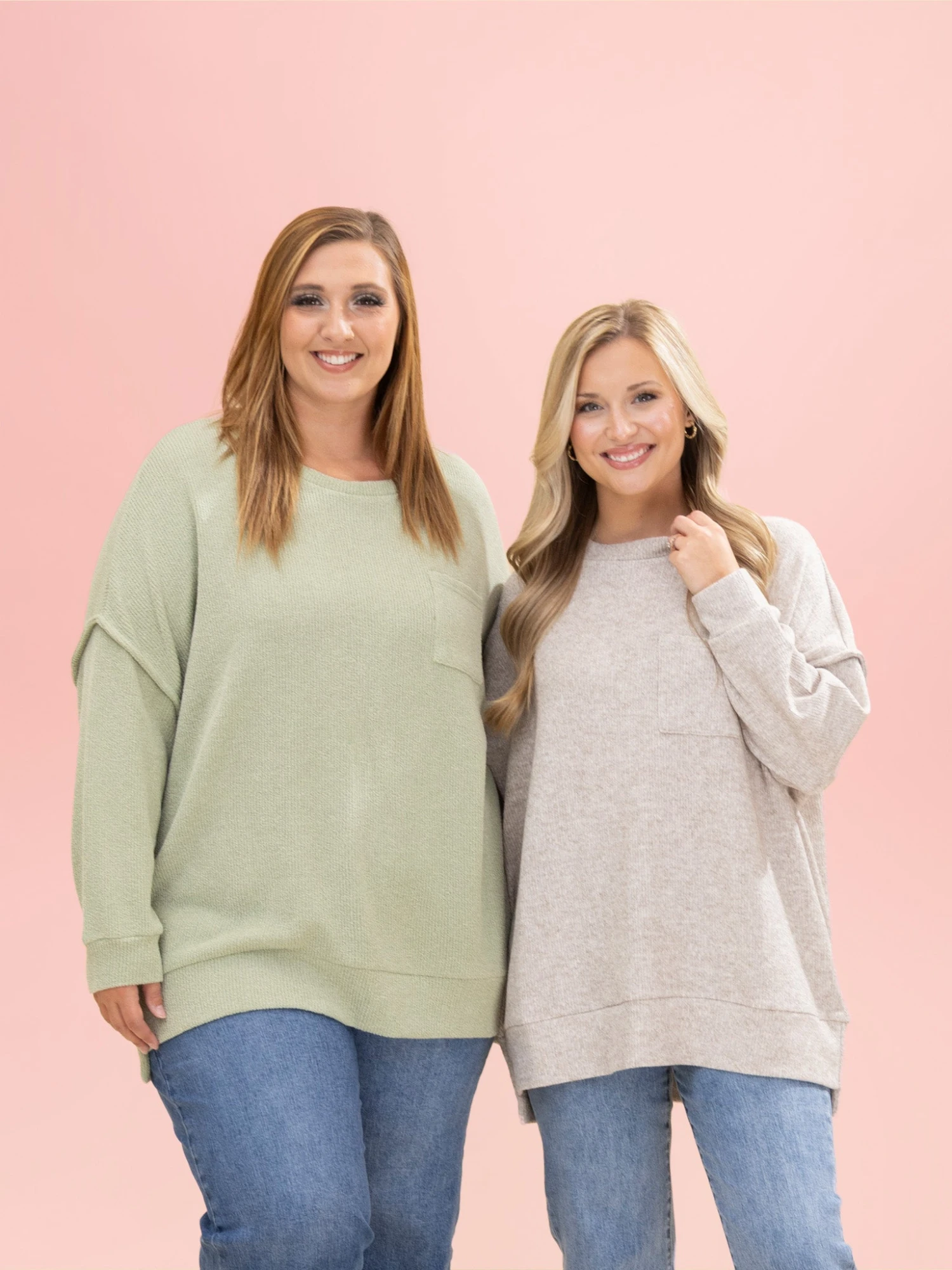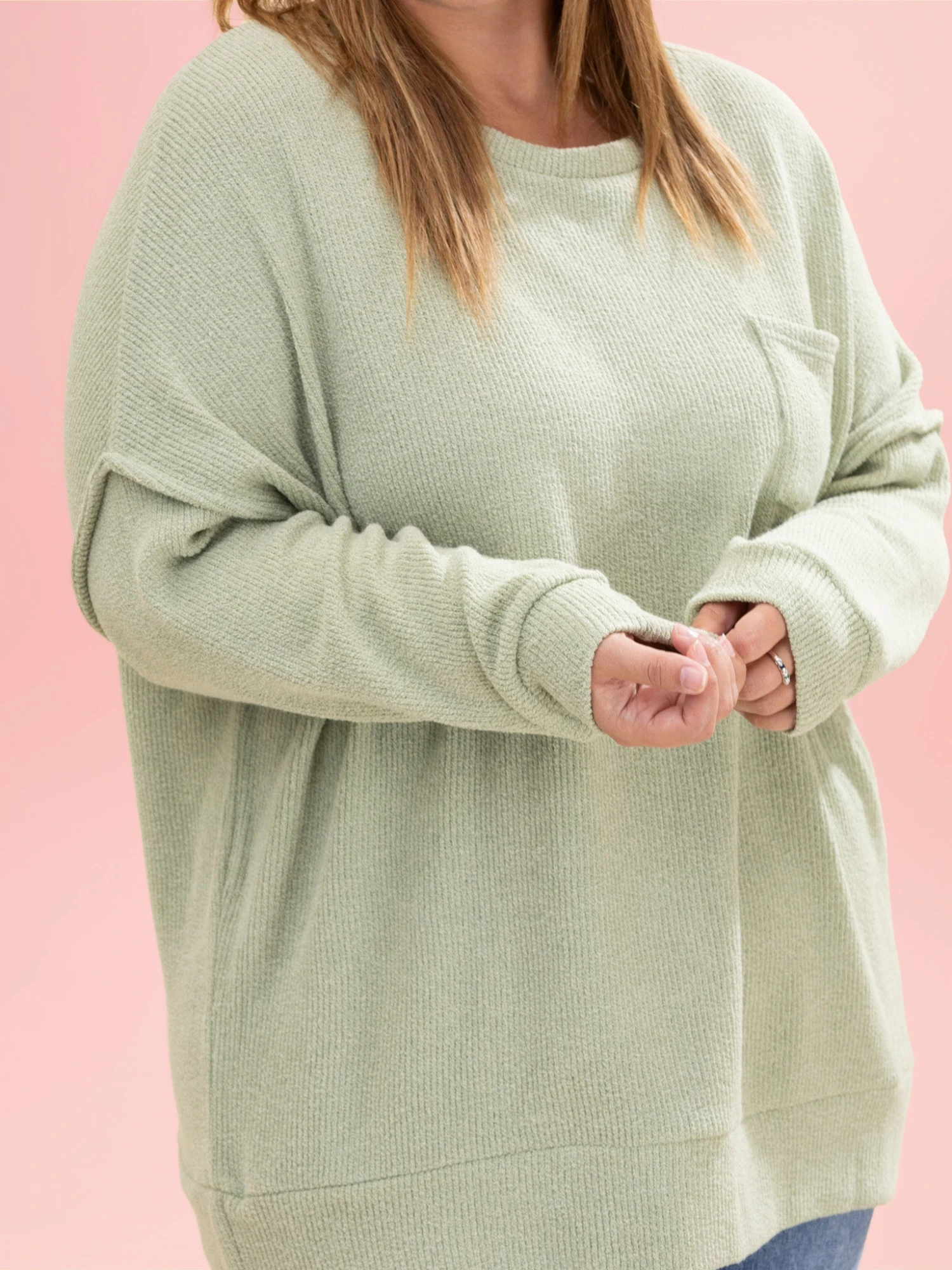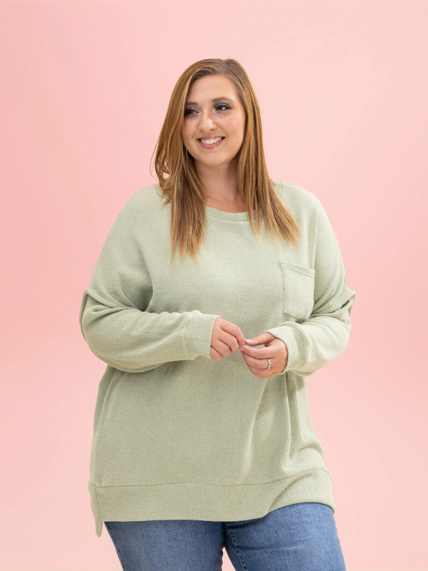 Features: Round Neck, 3/4 Sleeve, Chest Pocket, Hacci Pullover