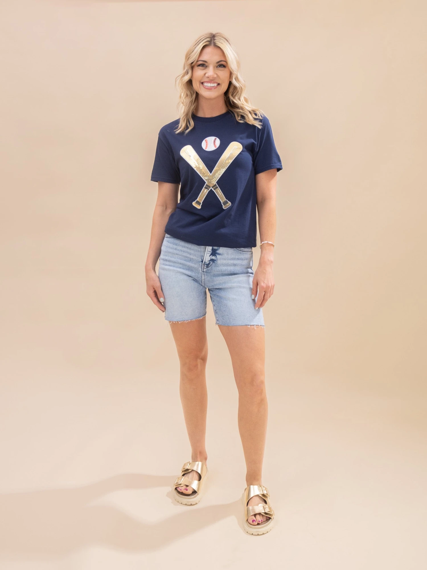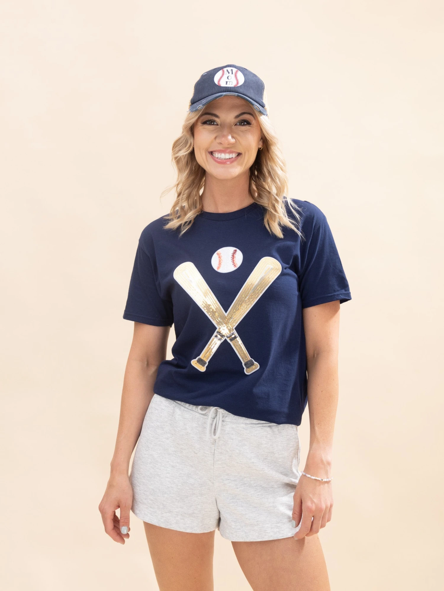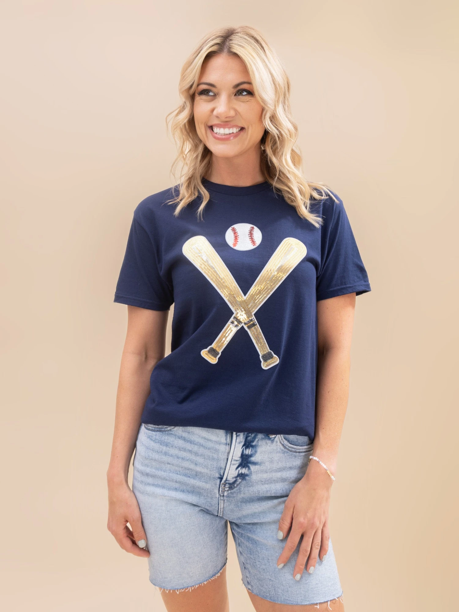 Features: Sequined Baseball Bats, Round Neck, Short Sleeves, Graphic Tee