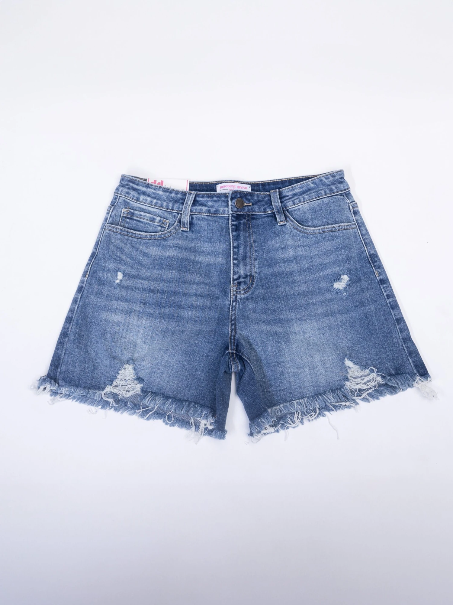 Features: medium wash, distressed detail, frayed hem