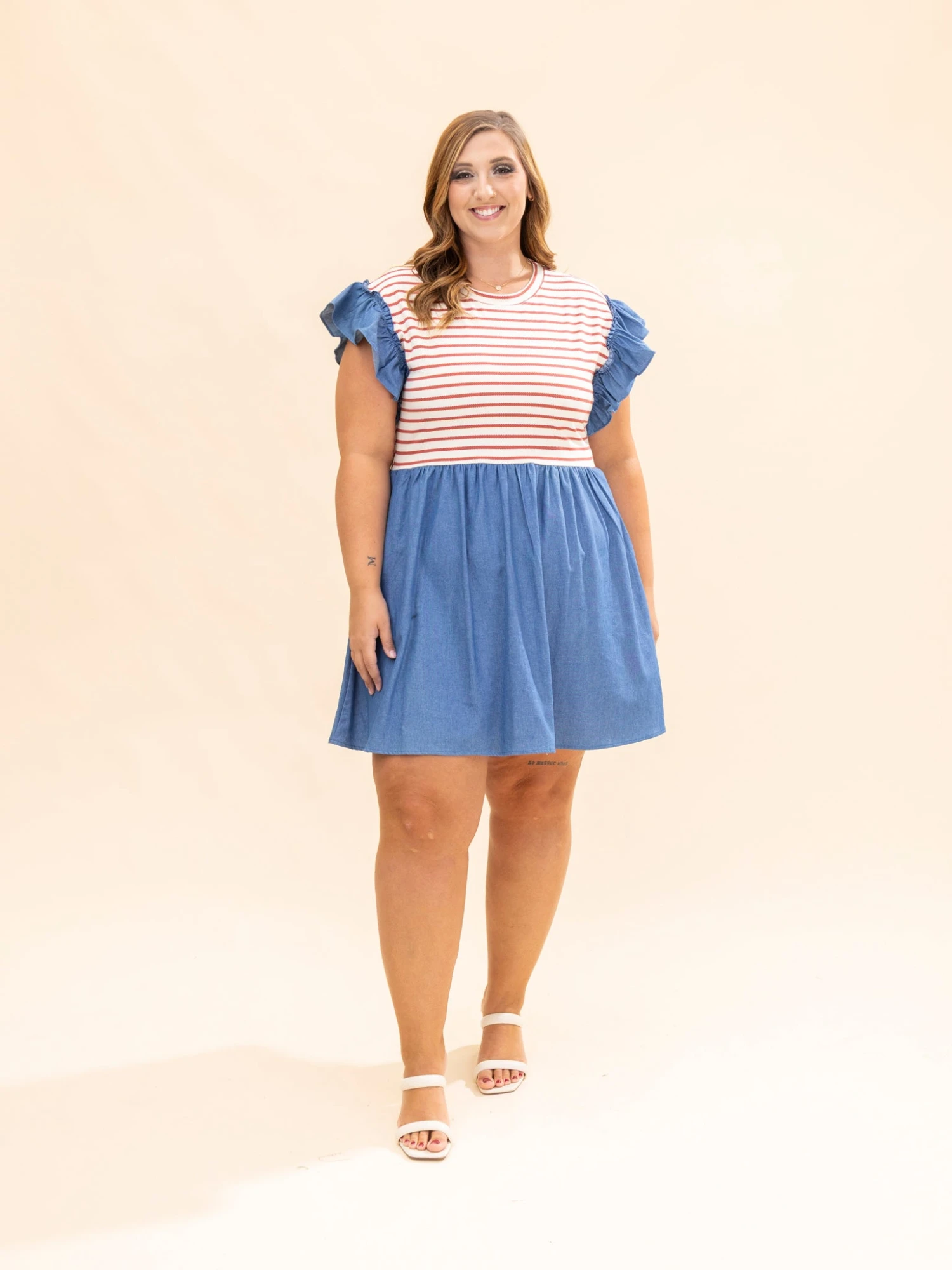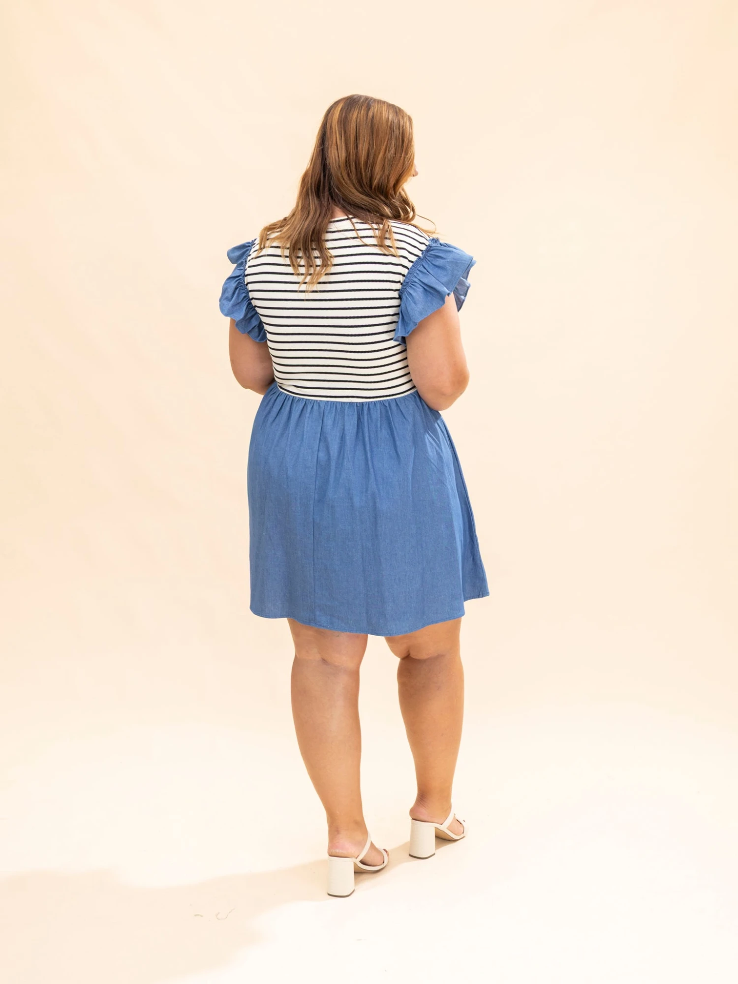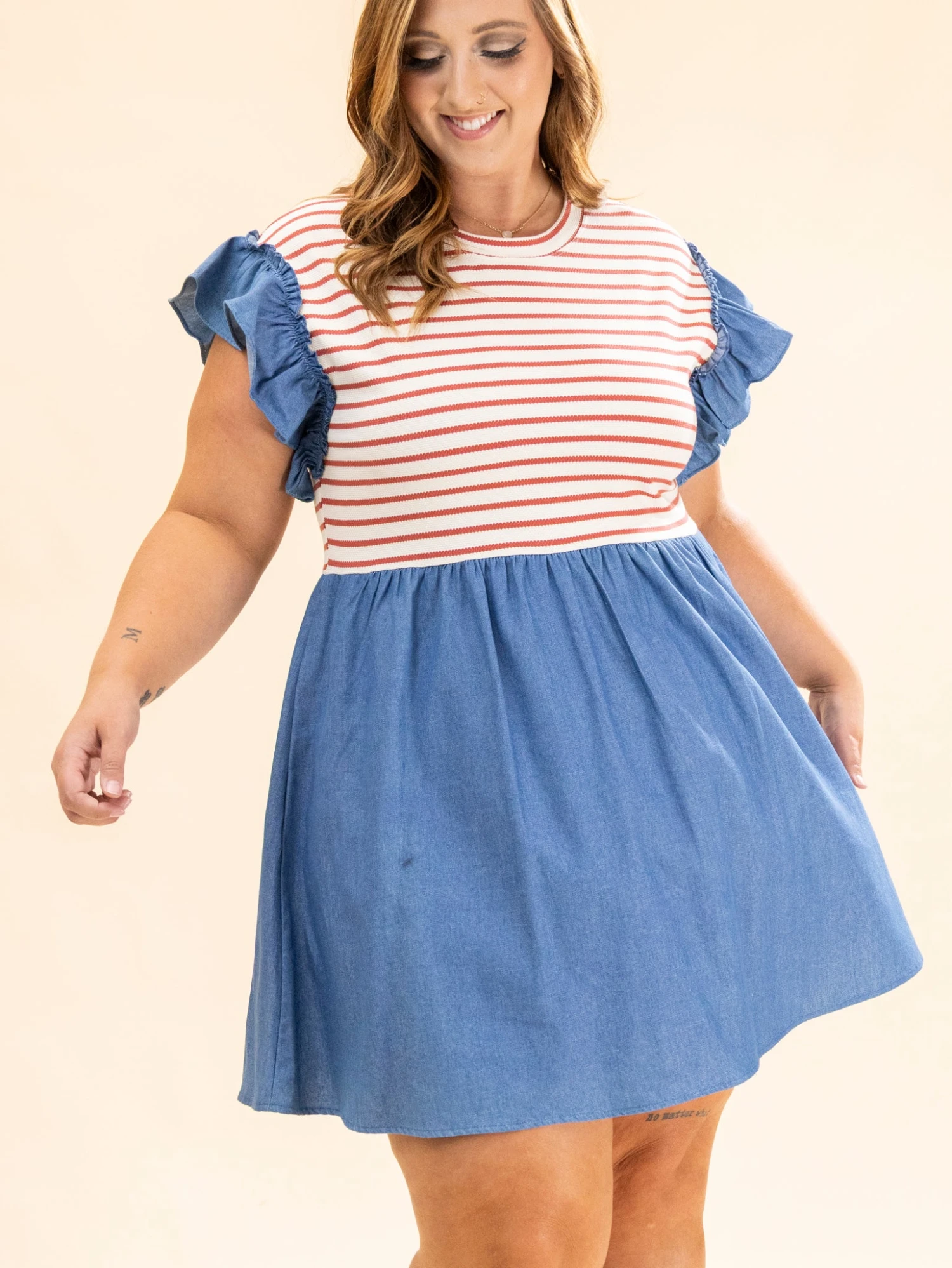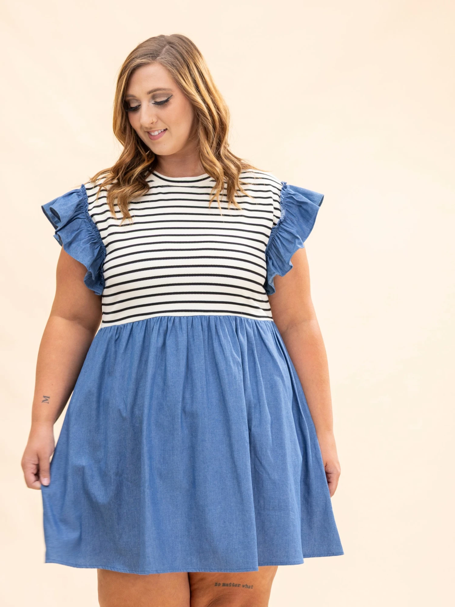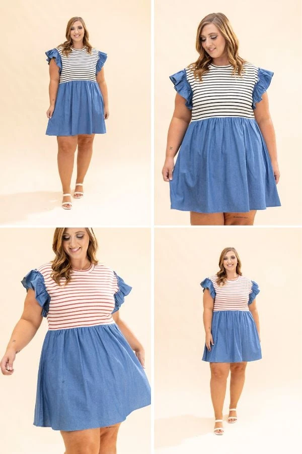 Features: Round Neck, Flutter Sleeves, Striped, Pockets