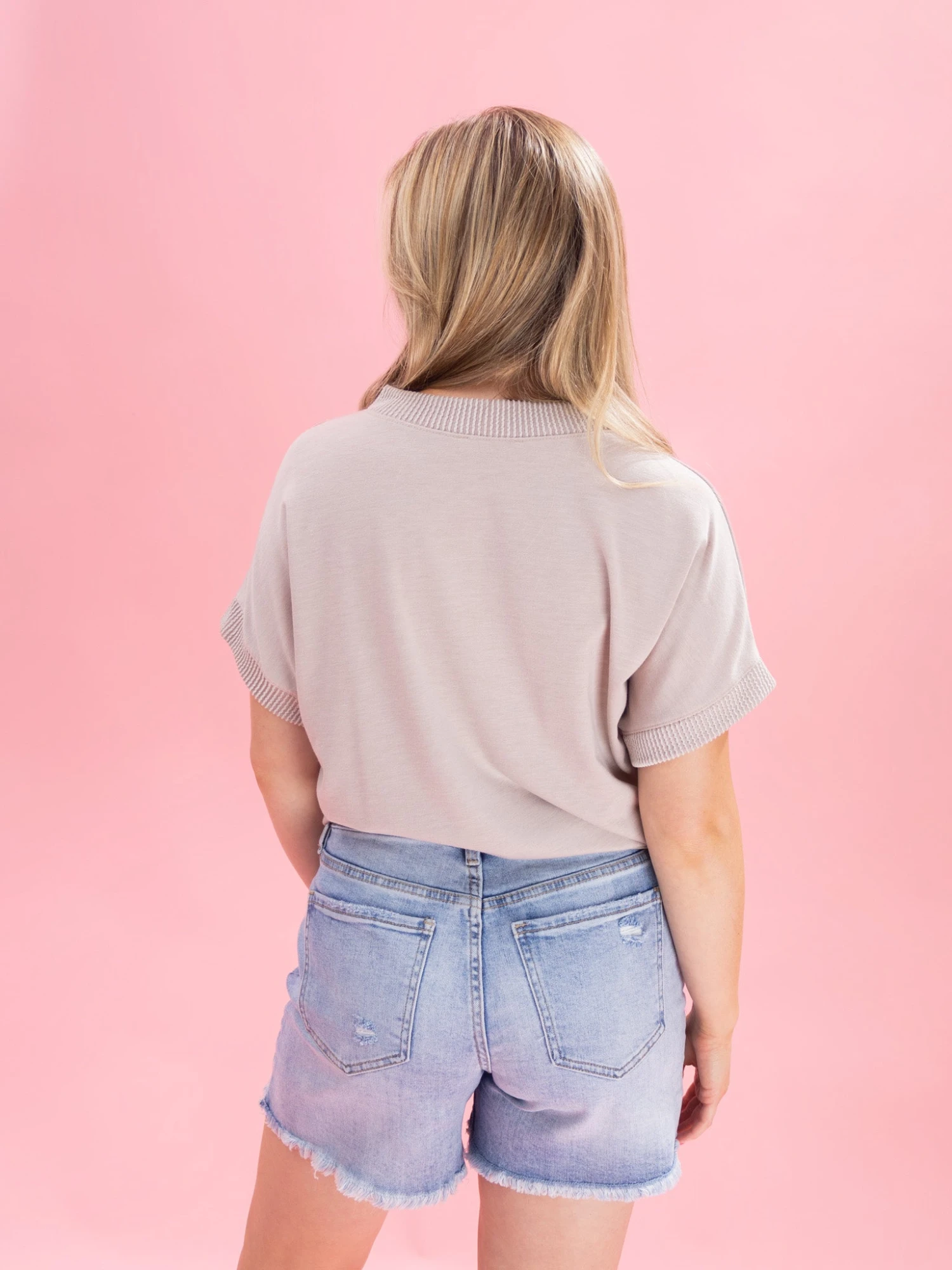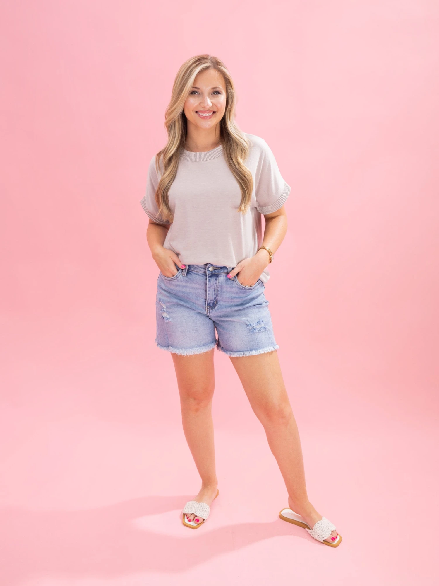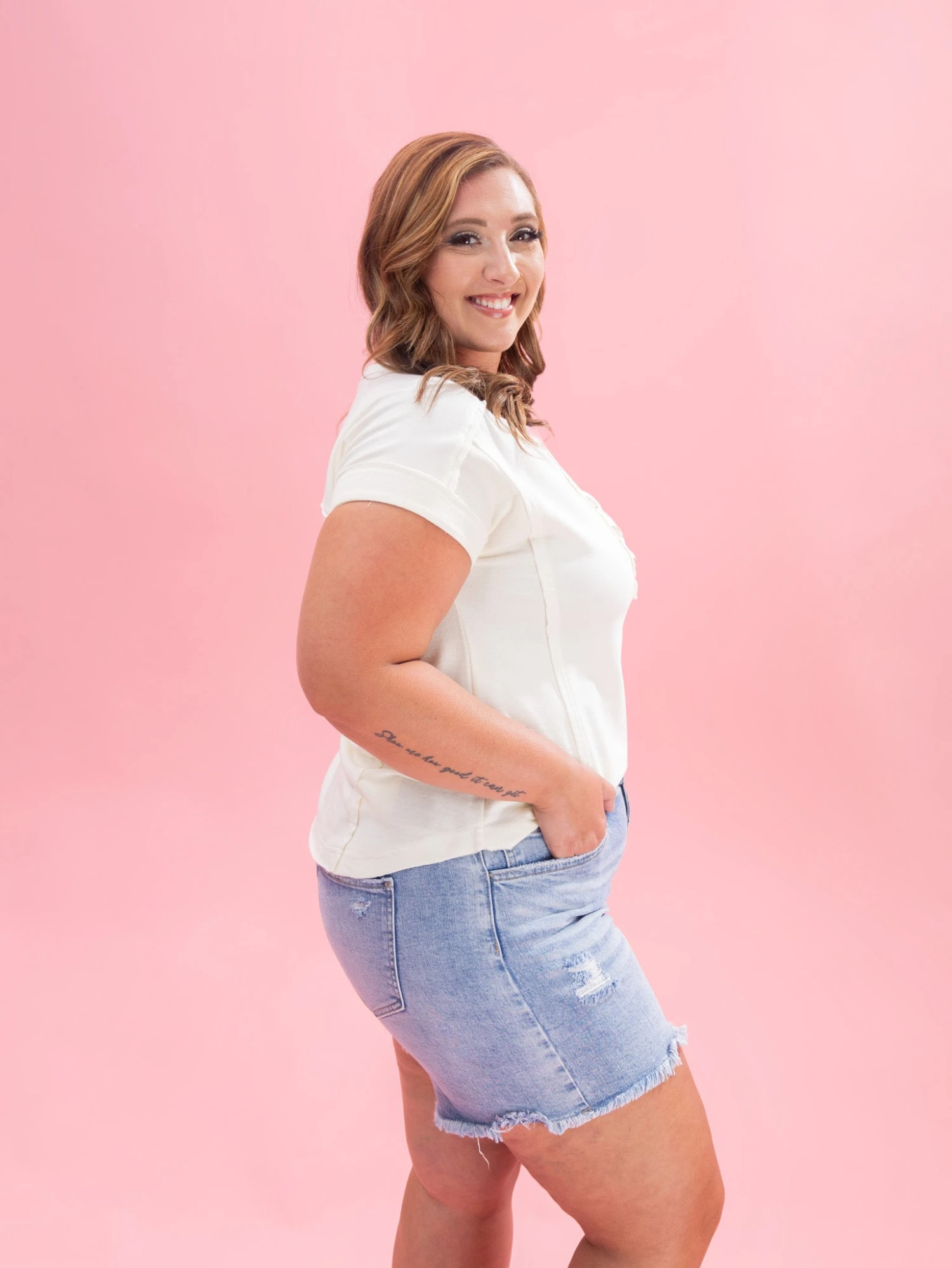 Brittany (short blonde hair) is 5’10, 36B bra, typically wears size S in tops and 3 in denim. Wearing size S
