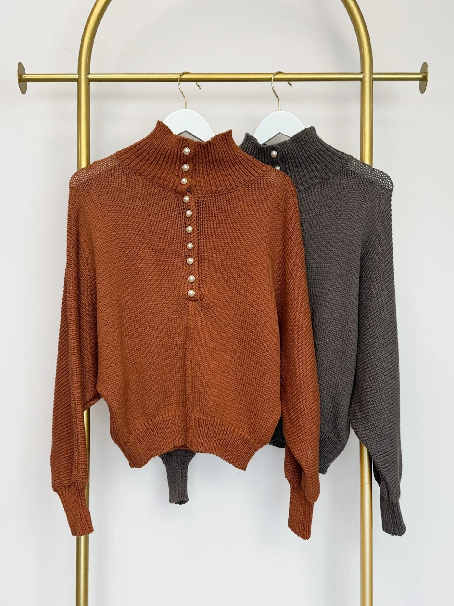 Features: waffle knit, dolman long sleeves, mock neck, pearl summary detail