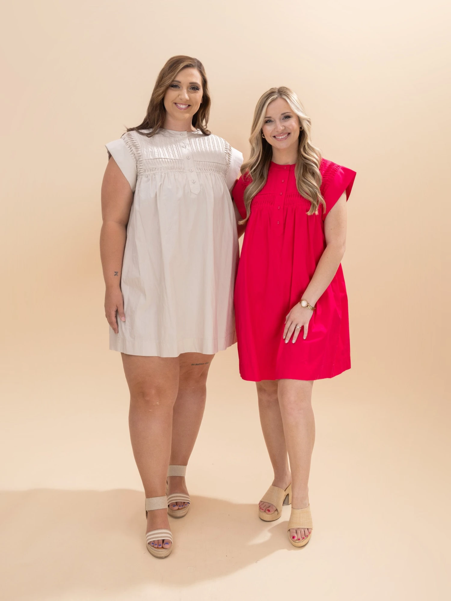 Crimsen (long blonde hair) is 5’1, 34B bra, typically wears size S in tops and 3 in denim. Wearing size S