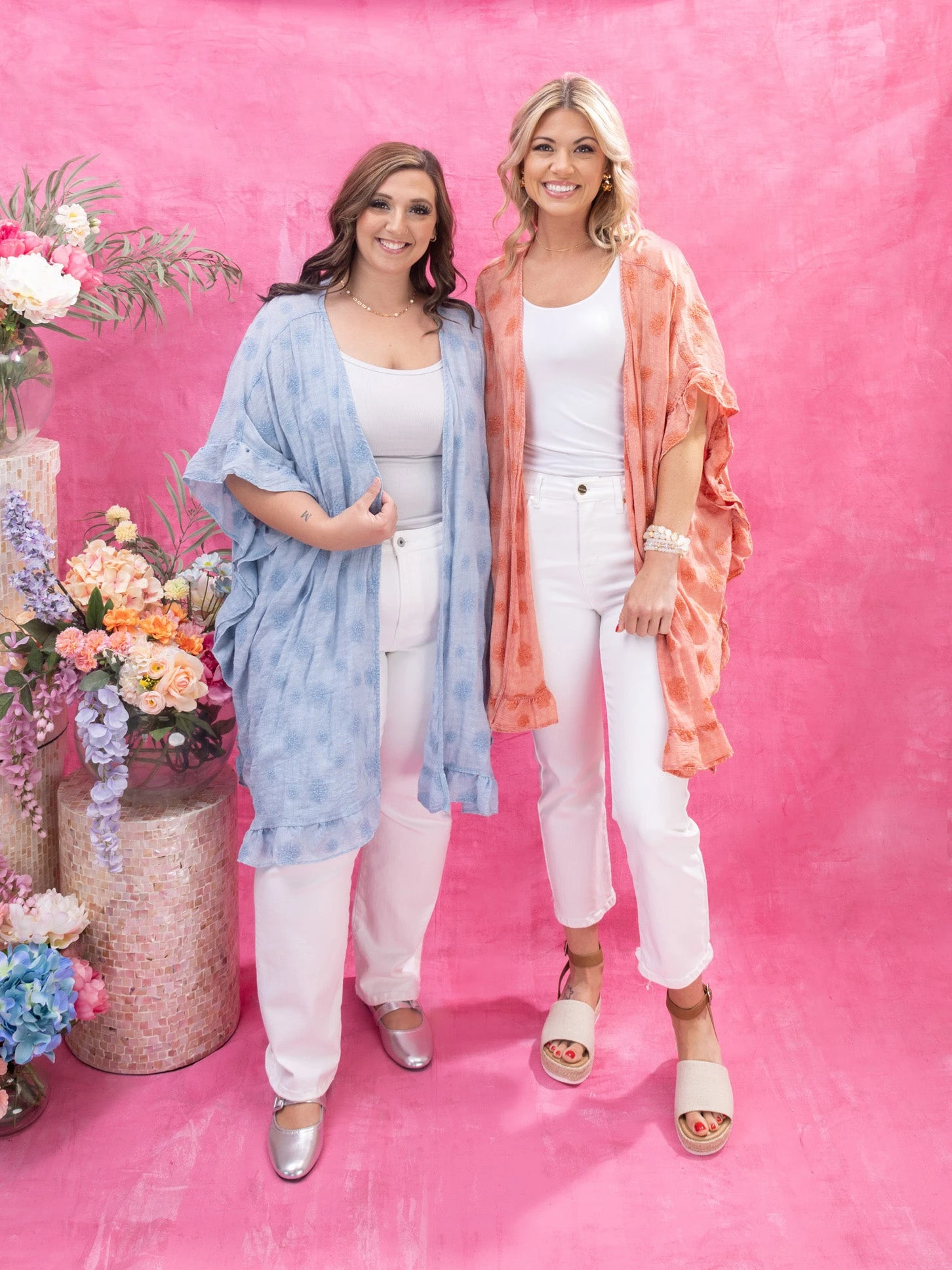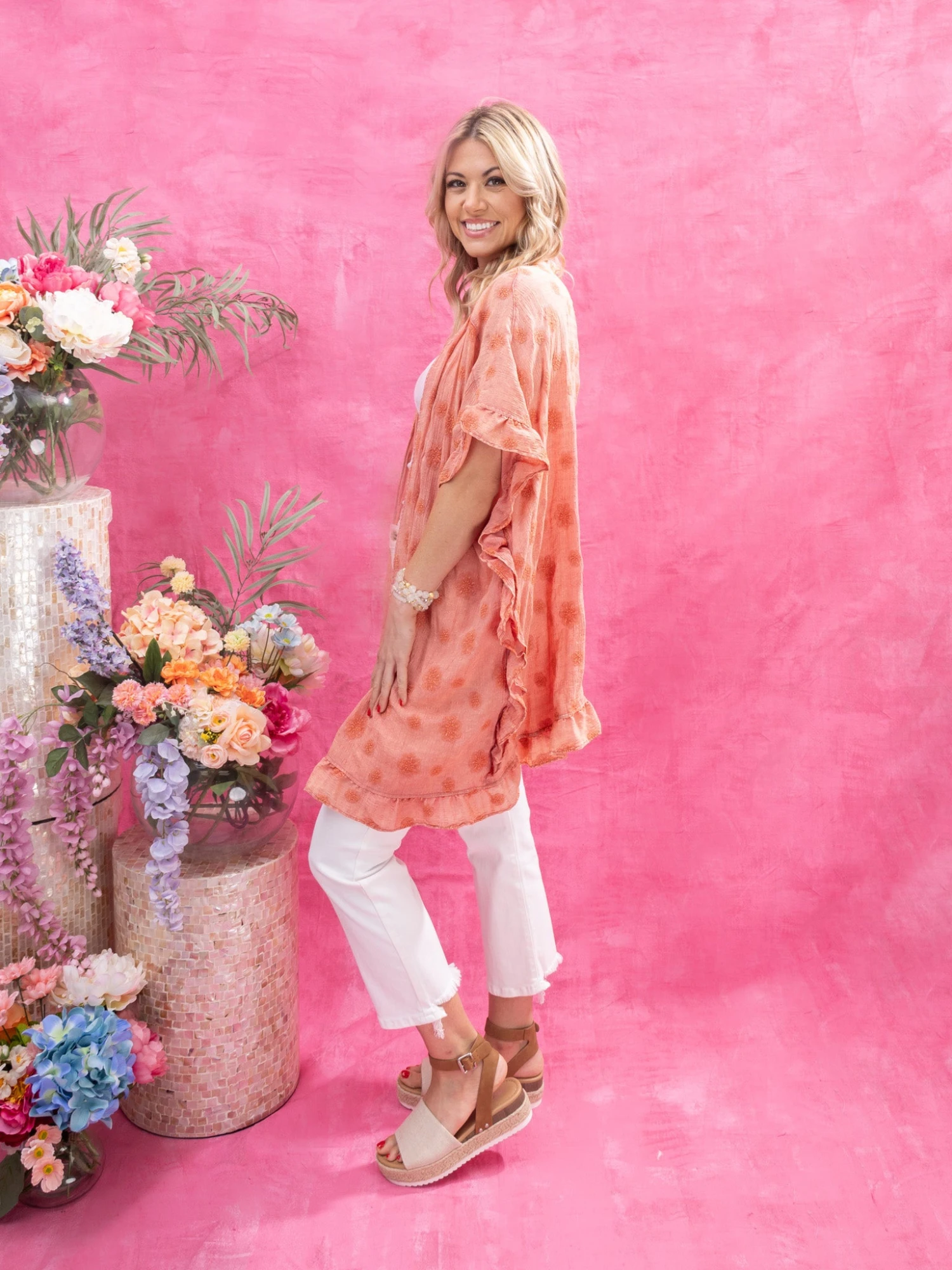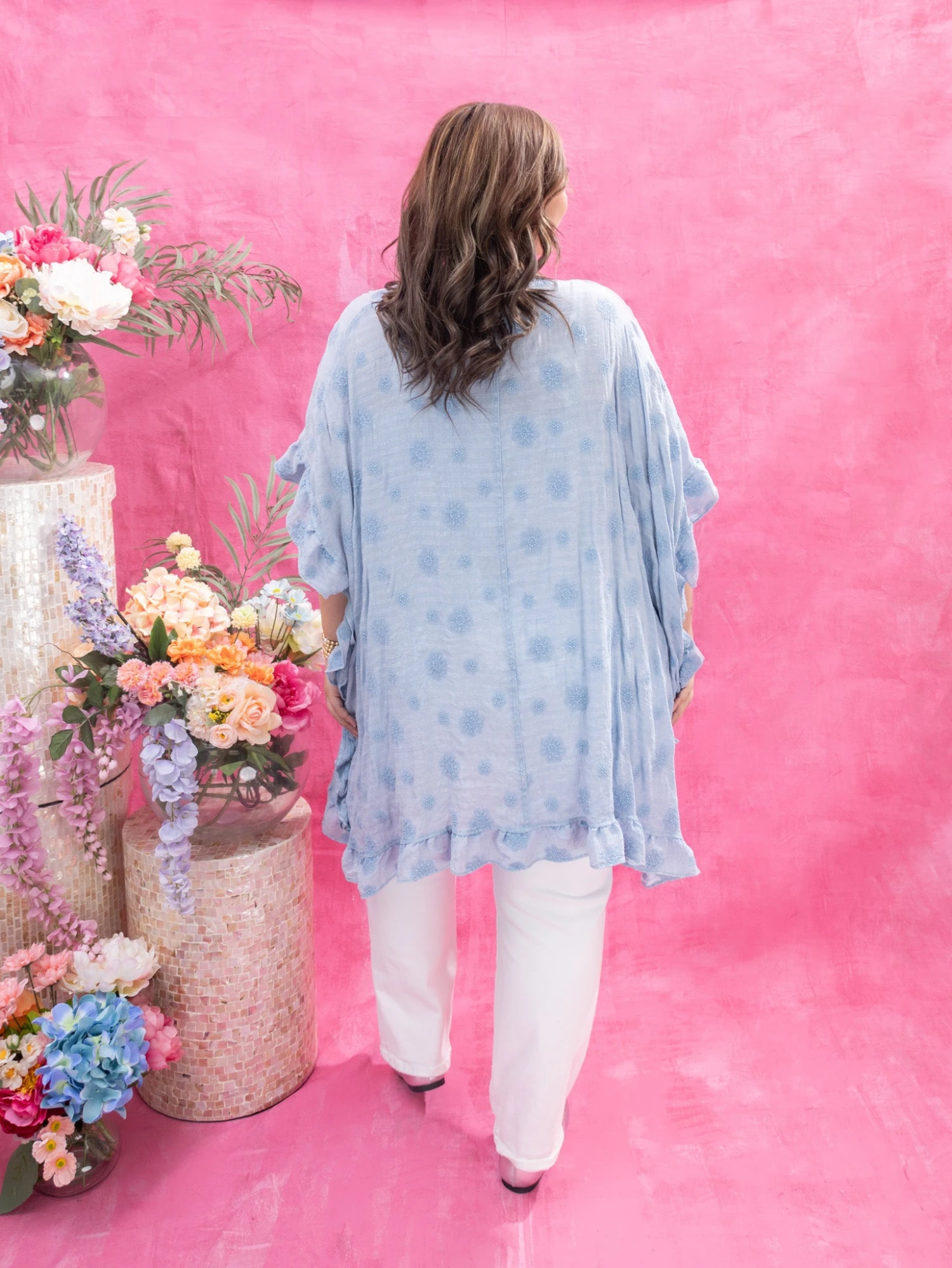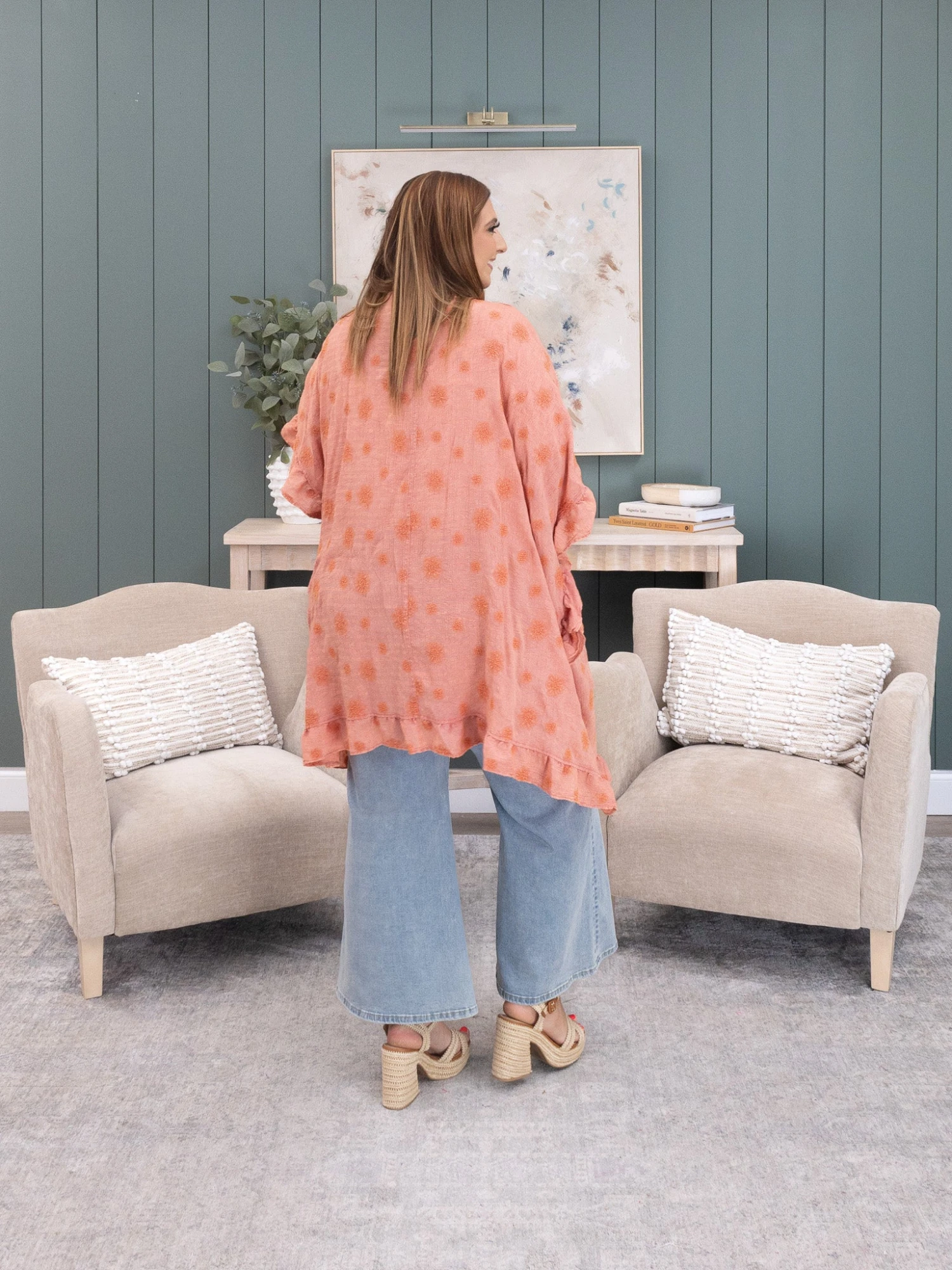 Features: Open Front, Ruffle Detail, Embroidery Flowers, Gauze Mineral Washed Duster