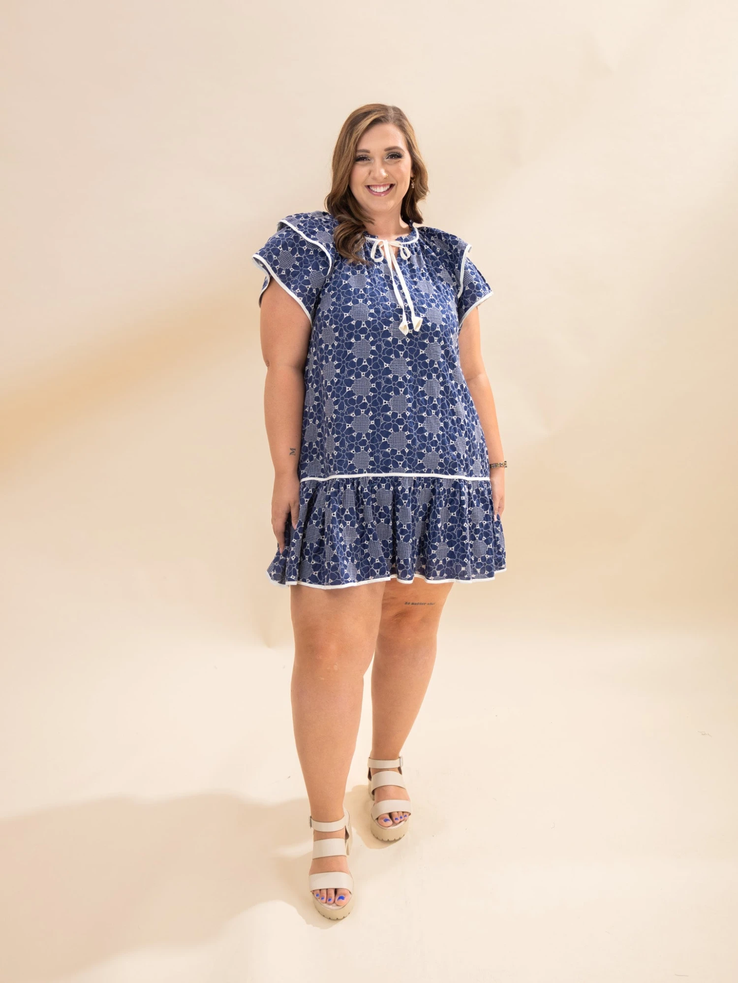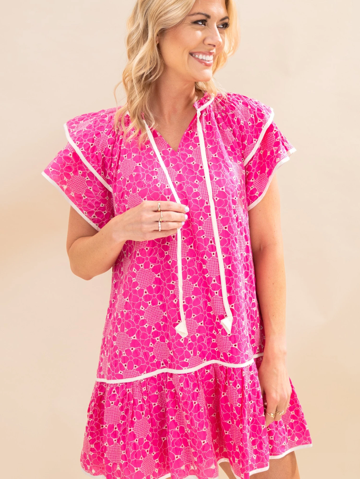 Features: Ruffle V Neck W/ Tie, Double Layer Short Sleeve, Flower Pattern Eyelet Lined Dress