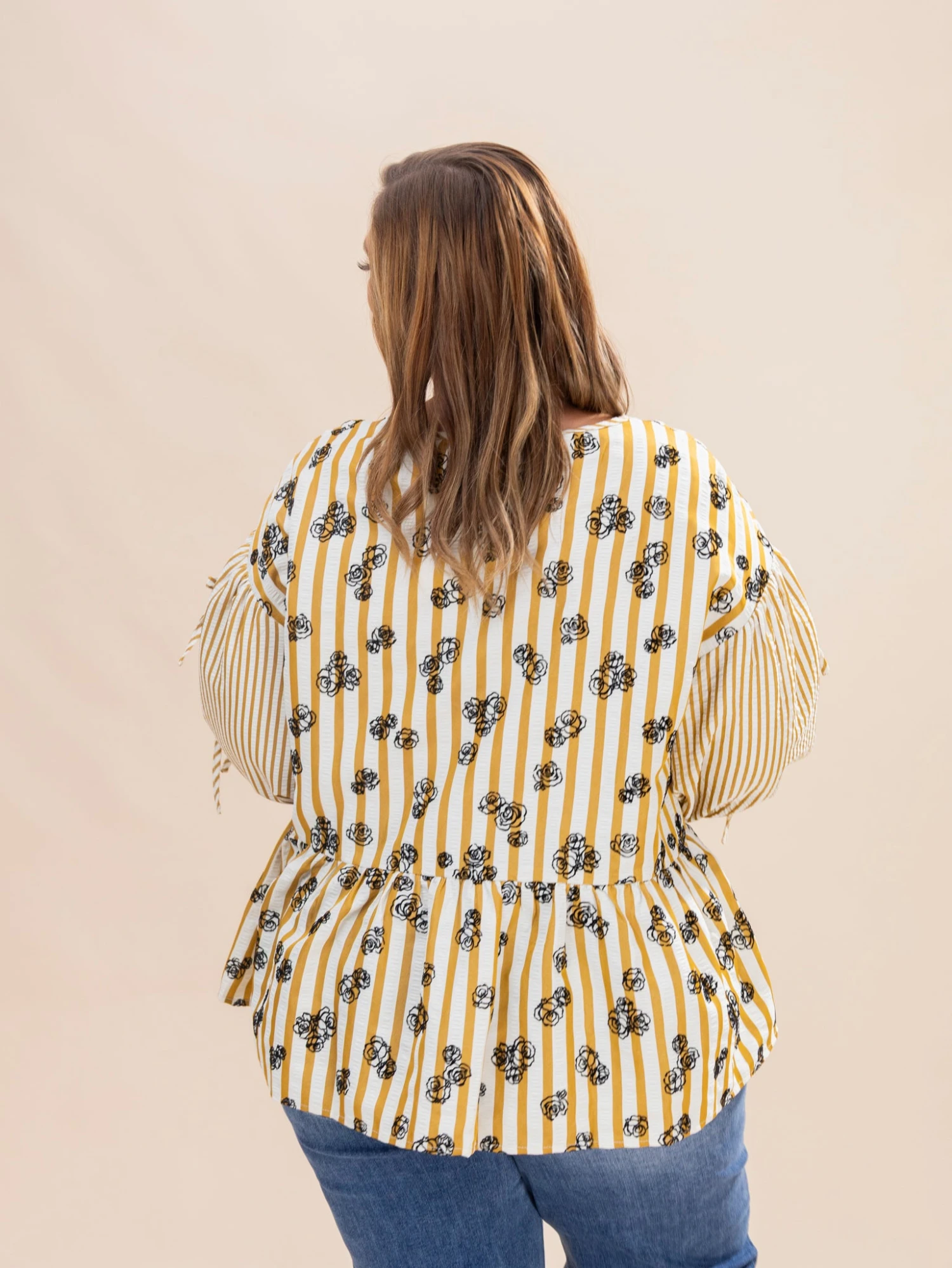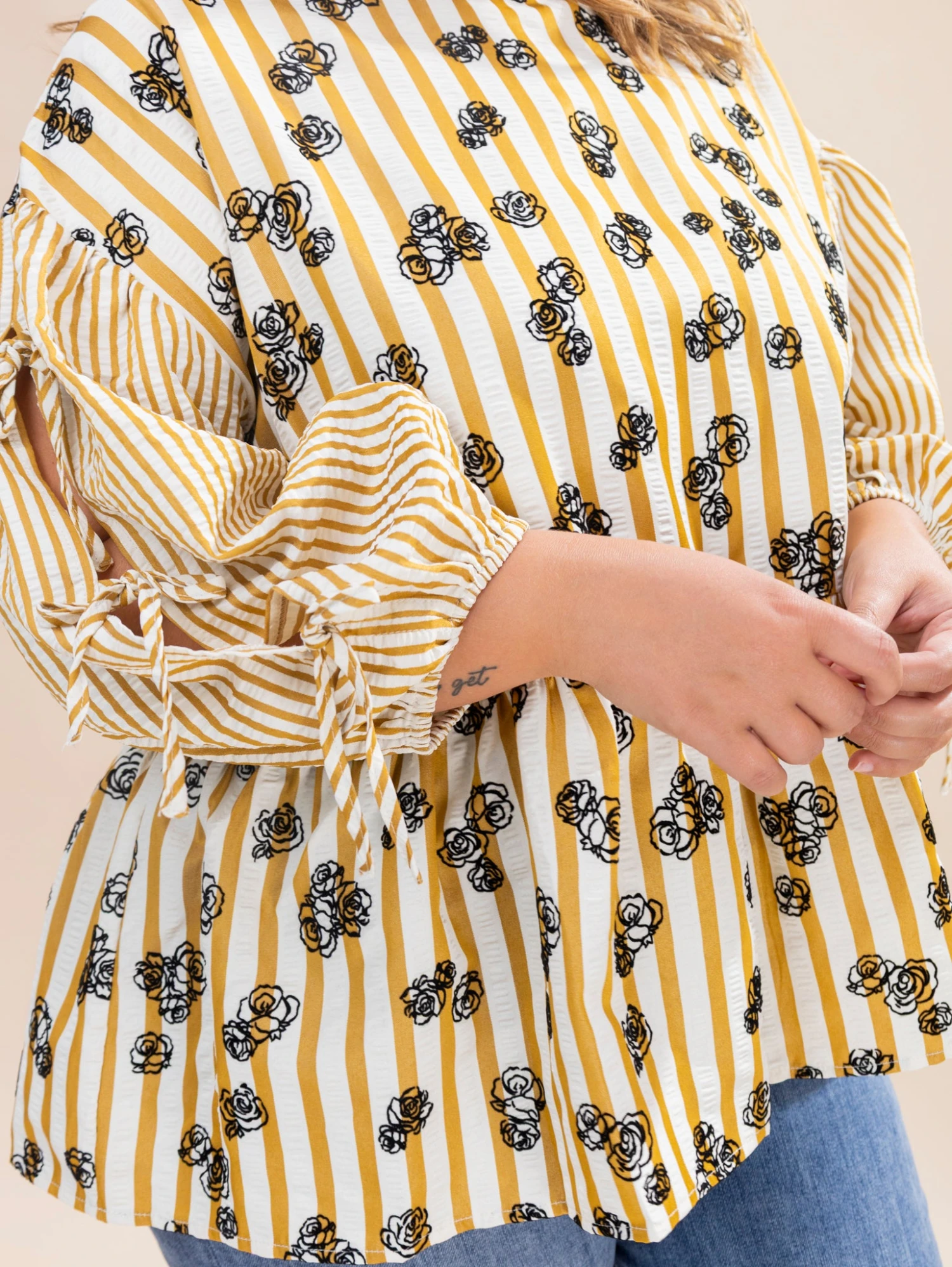 Features: Round Neck, Back Button Closure, Tie Ribbon Half Sleeves, Striped, Embroidered Flowers, Peplum