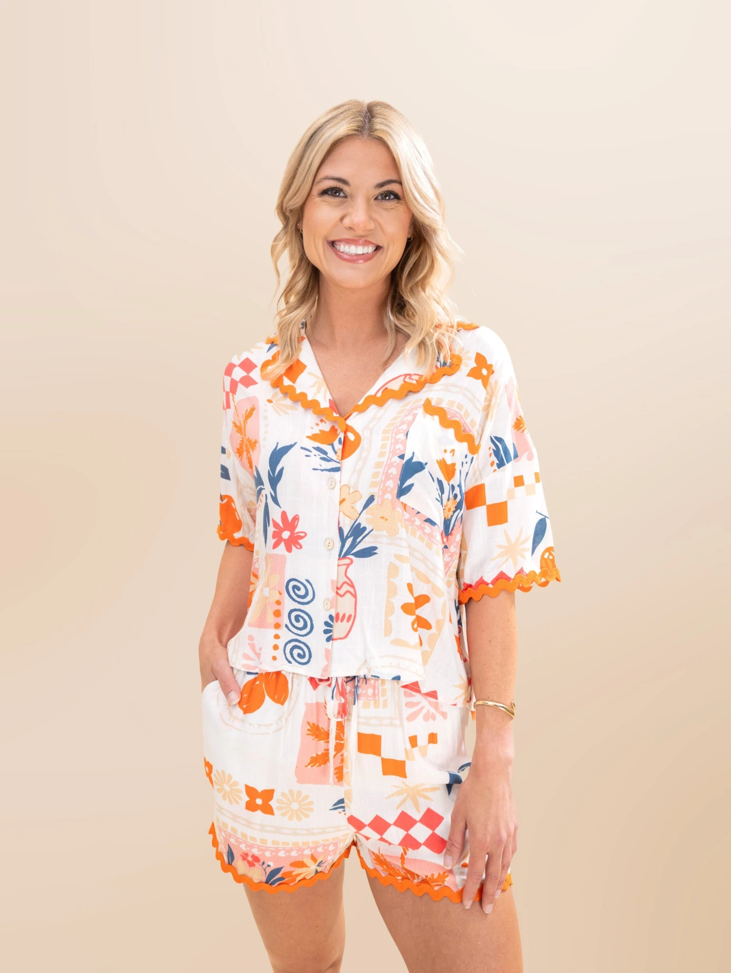 Features: Collar, Button Down, Wavy Trim Detail, Short Sleeves, Printed Top