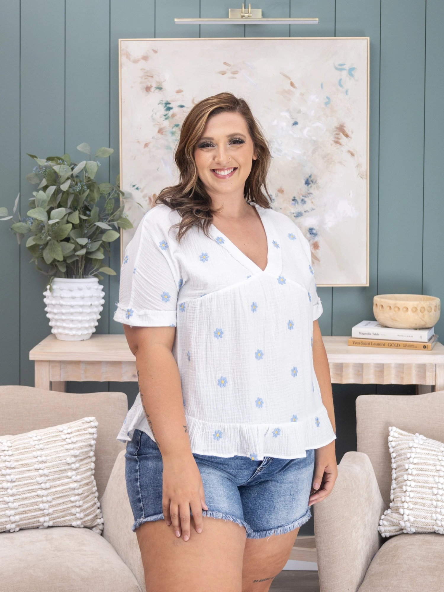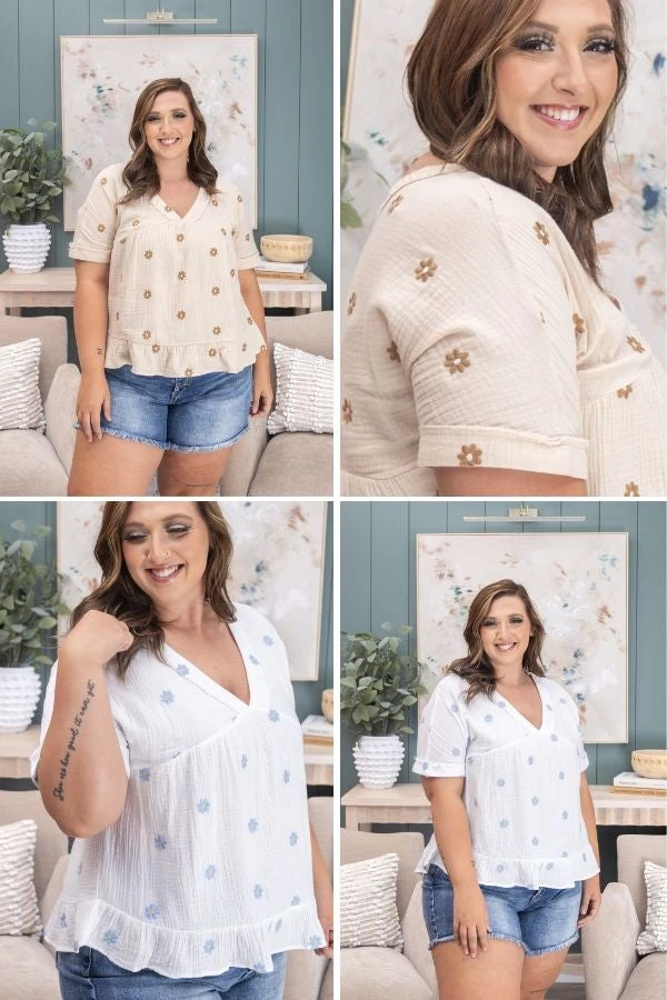 Features: V Neck, Short Sleeves, Ruffle Hem, Embroidered Flowers