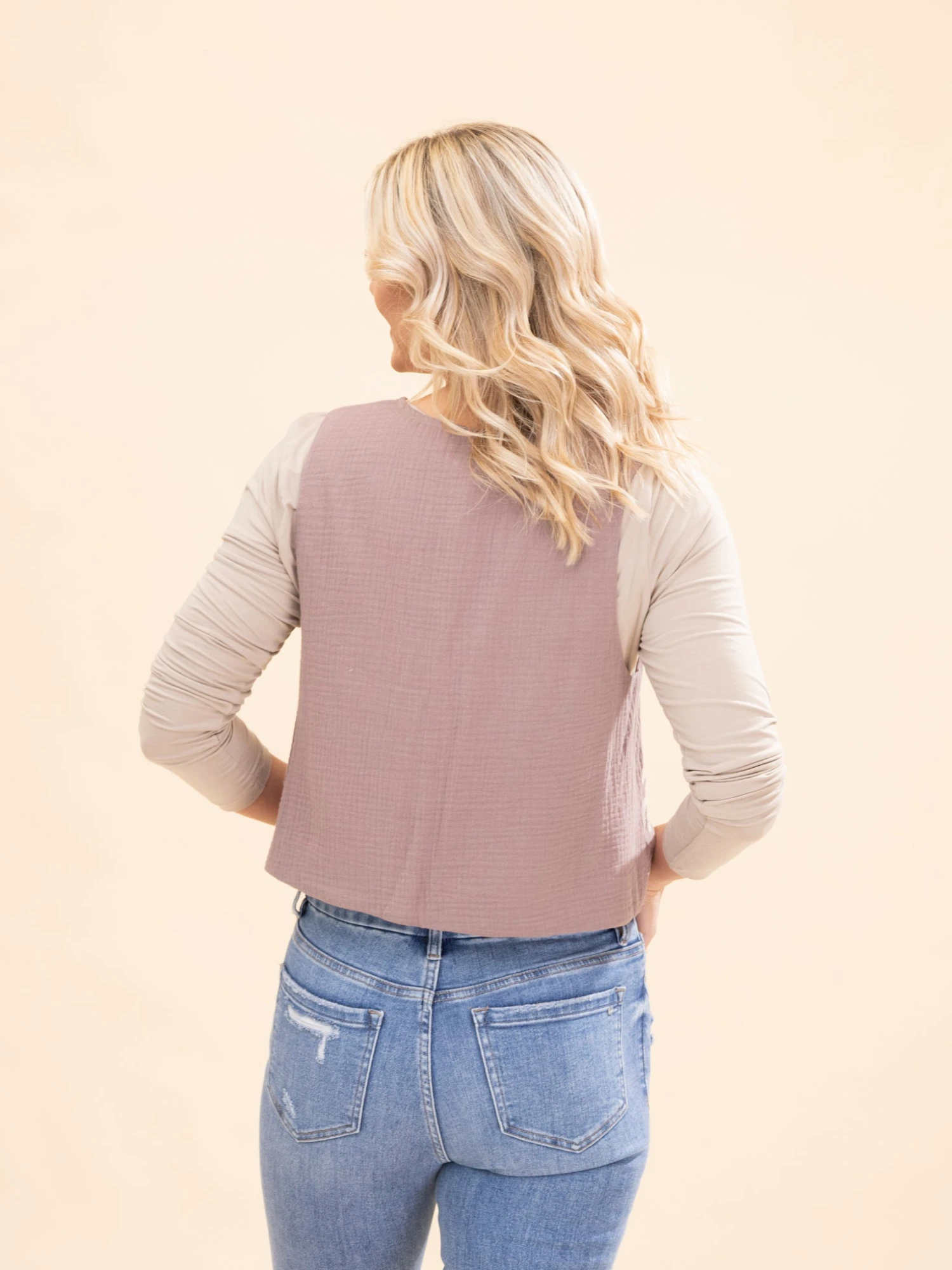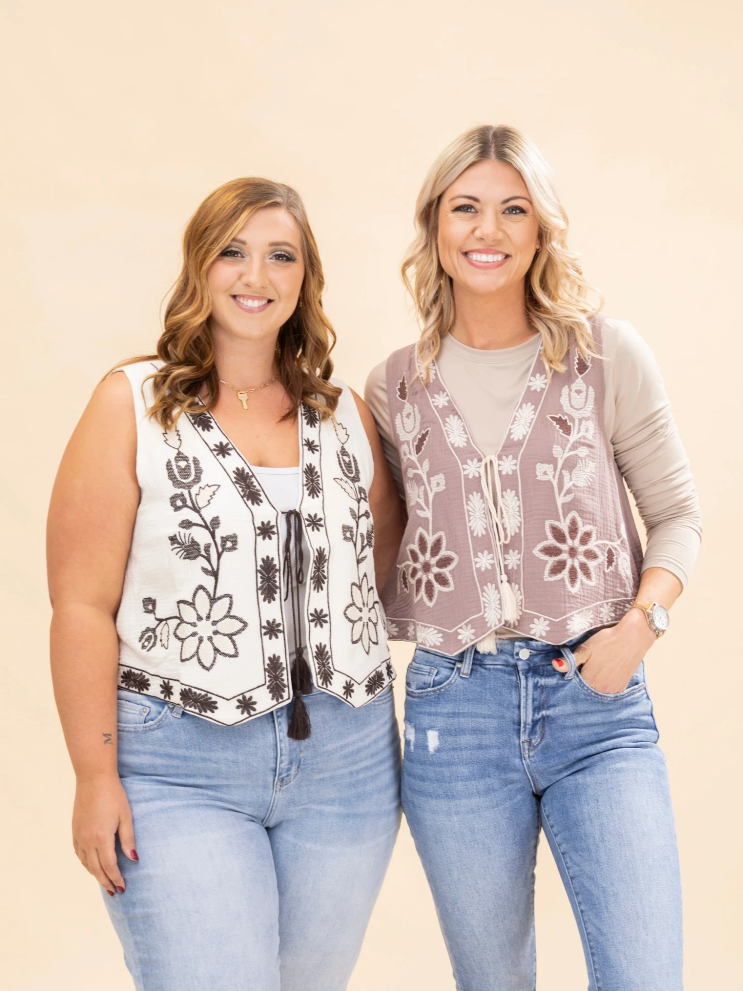 Brittany (short blonde hair) is 5’10, 36B bra, typically wears size S in tops and 3 in denim. Wearing size S