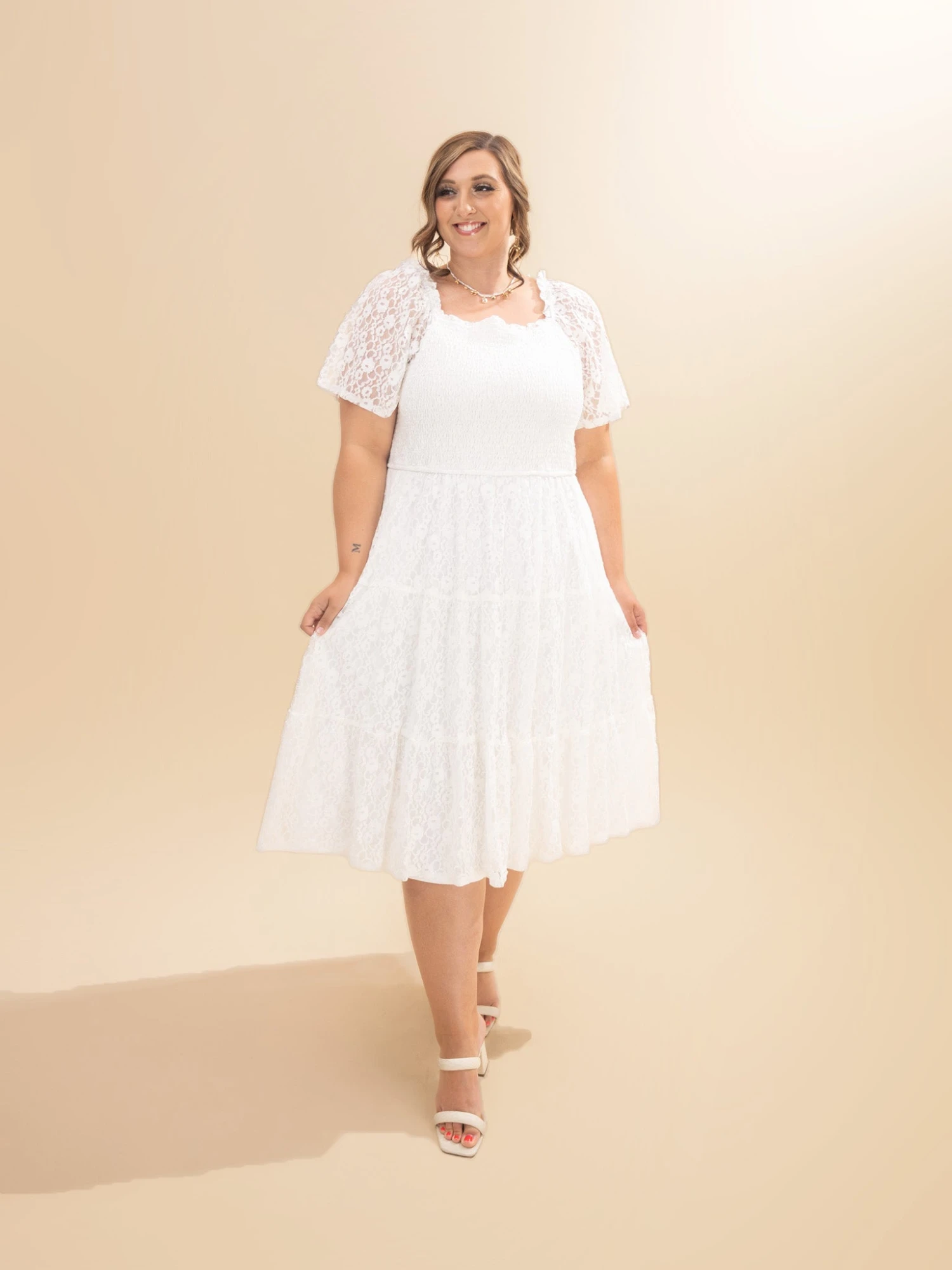 Features: Square Neck, Smocked, Lace Short Sleeves, Fully Lined Floral Lace Midi Dress