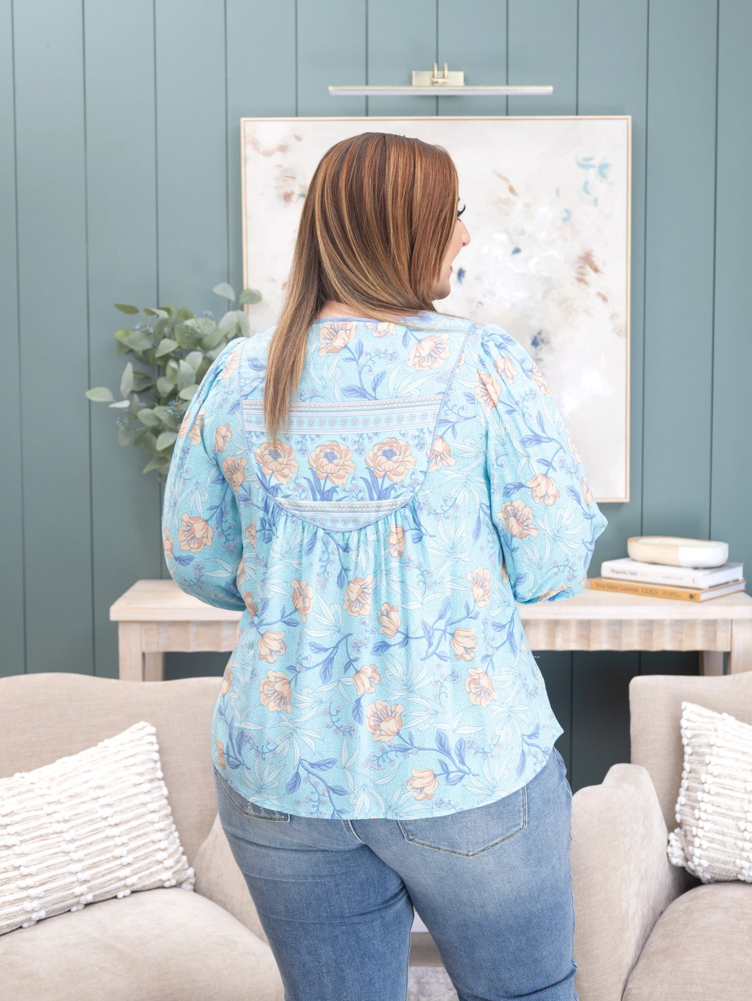 Features: Lace Up V Neck, Long Sleeves, Side Slits, Floral Print Top
