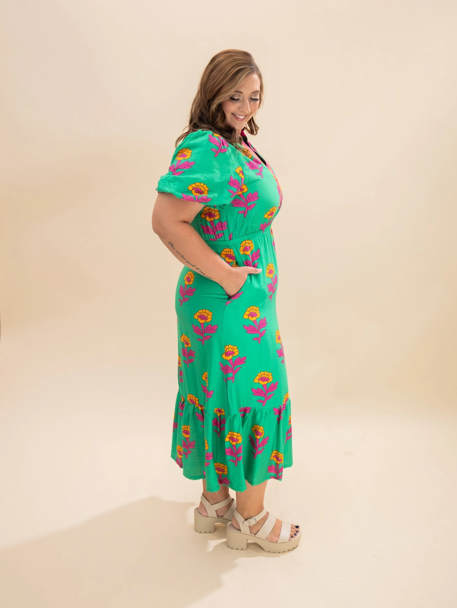 Features: V Neck, Elastic Puff Sleeves, Pockets, Elastic Waist, Ruffle Hem, Large Printed Floral Midi Dress