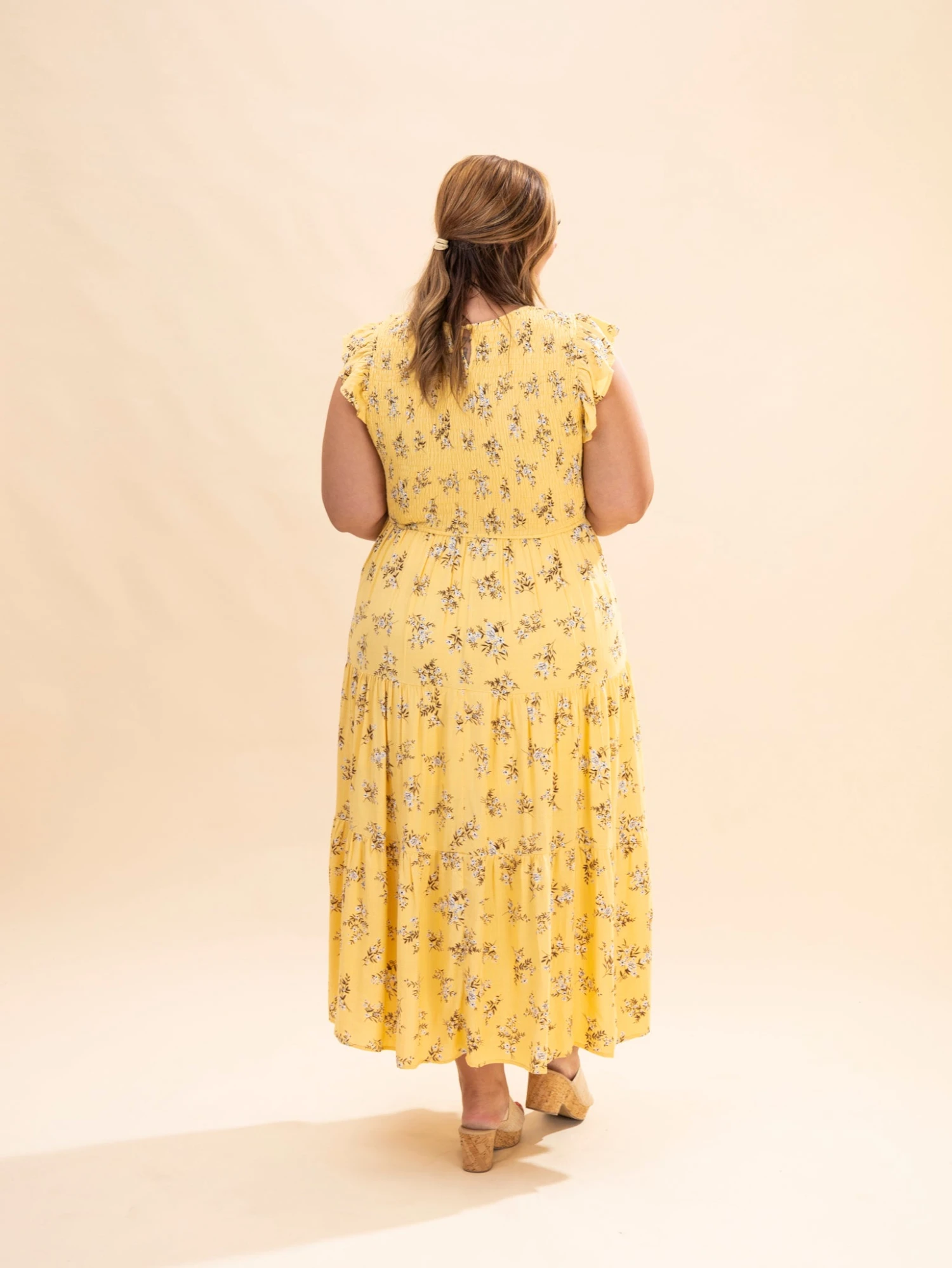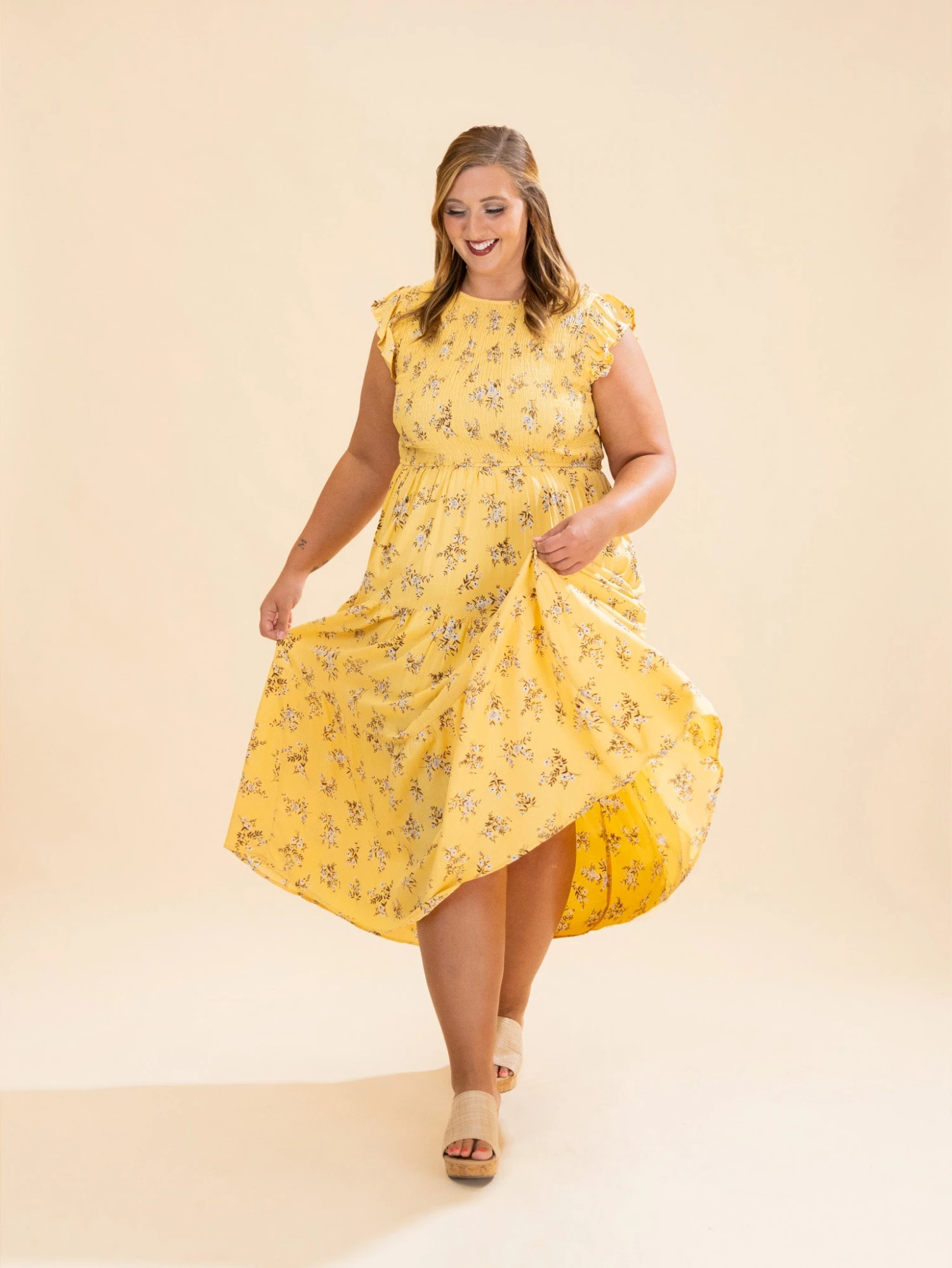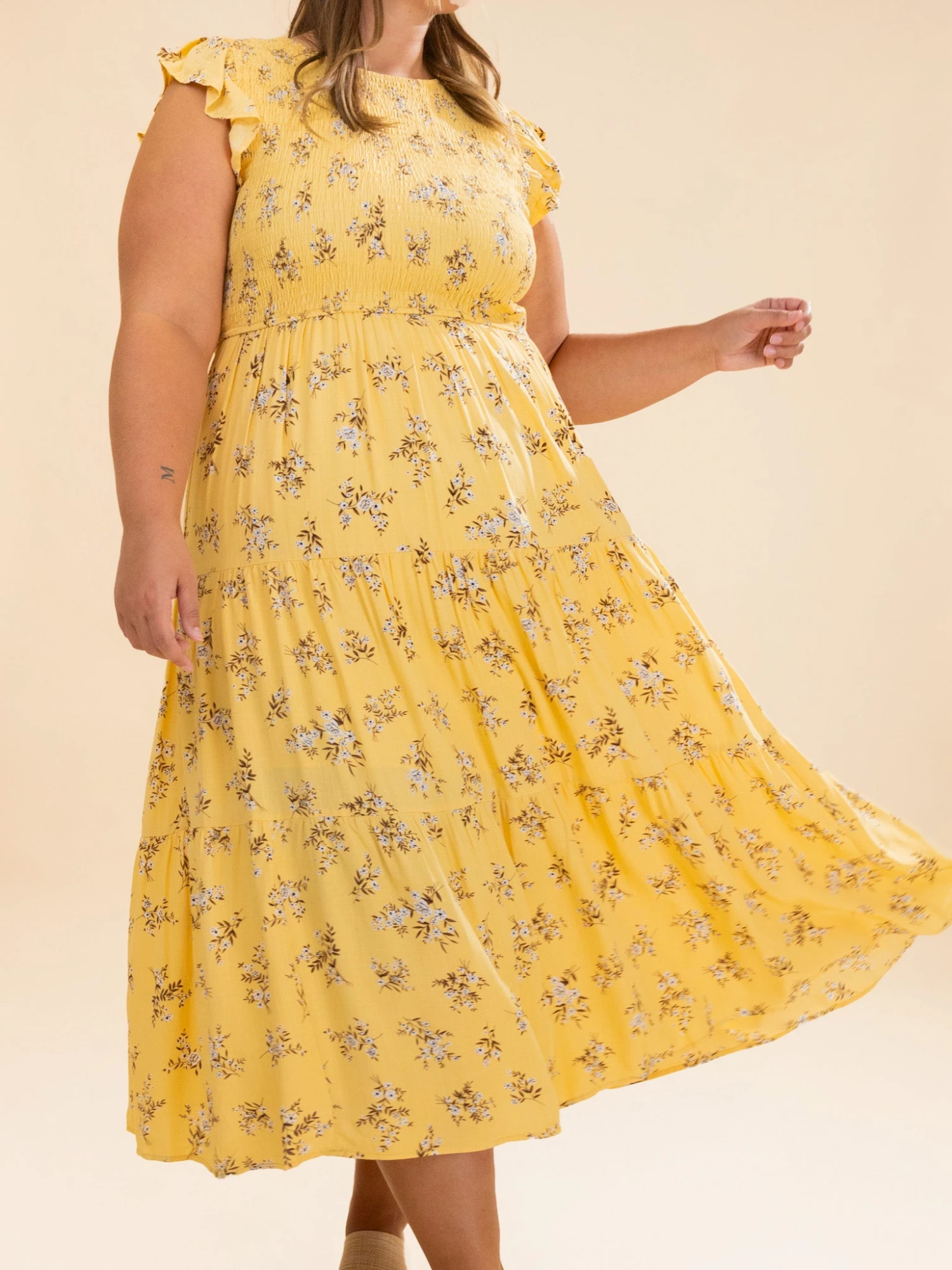 Features: Round Neck, Flutter Sleeve, Smocked Body, Button Keyhole Back, Floral Printed Dress