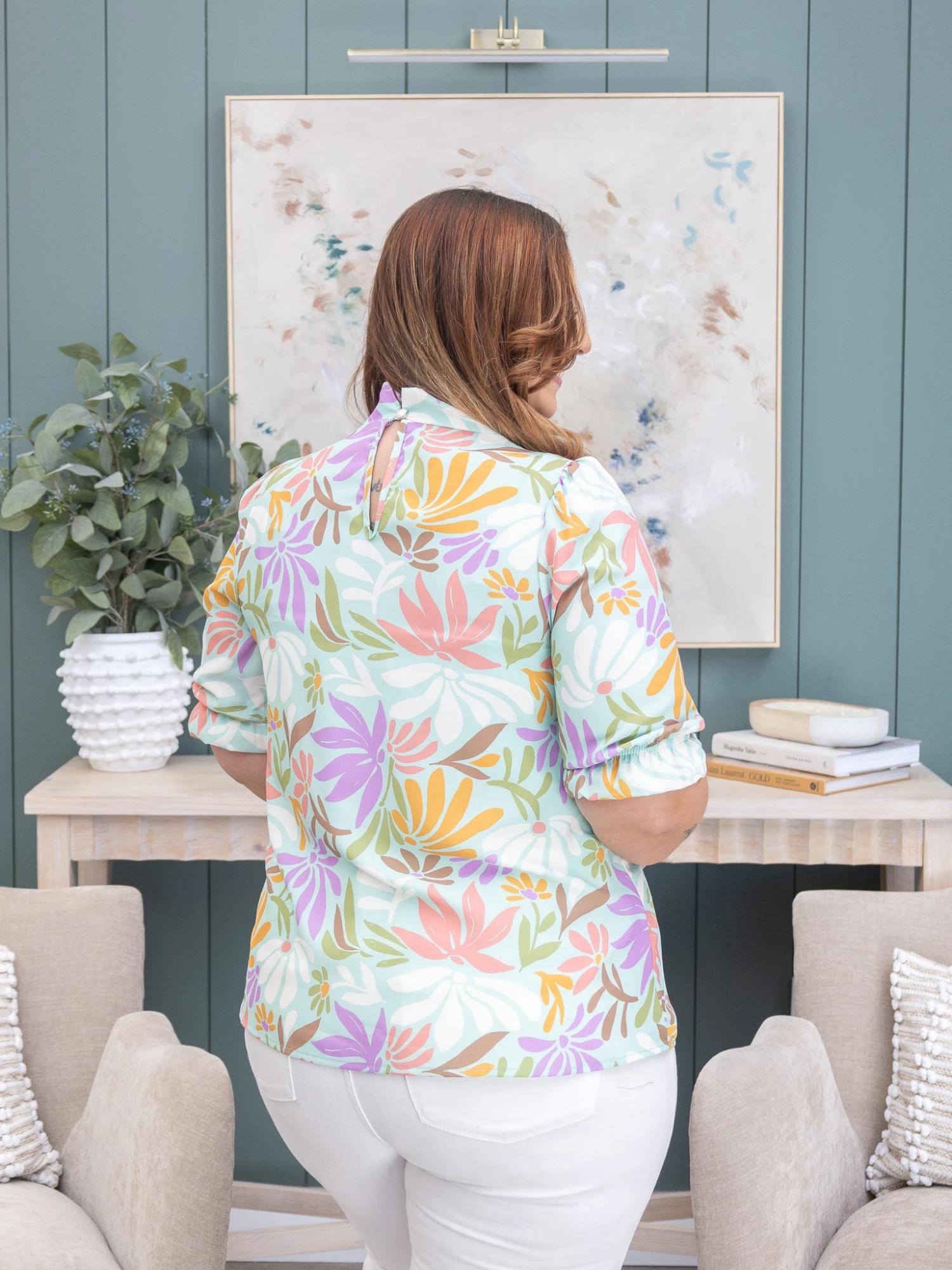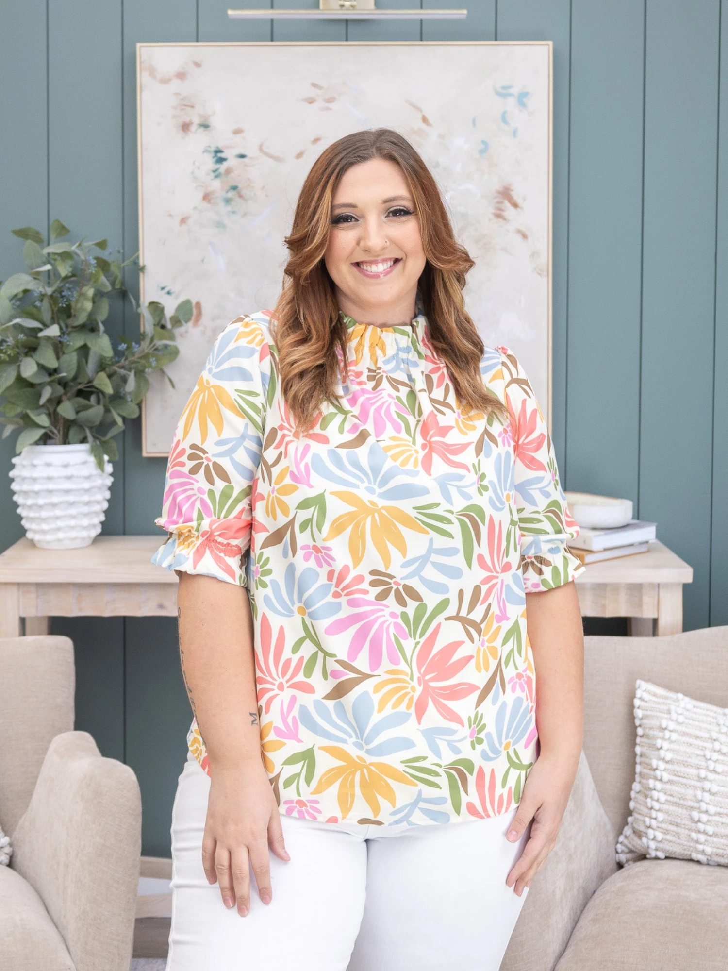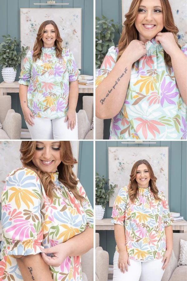 Features: Short Puff Sleeves, Ruffle Neckline, Floral Print