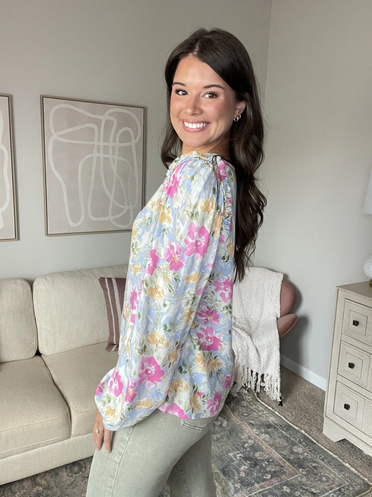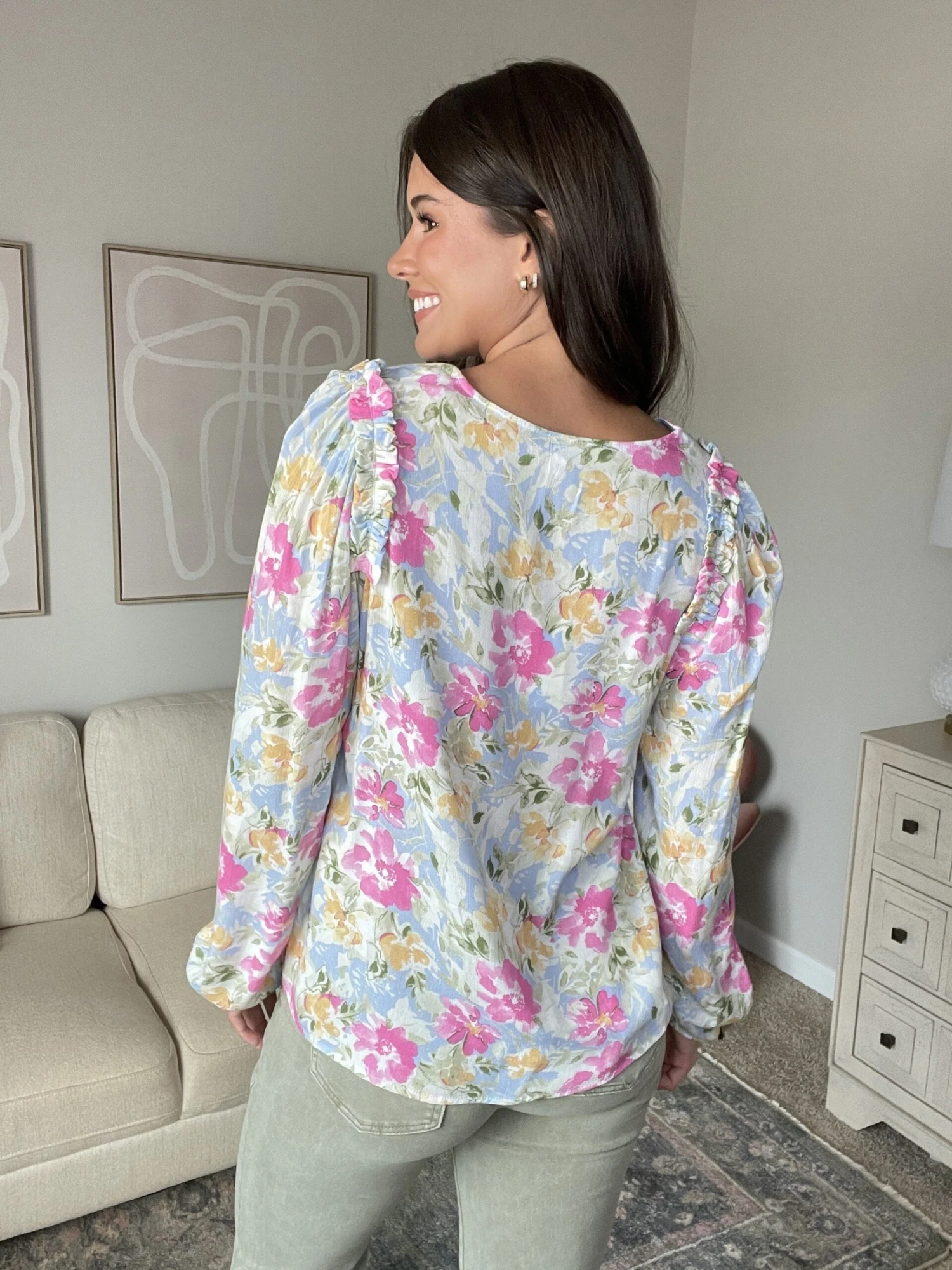Features: floral print, long sleeve, v neck
