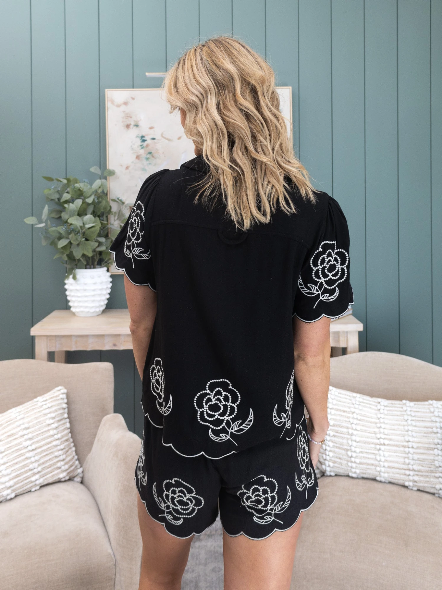 Features: Flower Border, Embroidery, Scalloped Hem, Shorts
