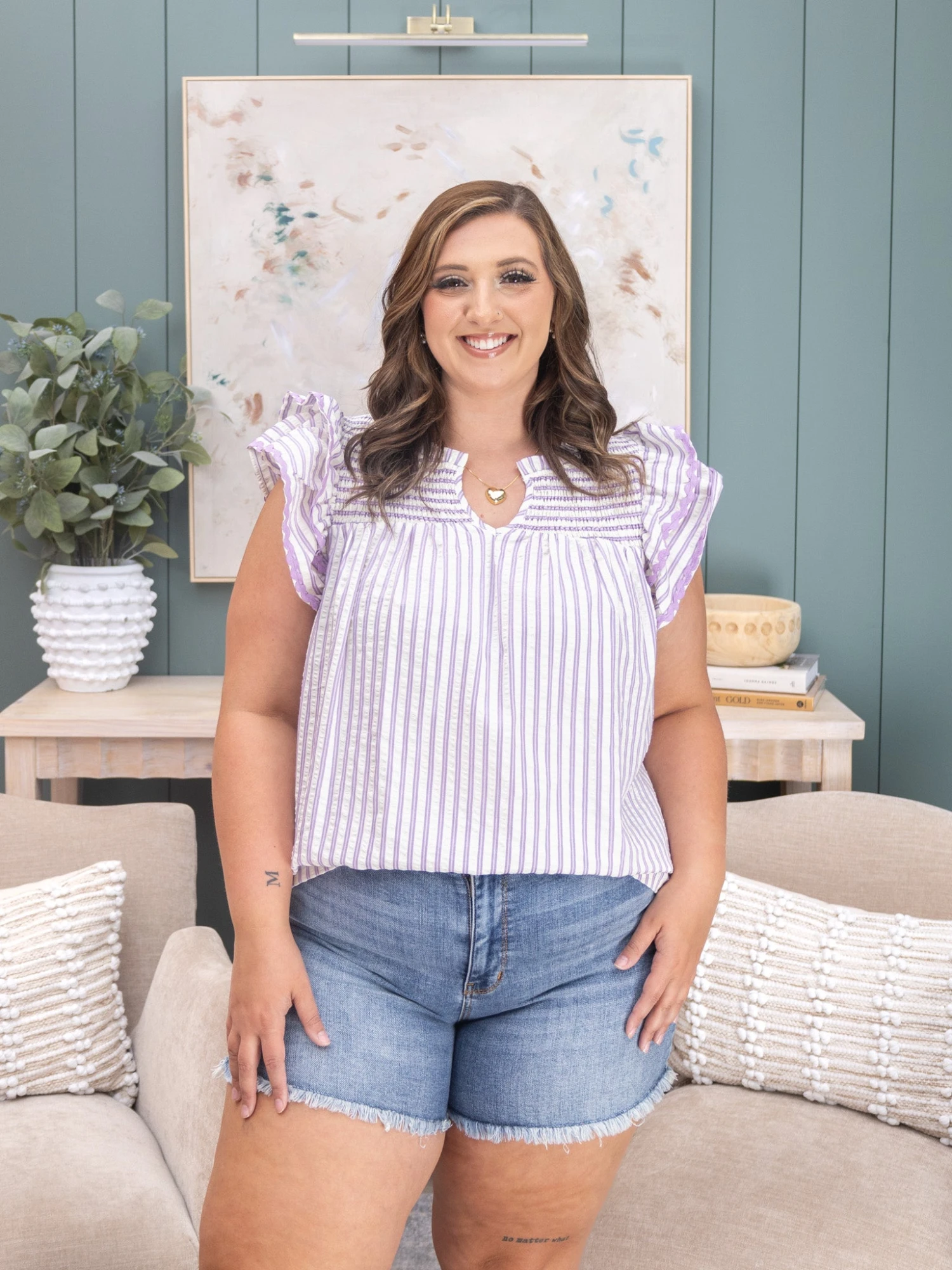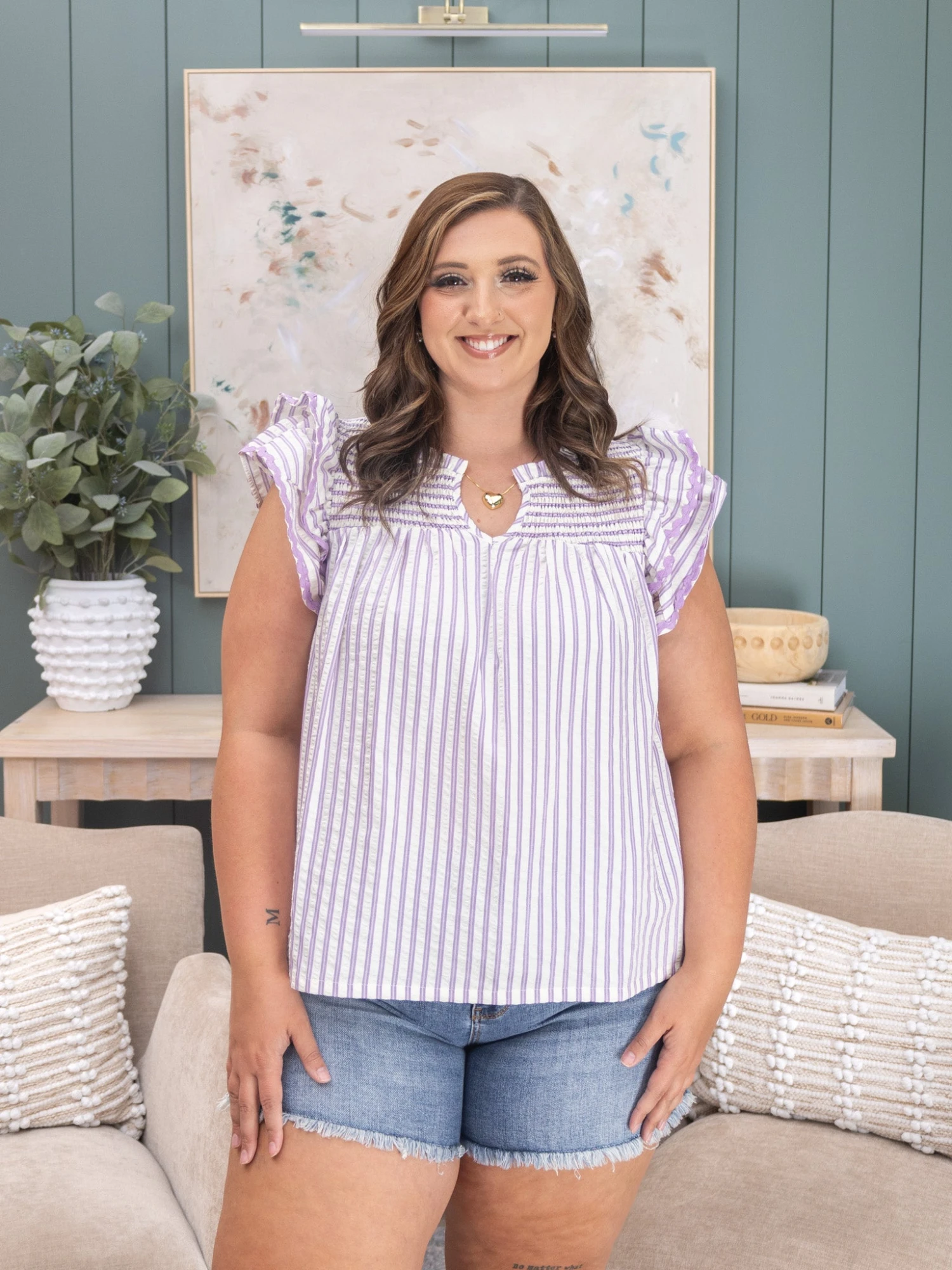 Features: Split Neck, Flutter Sleeves, Striped