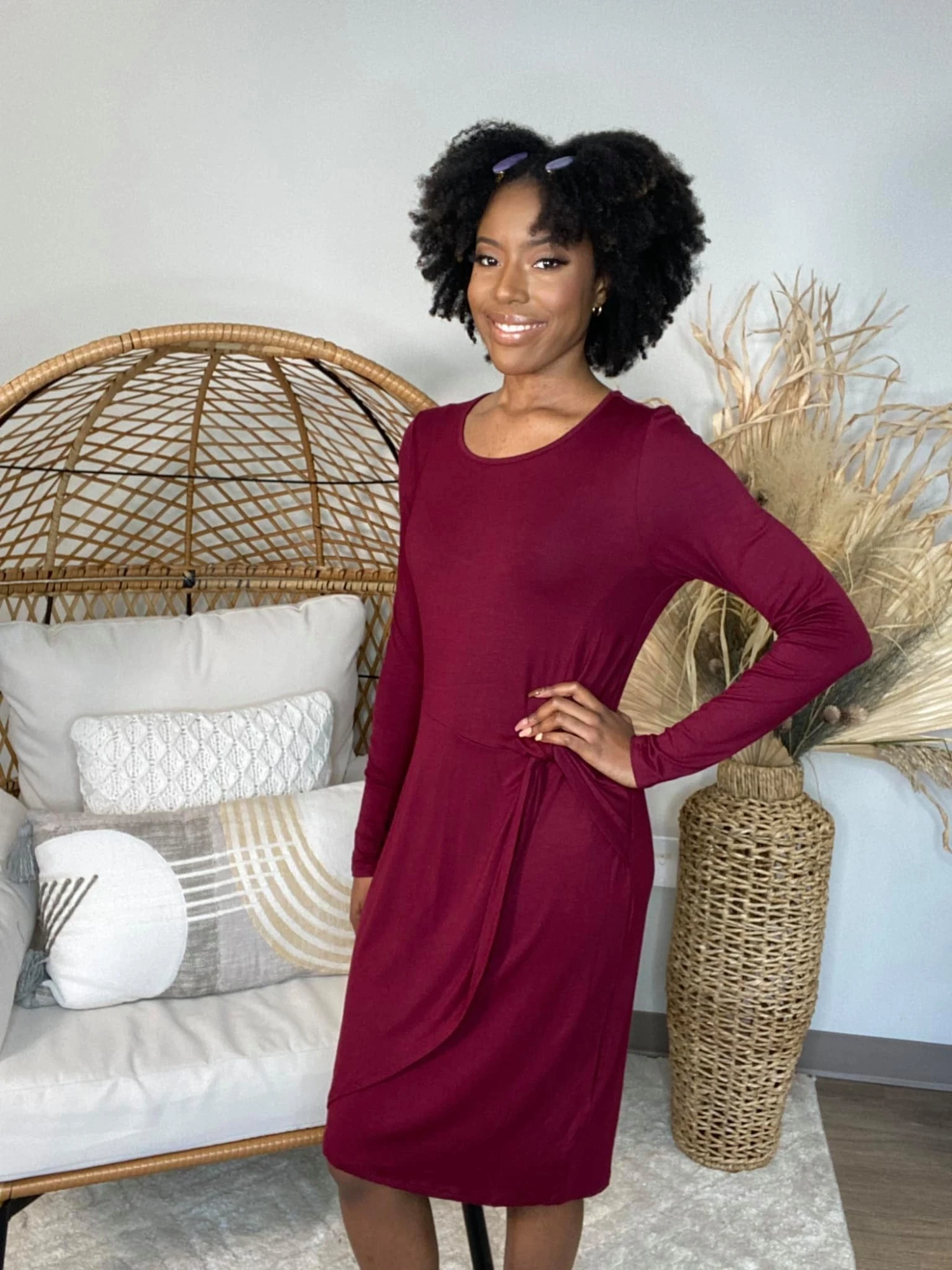 Features: solid print, long sleeve, side knot detail, round neck