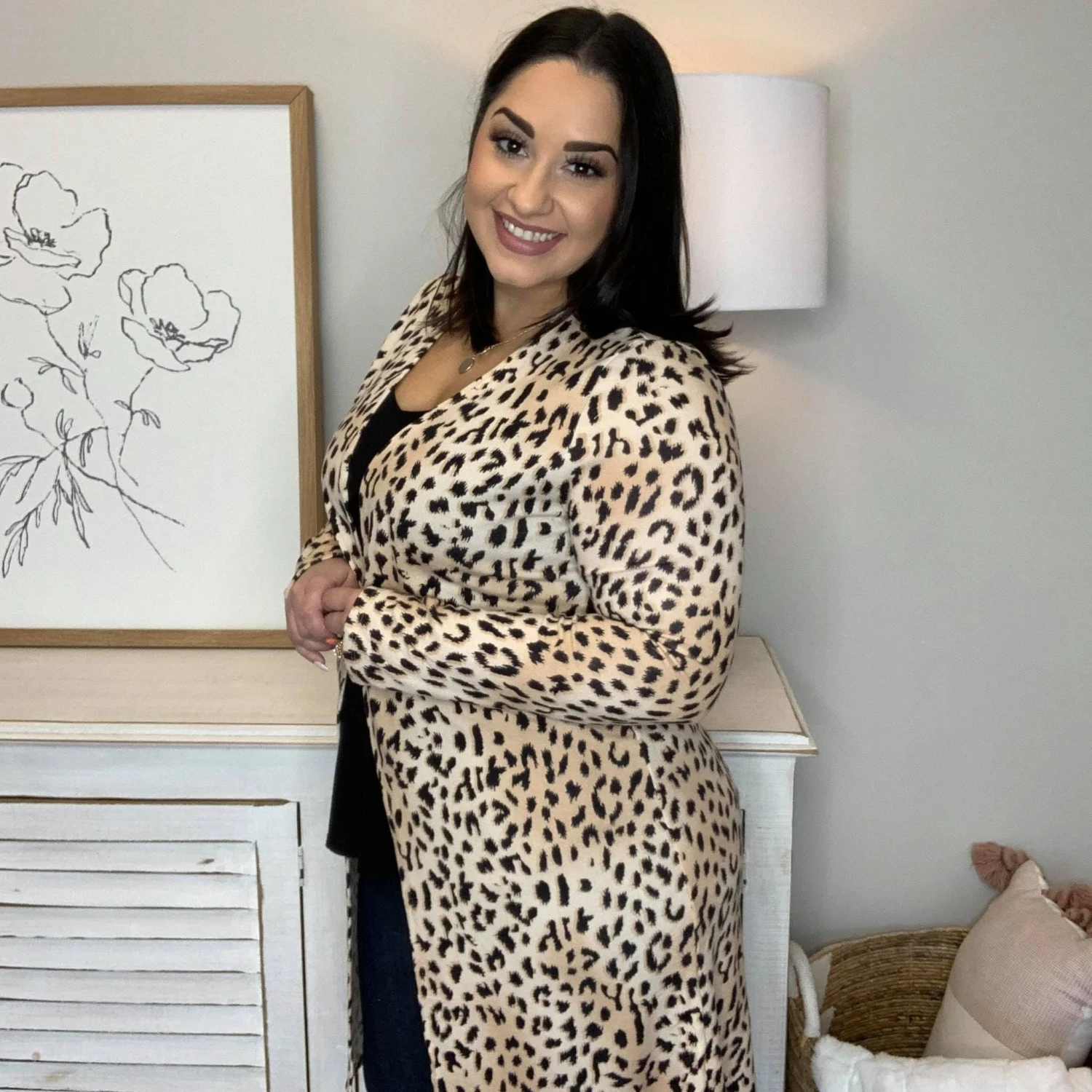 Features: Open front, long sleeve, animal print