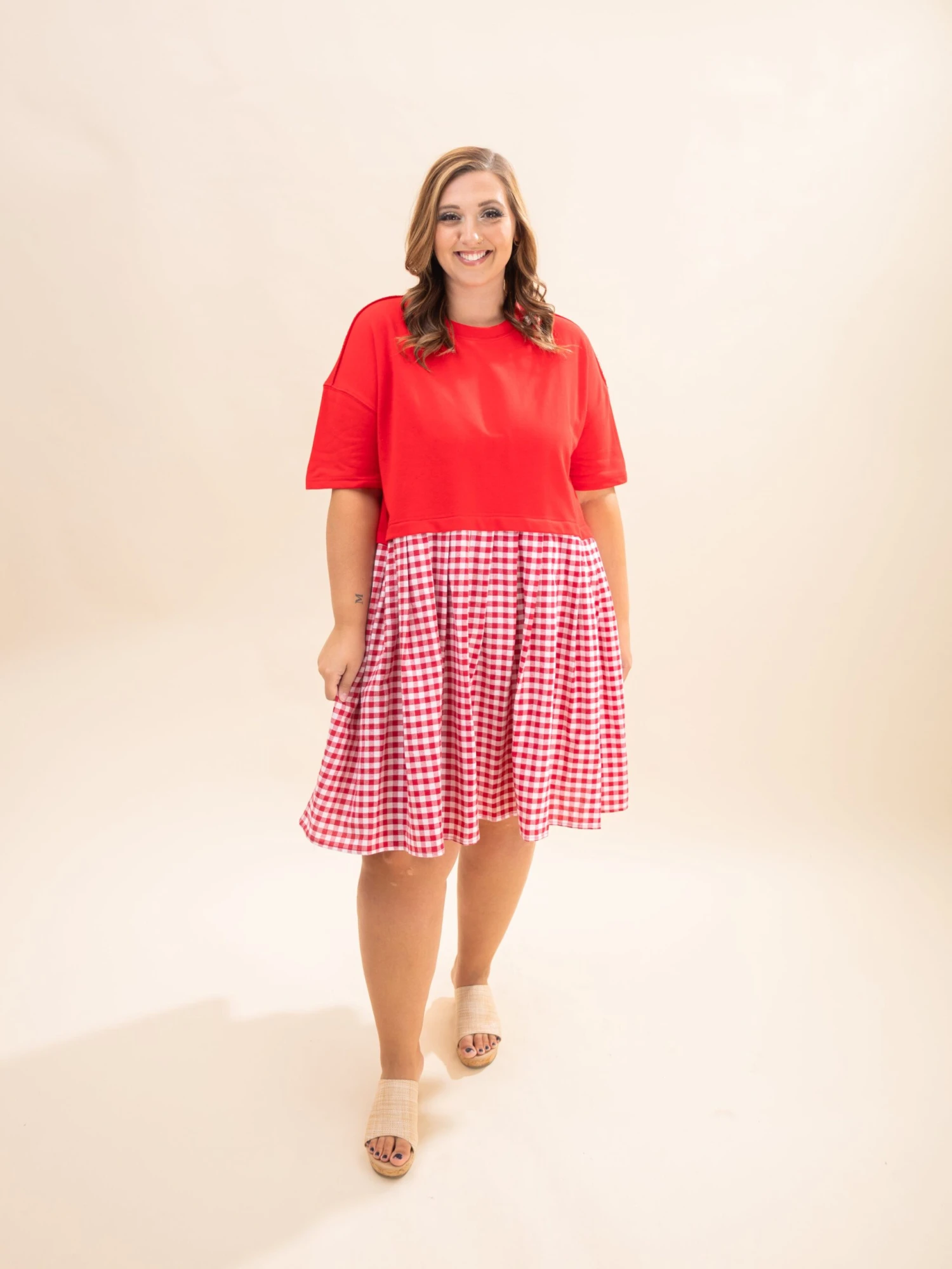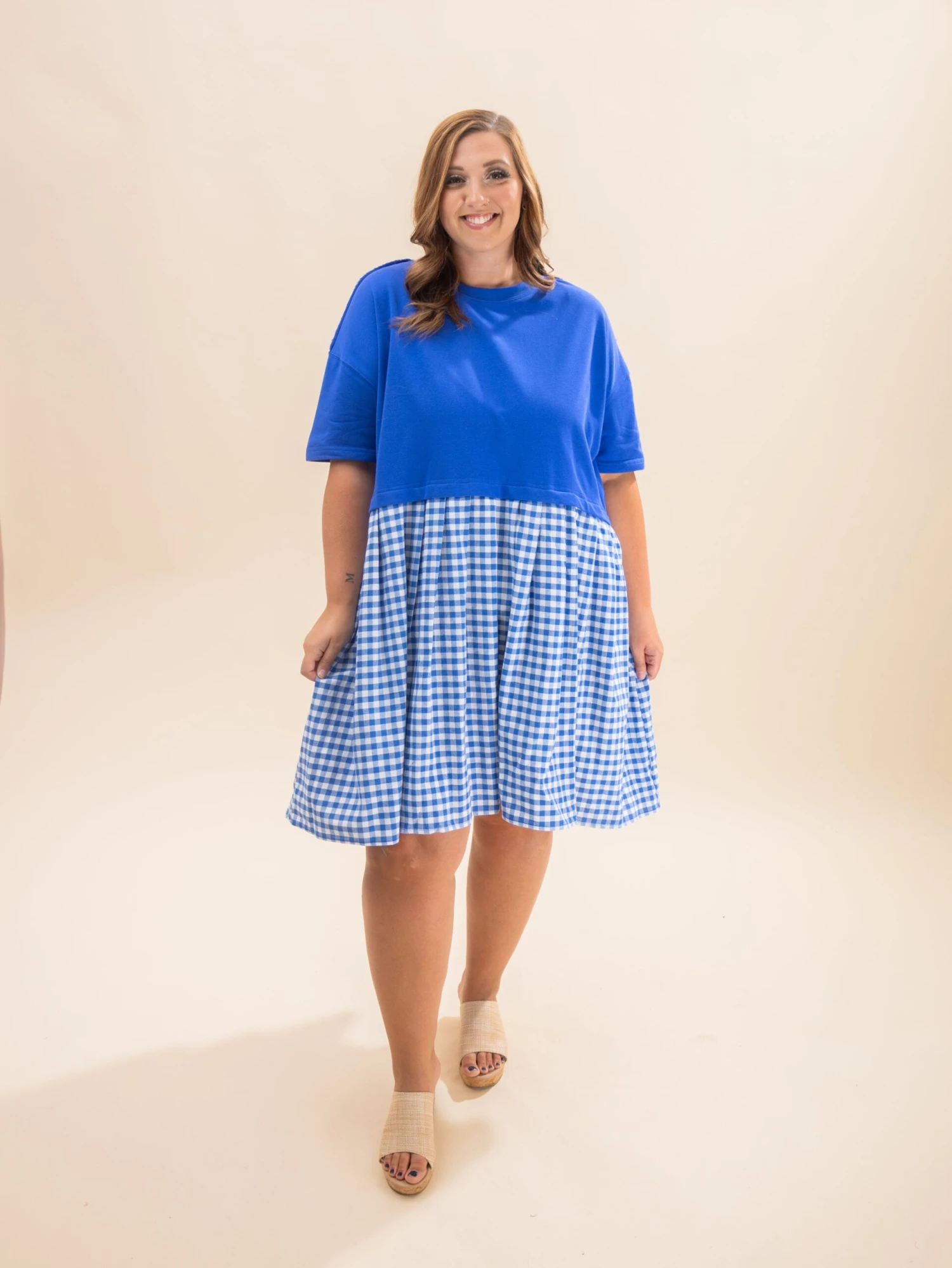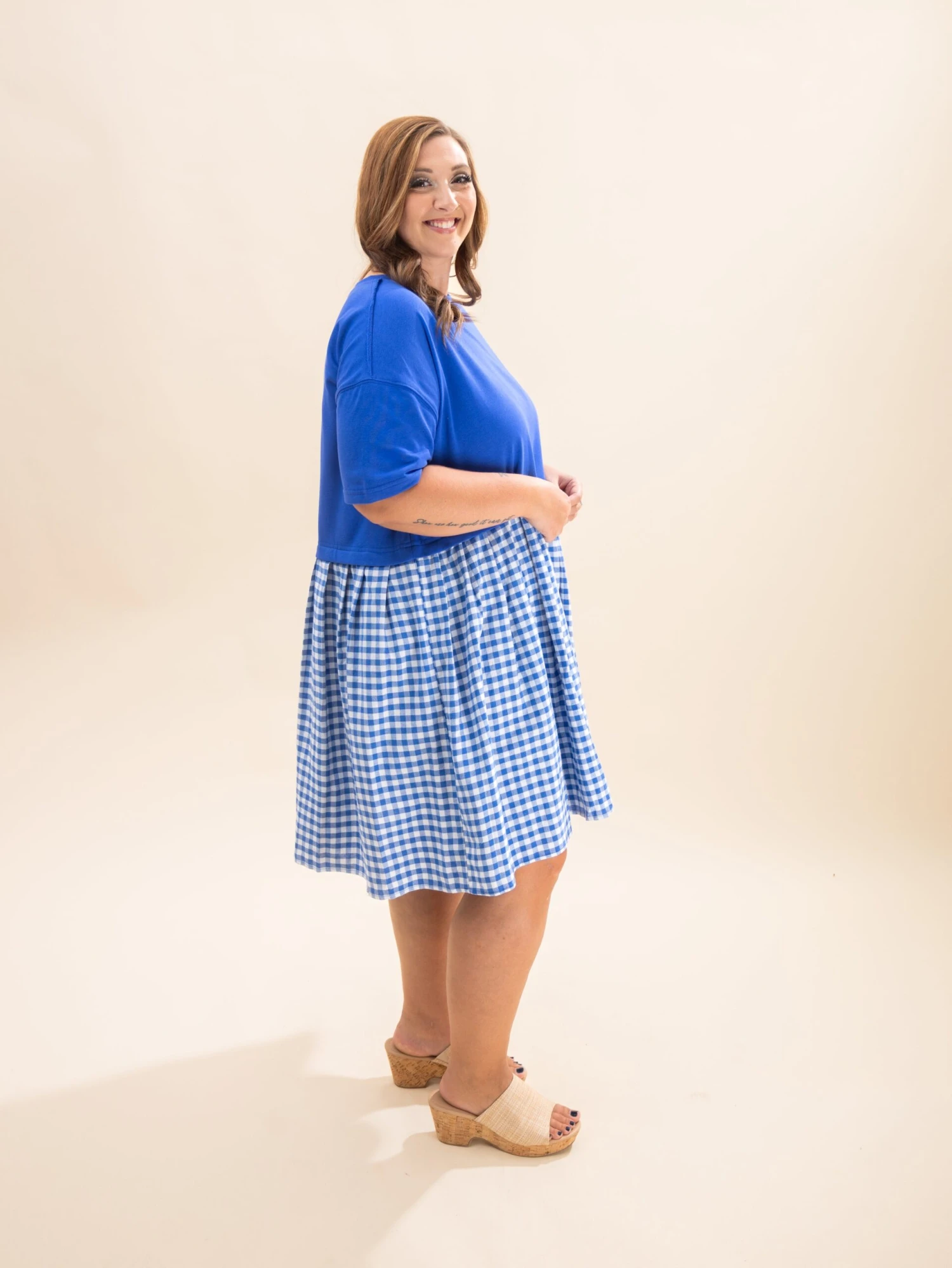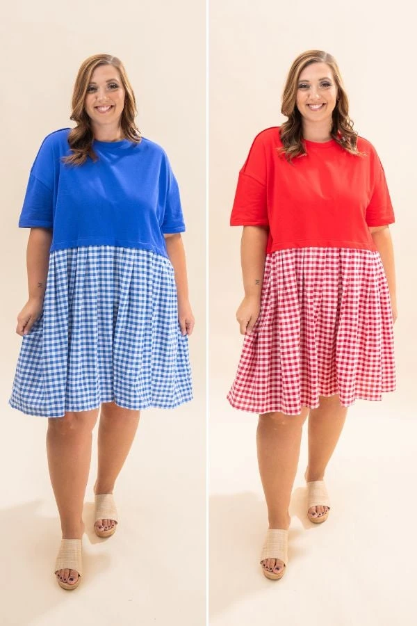 Features: Round Neck, Short Sleeves, No Pockets, Solid French Terry Body & Checkered Bottom Dress