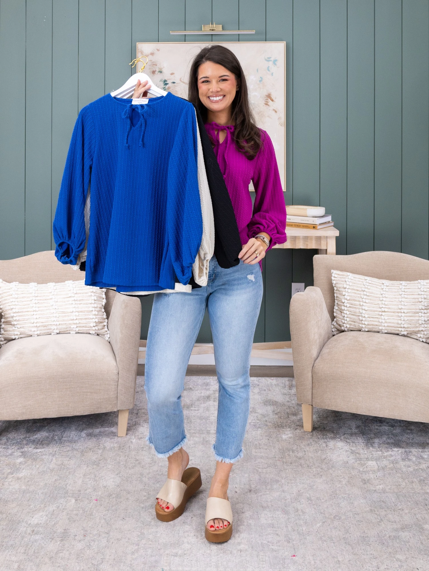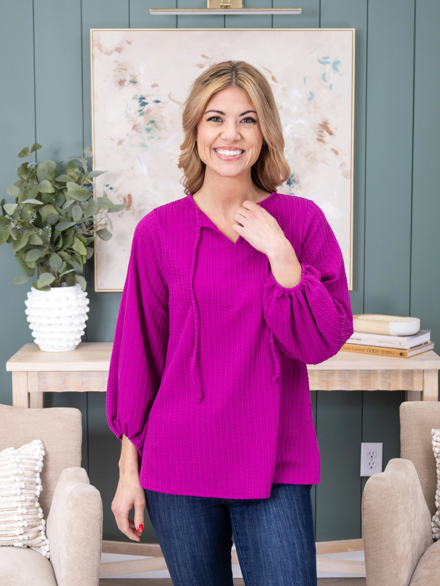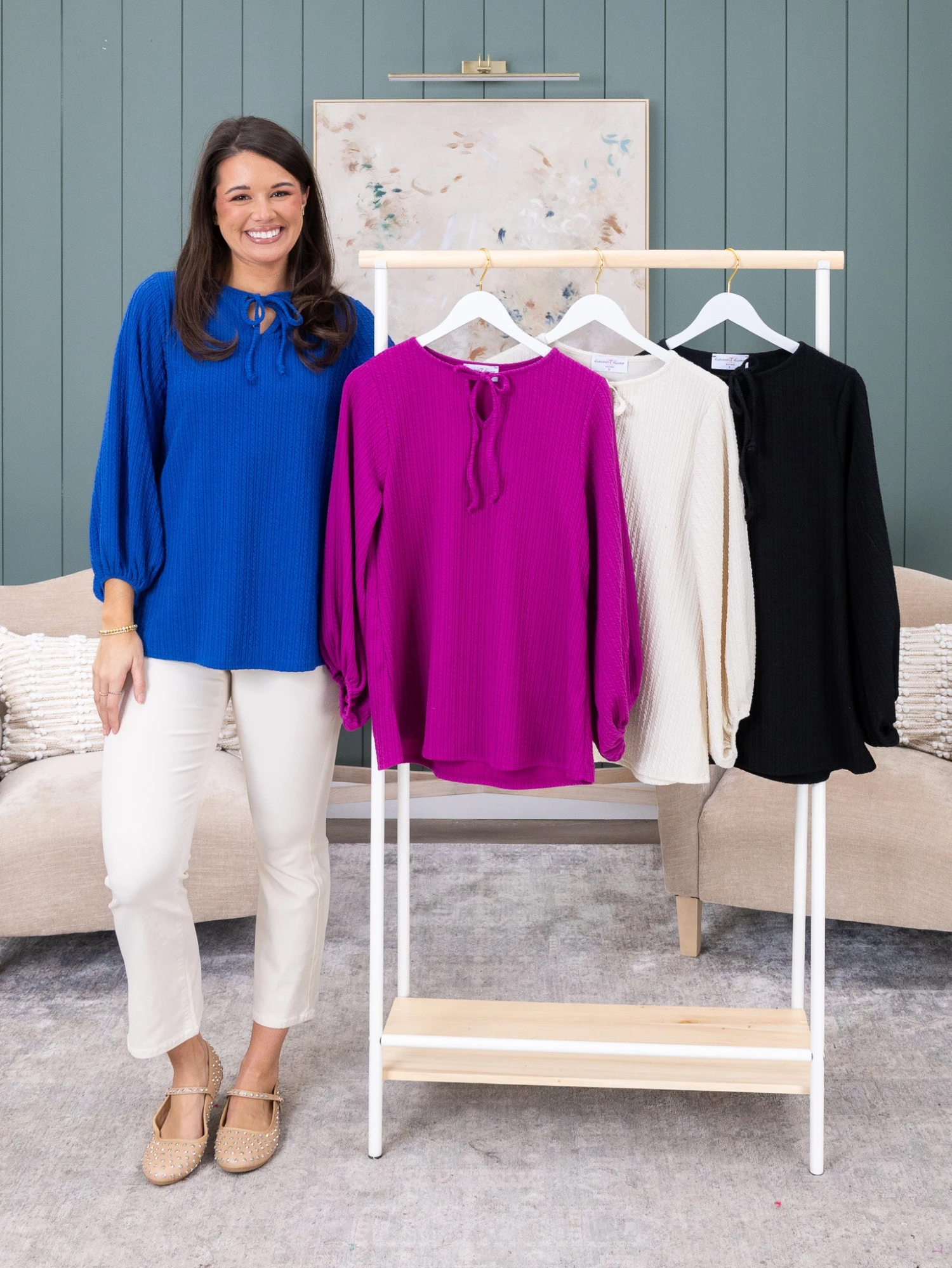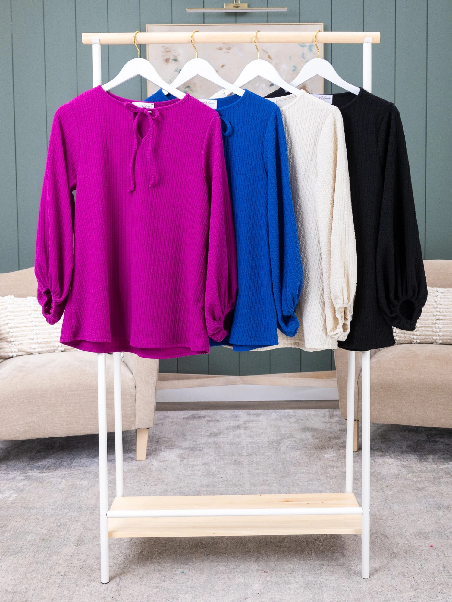 Features: Long Balloon Sleeves, Tied Neck, Ribbed