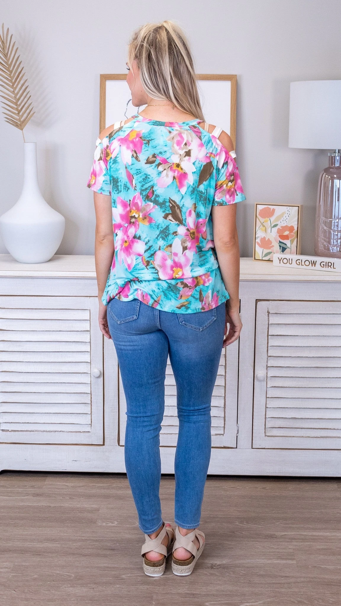 Hey ladies! You should check out the Good Intentions Top! This one is a vibrant floral print that features a could shoulder and round neck detail. Snag one while its available!