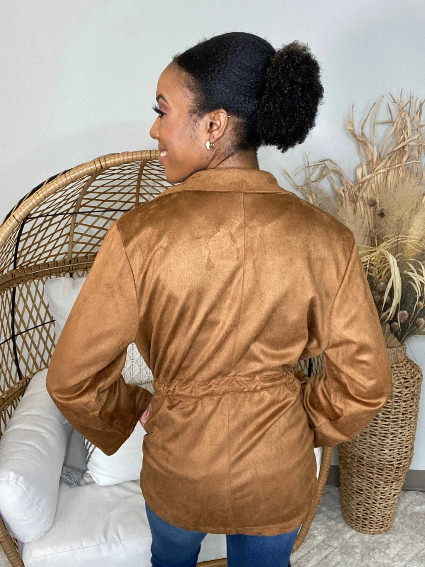 Features: faux suede solid print, drawstring belt, open front, collared, hip pockets
