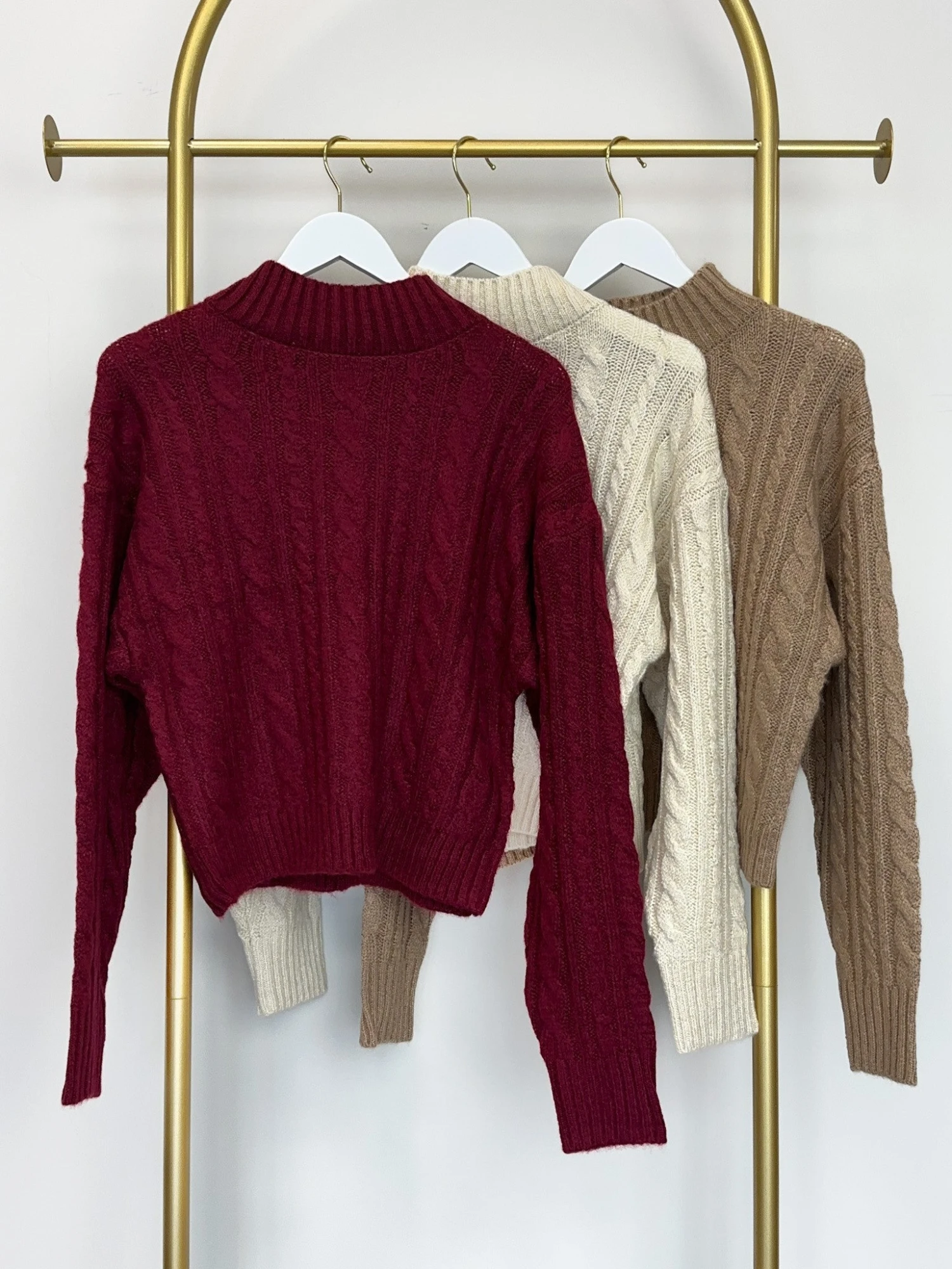 Features: High Neck, Long Sleeves, Cable Knit