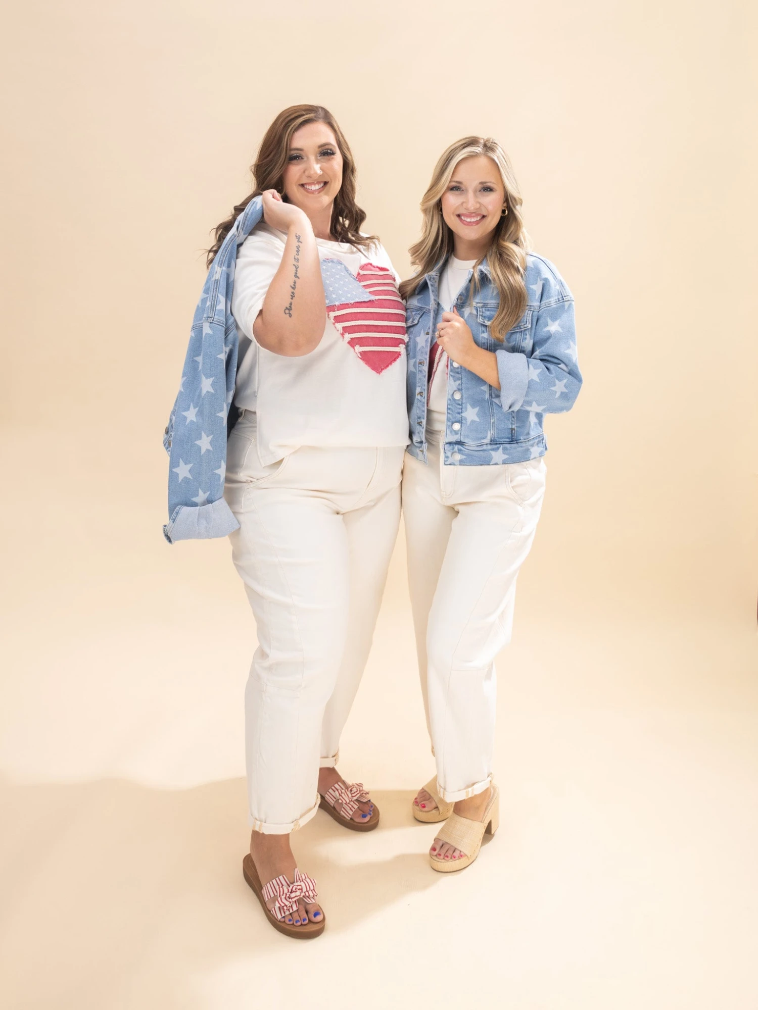 Crimsen (long blonde hair) is 5’1, 34B bra, typically wears size S in tops and 3 in denim. Wearing size S