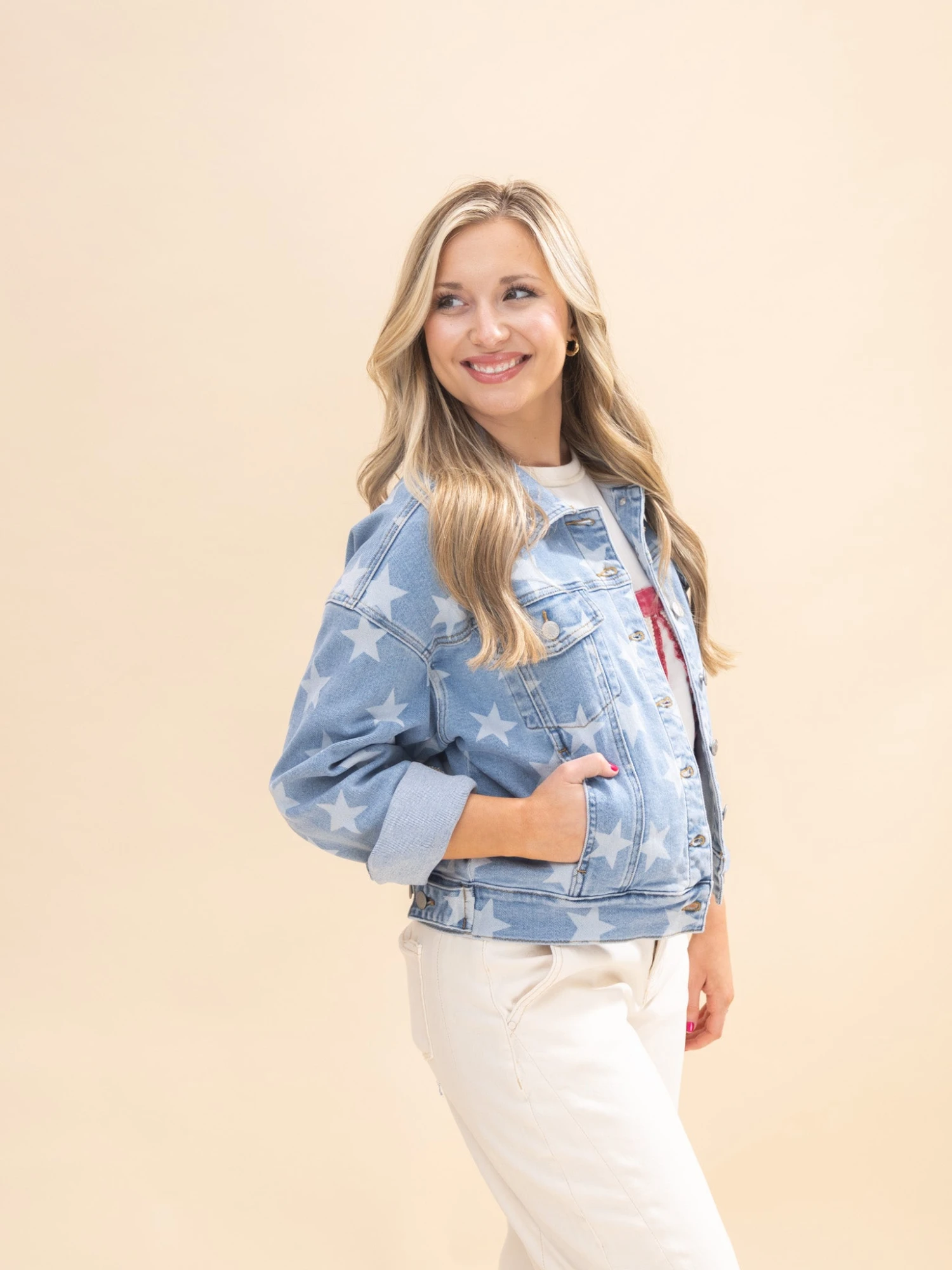Features: Collar, Button Down, Pockets, Short Waisted, Bleached Star Print
