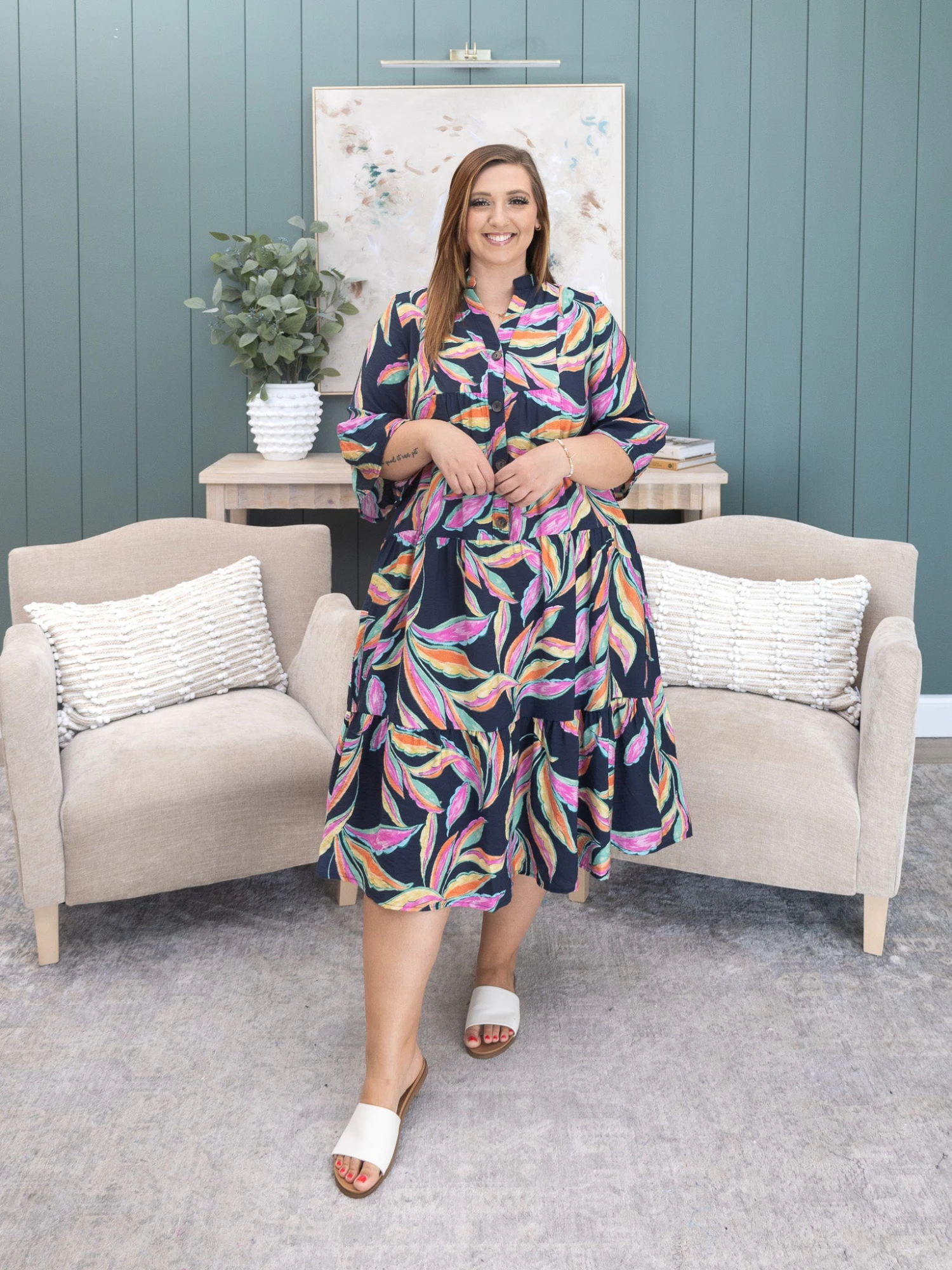 Features: V Neck , Half Button Down, Pockets, Tiered Midi Dress