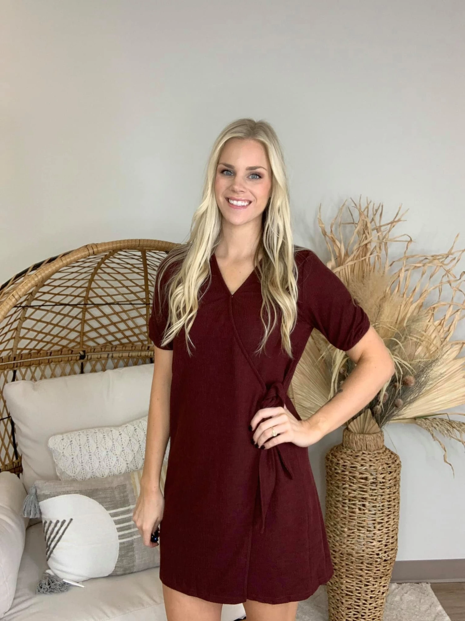 The “Life Out There Dress” has arrived! This super cute dress is a must-have for everyone’s closet! The v-neck, wrap tie, with the gathered sleeves is so flattering! Perfect for all seasons! You can never have to many solid print dresses to be sure to snag one while you can!