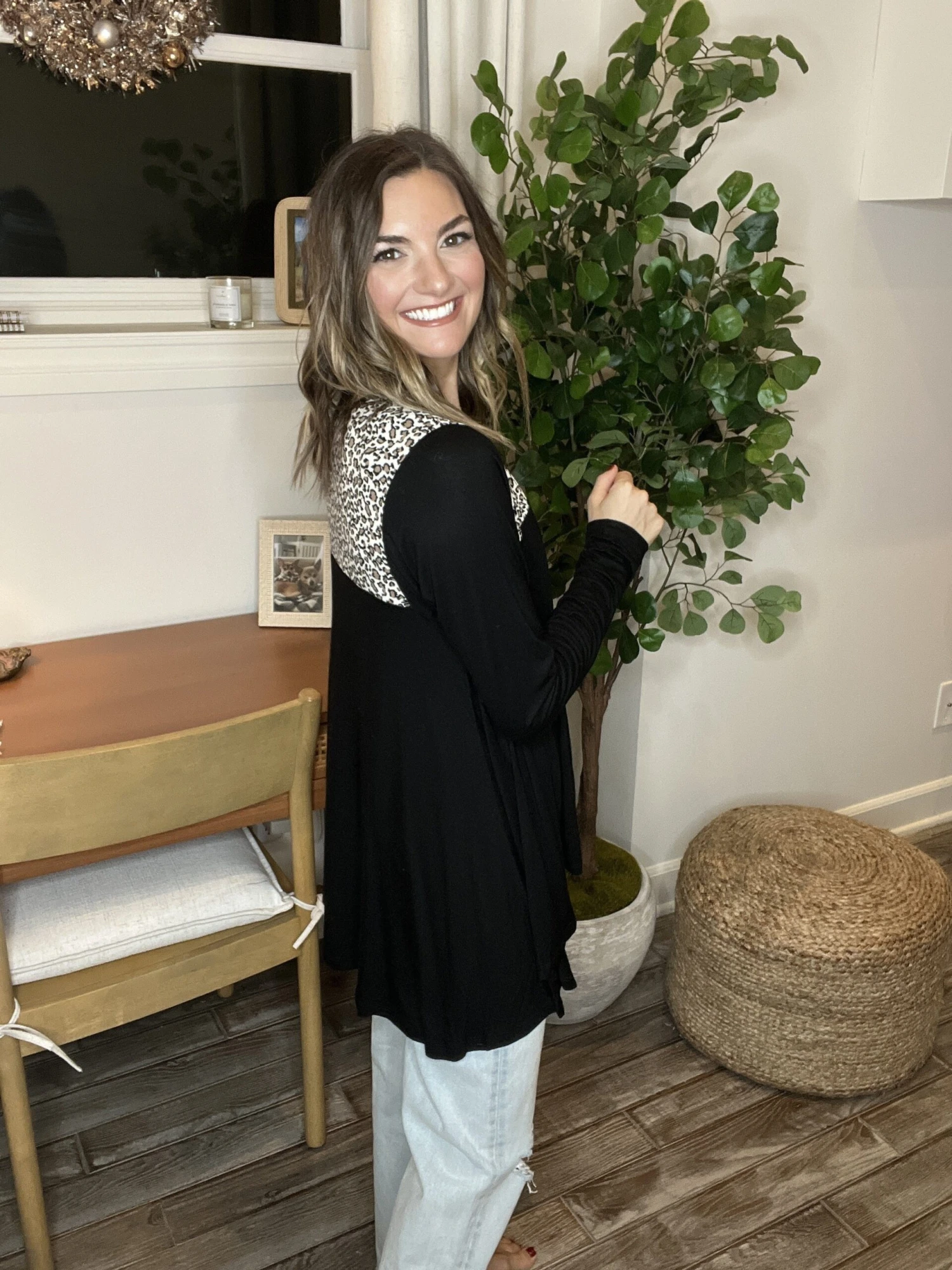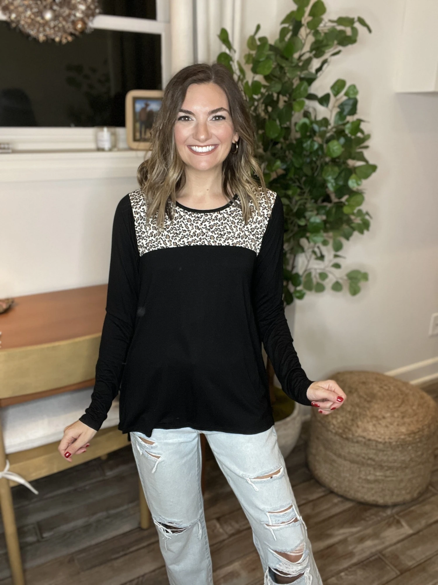 Features: Long Sleeve, High Low Hem, Animal print detail